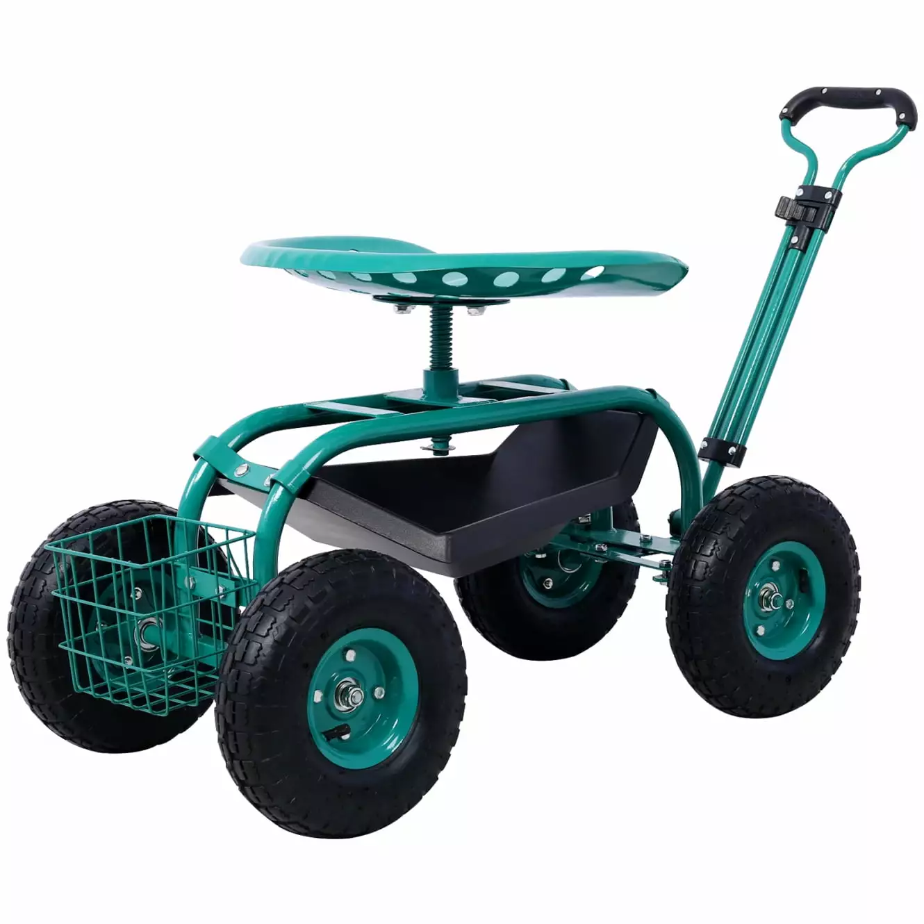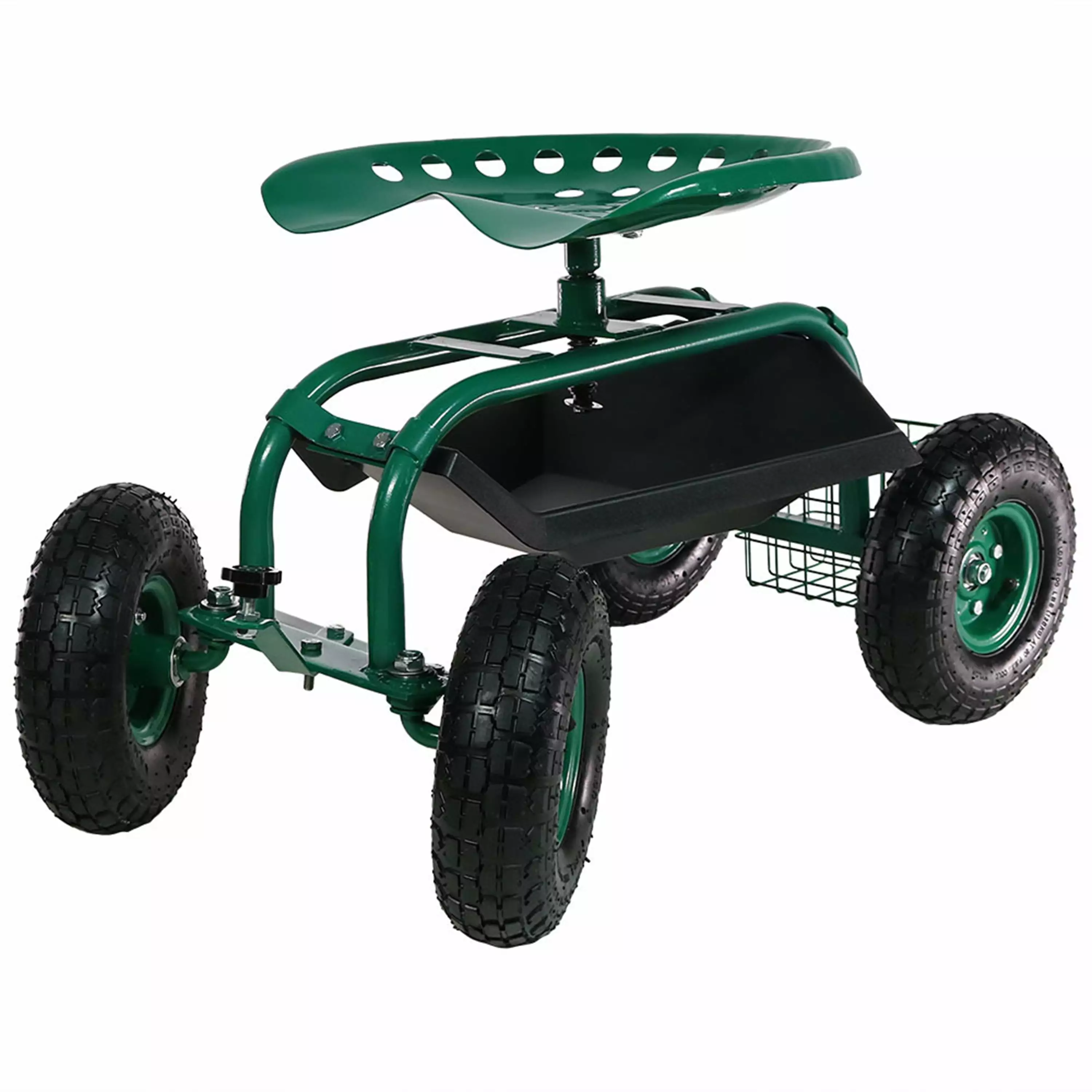 Garden Cart with Height Adjustable Swivel Seat. Rolling Gardening Work Seat with Tool Tray and Binquireet for Planting Outdoor Patio Lawn Yard. Weight Limit 300LBS. Green