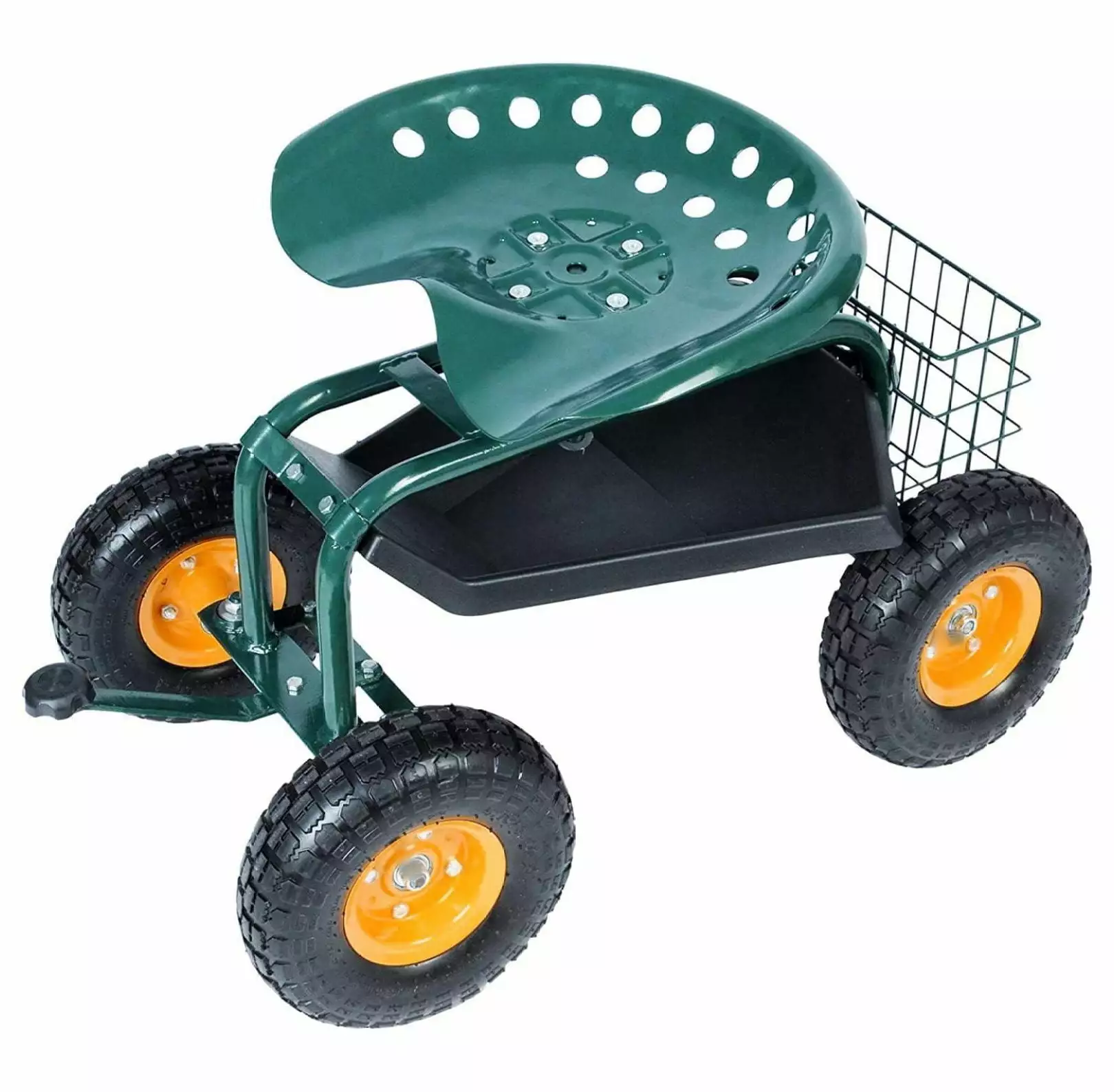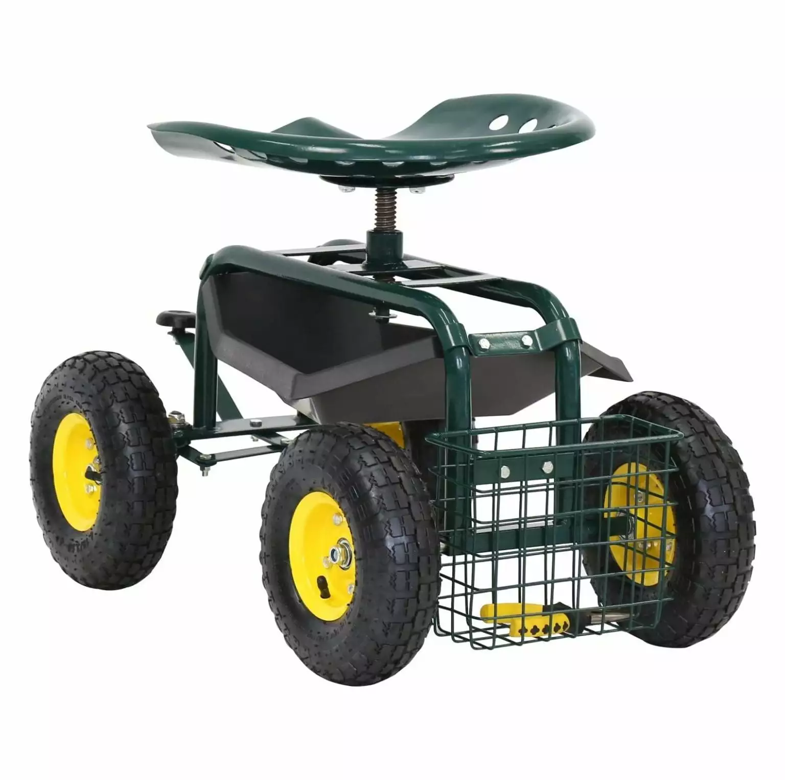 Steerable Rolling Work Seat Garden Stool Cart with Tool Tray and Storage Binquireet Heavy Duty Scooter Green