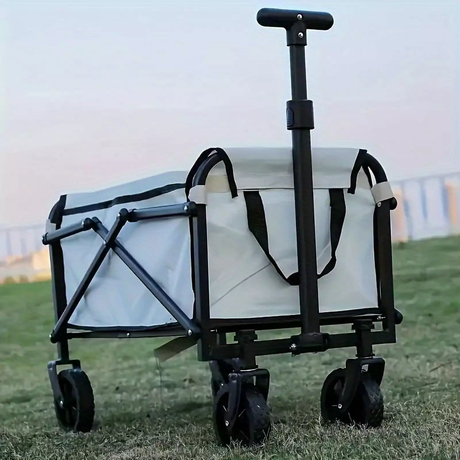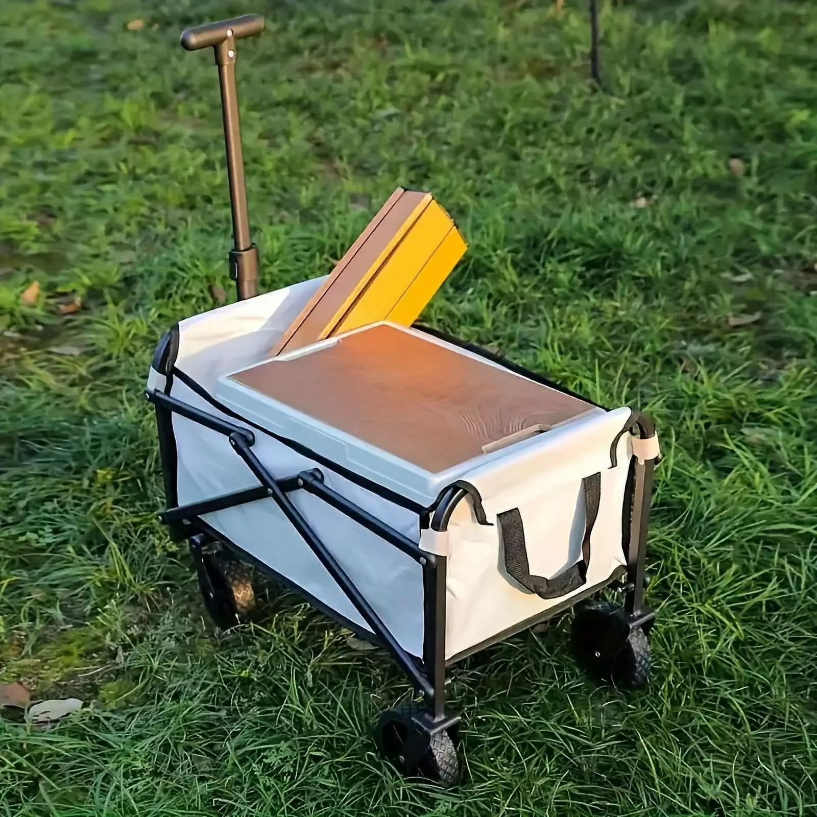 Outdoor Folding Trolley Cart with Wheels. Camping Foldable Wagon with Adjustable Handles. Featherweight Shopping Cart with Steel Frame. Beige