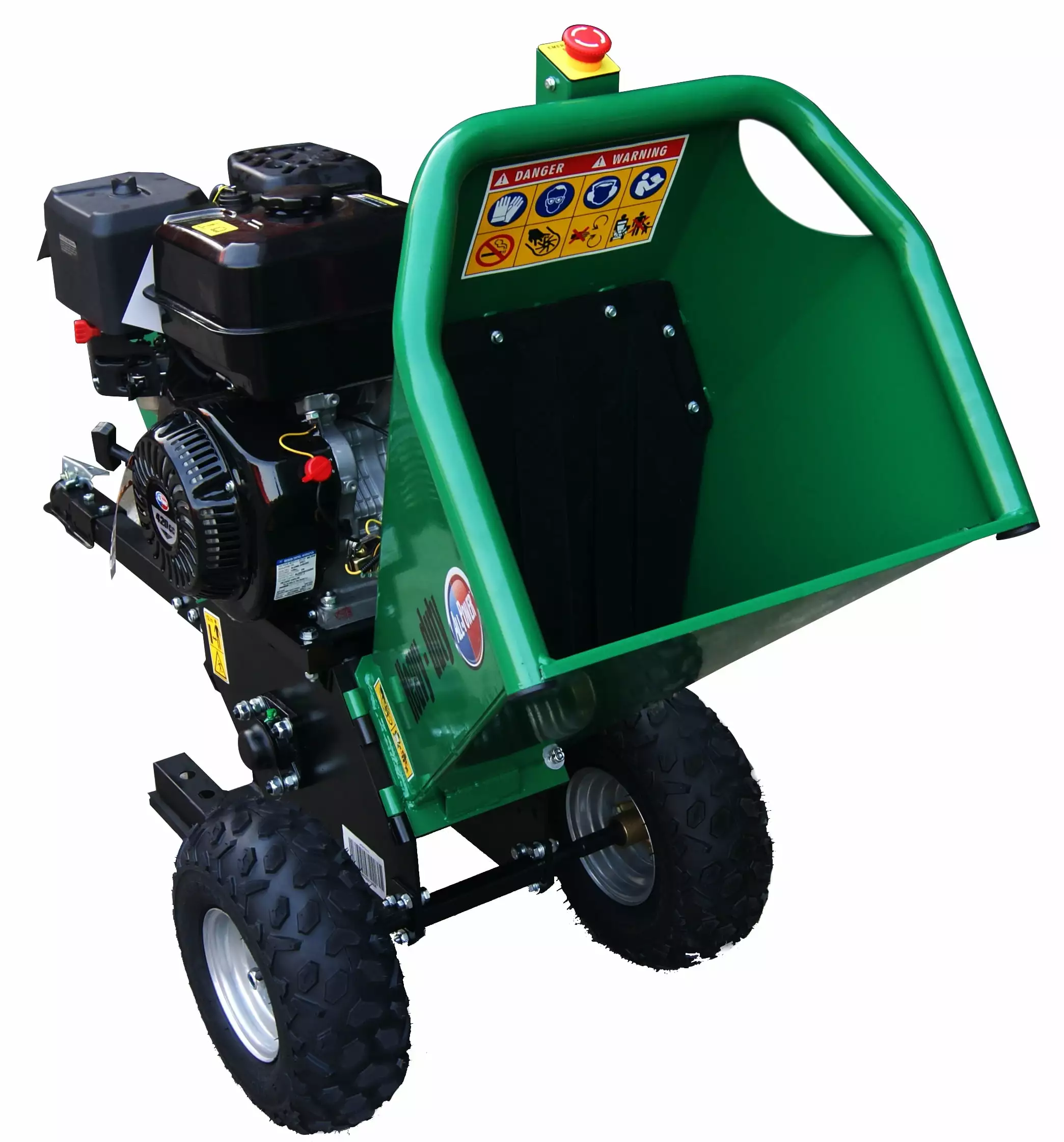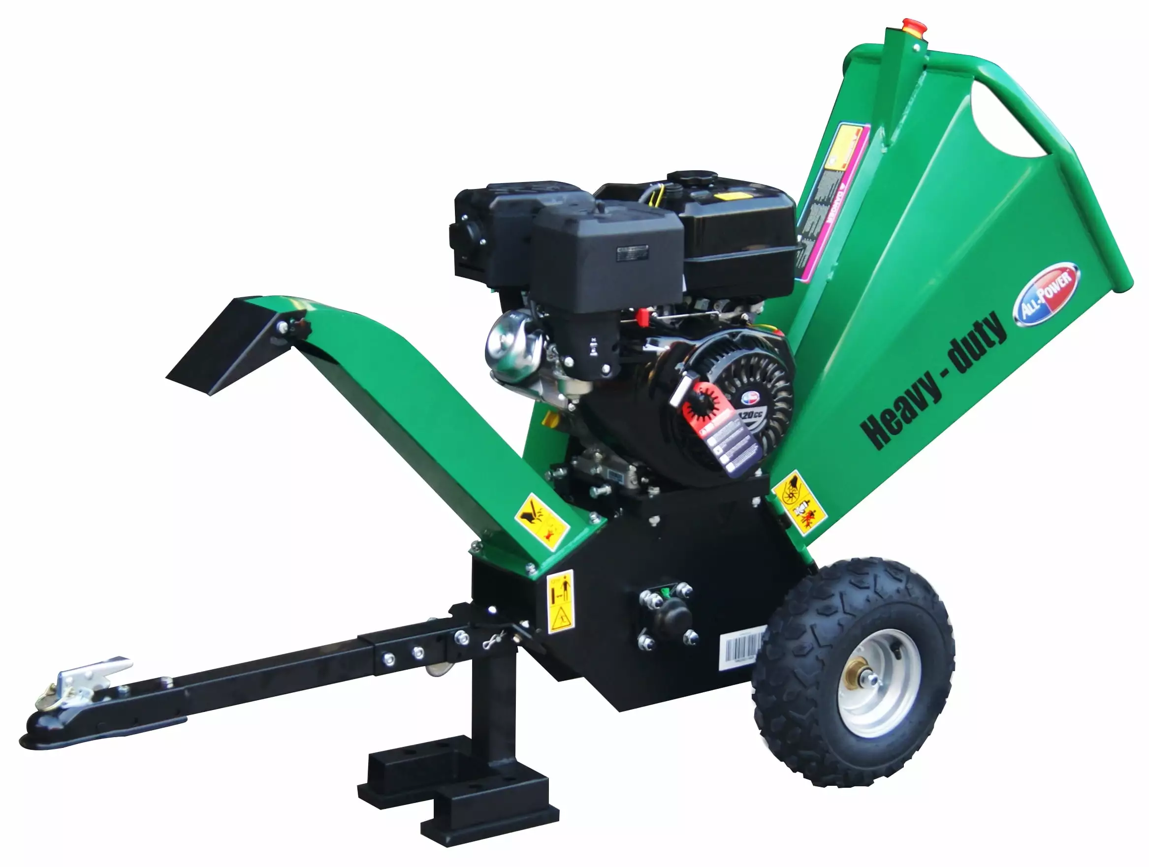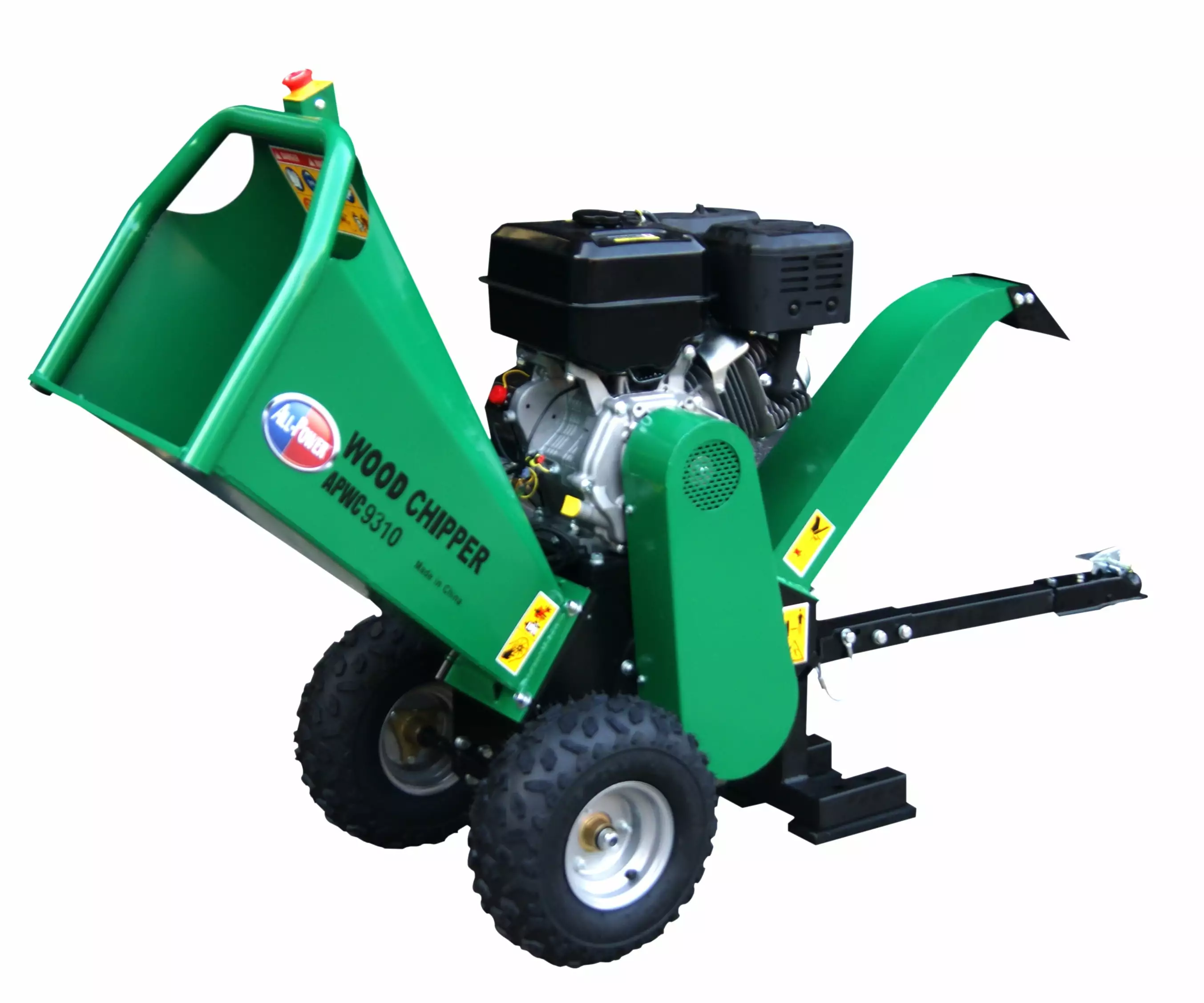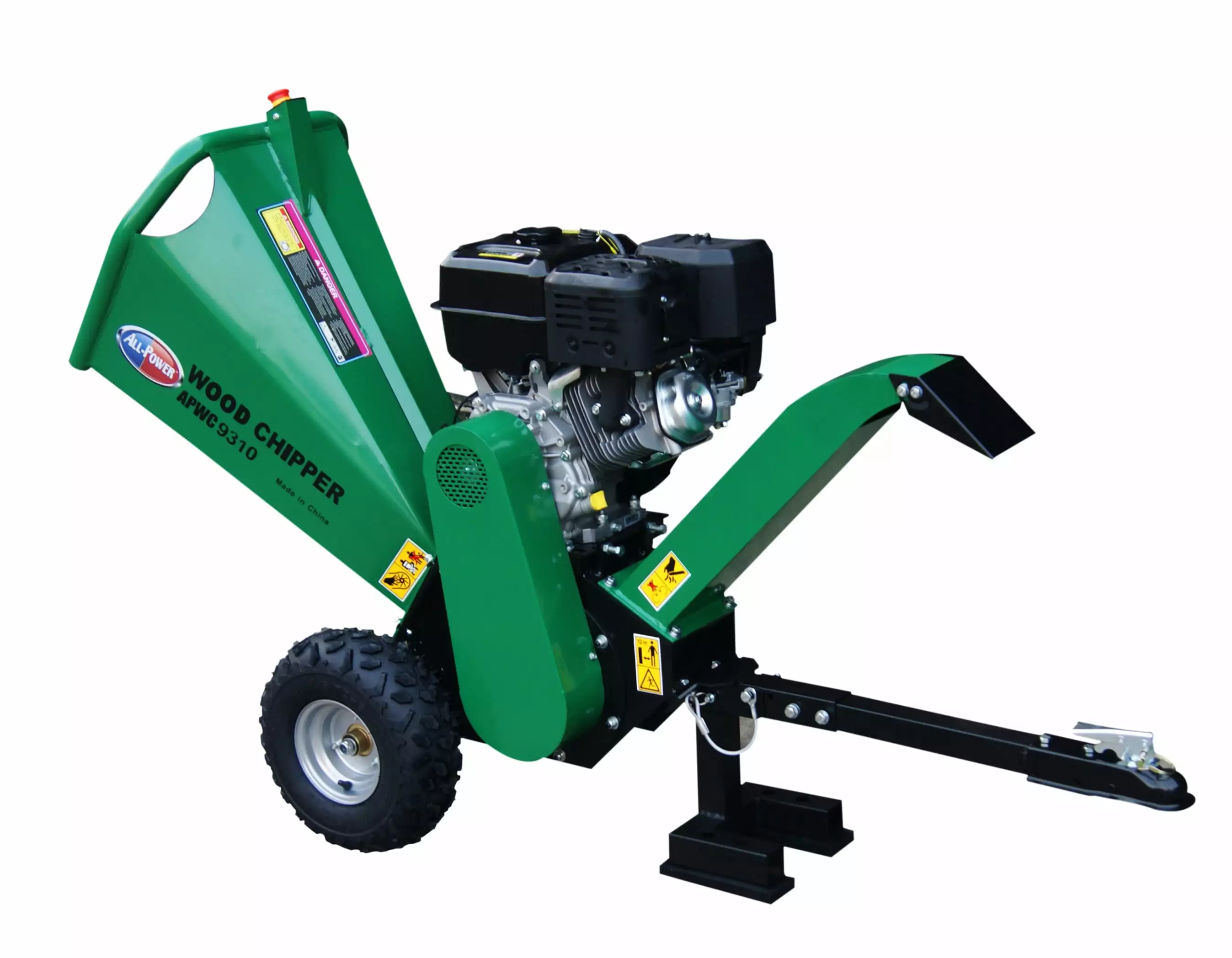 The All Power APWC9310 is a powerful sturdy wood chipper designed to last. The motor has a generous 15 HP to ensure your cutting needs with a max cutting speed of 2.200rpm. The tire’s are 16" with a wheelbase of 25". The cutting blades use a dual reversible double edge blades which provides longer blade life. with a cutting tree diameter of 5" and infeed dimensions of 18" X 15". this woodchipper can get your cutting job done with confidence. The expulsion chute is adjustable to 180 degrees up or down.