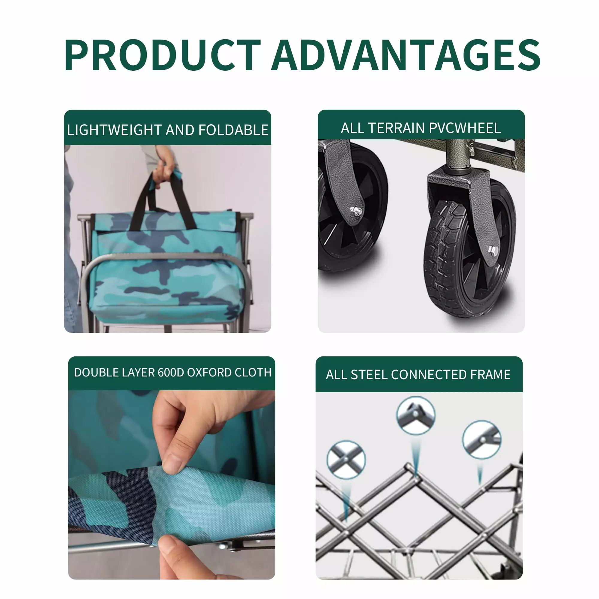 –All terrain foldable wagon: This station wagon can traverses almost any terrain. and you can easily traverses it with its heavy body and rotating wheels.