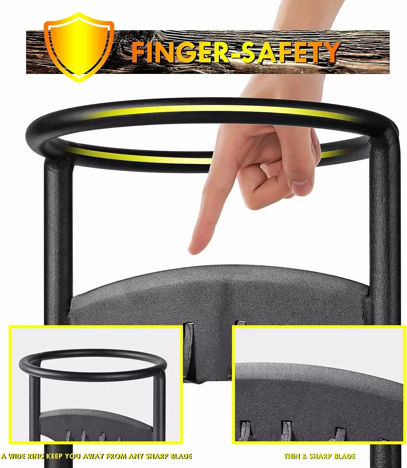 1.??Sturdy and Secure??- The firewood splitter features a top ring to ensure security. no sharp object or moving blade passing by your hands. Just put the log on the blade. and hit down it with a hammer or mallet.