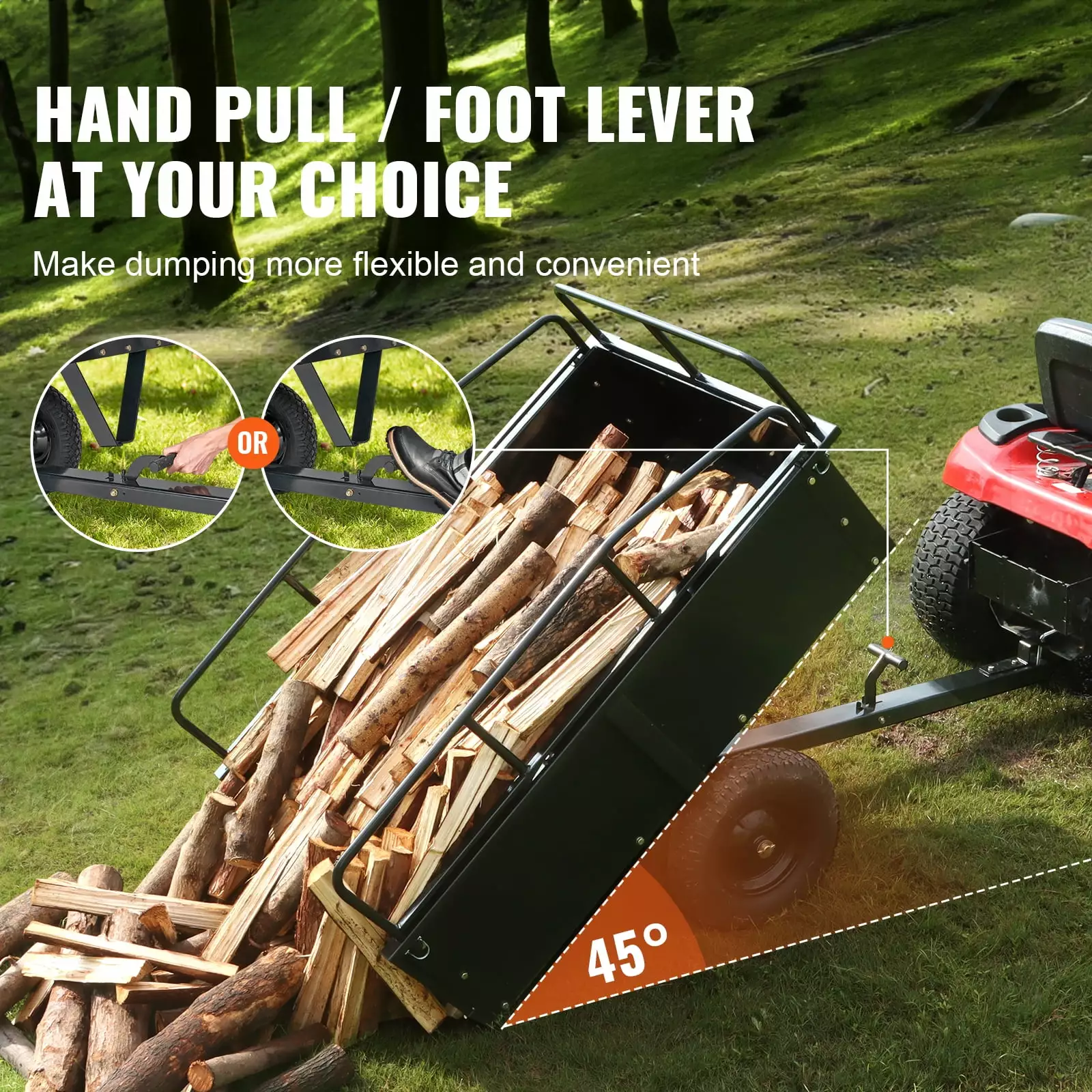 Our dump trailer is crafted to handle heavy-duty tasks with a durable construction. providing you with the ultimate solution for all your garden hauling needs. It has a universal hitching system. effortlessly connecting to various tractors. lawnmowers. and more. Turn your hauling tasks into a simple job. no matter the terrain.