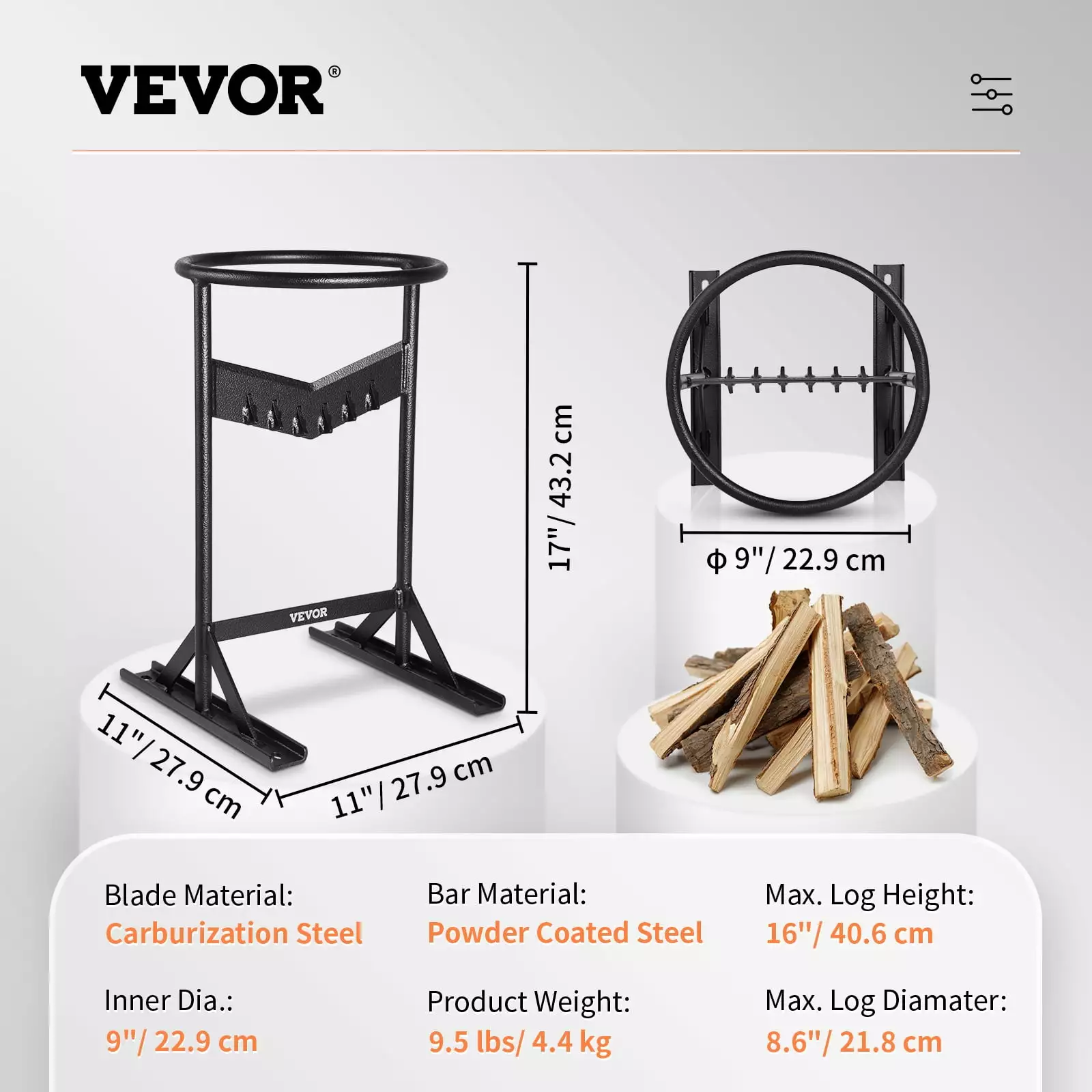 - 9”Wx17”H XL-Size Wood Splitter: With 9’W and 8.6” inner dia. top ring. Vevor log splitters offer wider inside dia top ring and 17 ” height than most other wood splitters. aiming to give more space to handle large long pieces of firewood. but not get stuck during wood splitting.