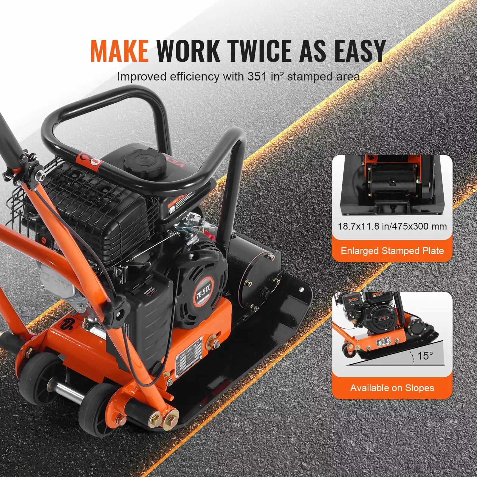 - A Monster-level Engine: With our high-performance plate compactor. you’ll have the power you need to get the job done. Its 78.5 cc / 2.8 HP gasoline engine delivers a whopping 5.250 vibrations per minute. while the 8-inch compaction depth ensures optimal results.