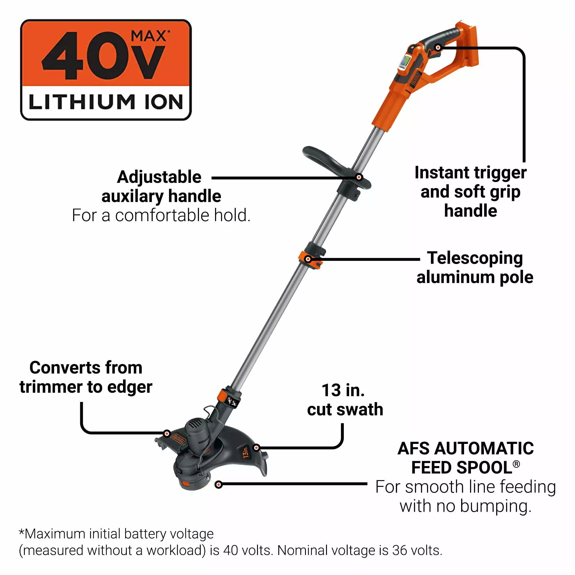 - Maximum initial battery voltage (measured without a workload) is 40 volts; nominal voltage is 36