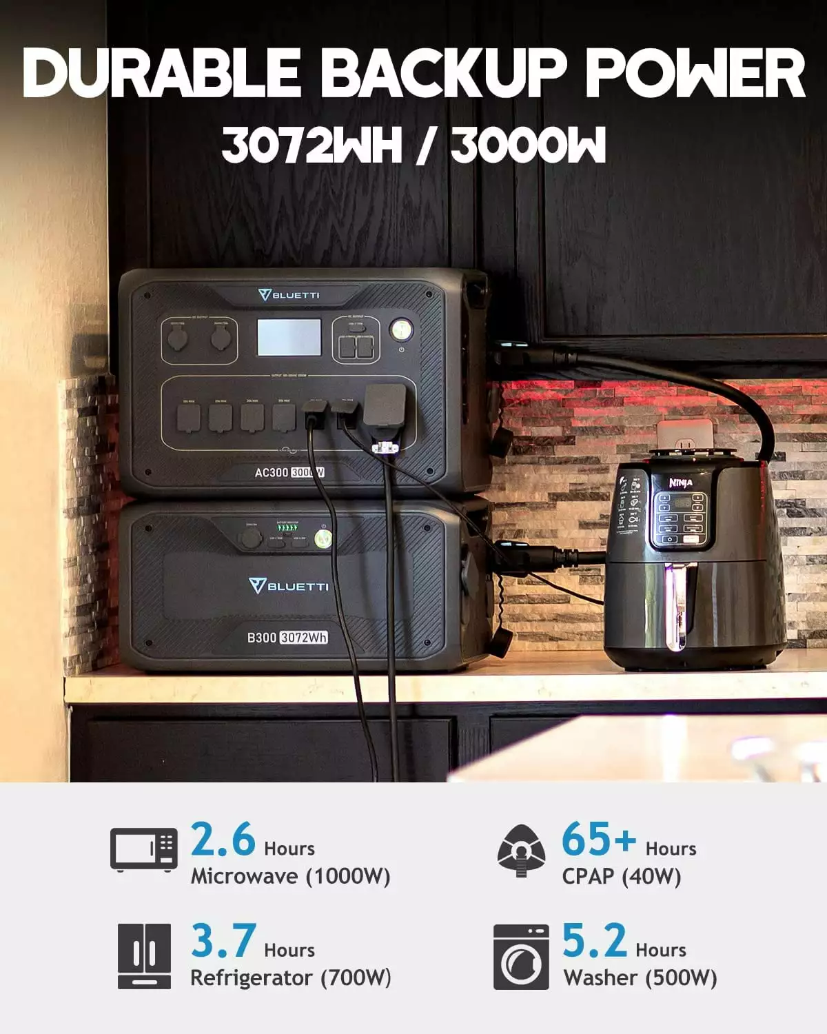 - Expand Your Power At Will-VBluetti AC300 is 100% modular. supporting up to 4??B300 (3.072Wh per pack) battery modules for a groundbreaking capacity of 12.288Wh! Power your basic family needs for DAYS during emergencies or power outages!