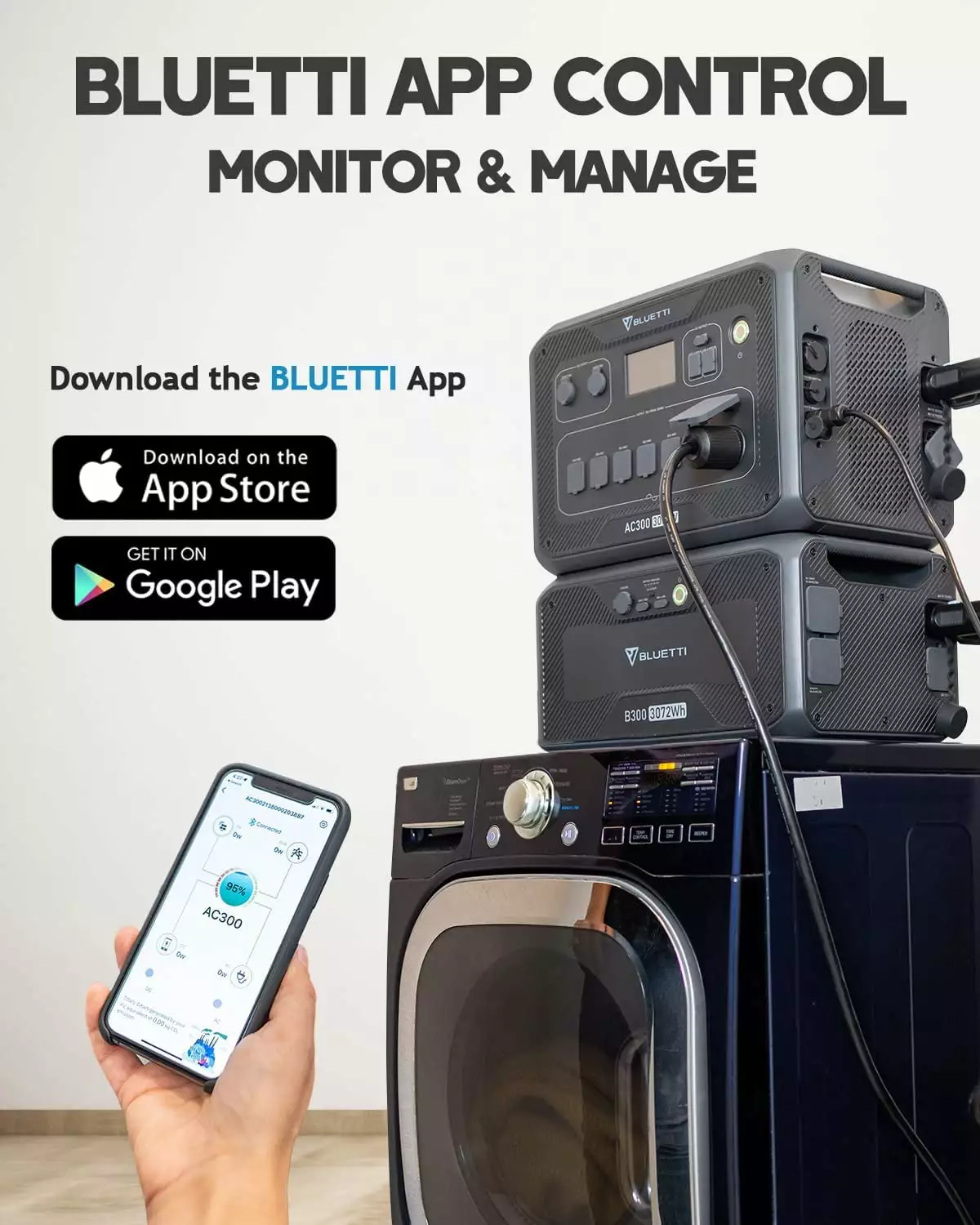 [Expandable Home Backup Battery] – BLUETTI AC300 & B300 is a 100% modular power system. One AC300 master module works with up to 4 B300 external battery packs(3.072Wh each) and expand the capacity from 3072Wh to 24576Wh.