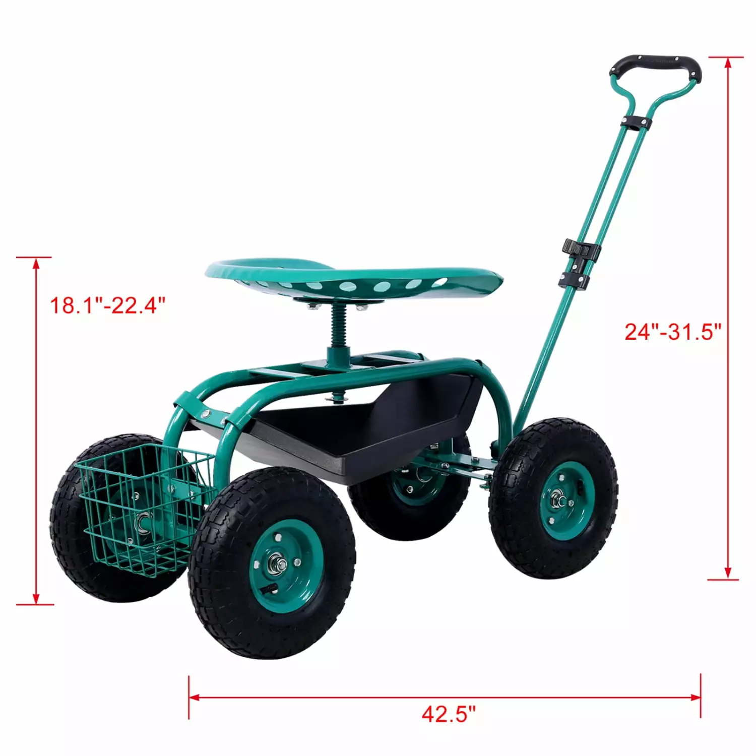 - 1. The Green Rolling Garden Scooter is the perfect tool for easy gardening and mobility in the garden. With a comfortable swivel seat and convenient tool tray. this garden cart makes tending to your plants a breeze.