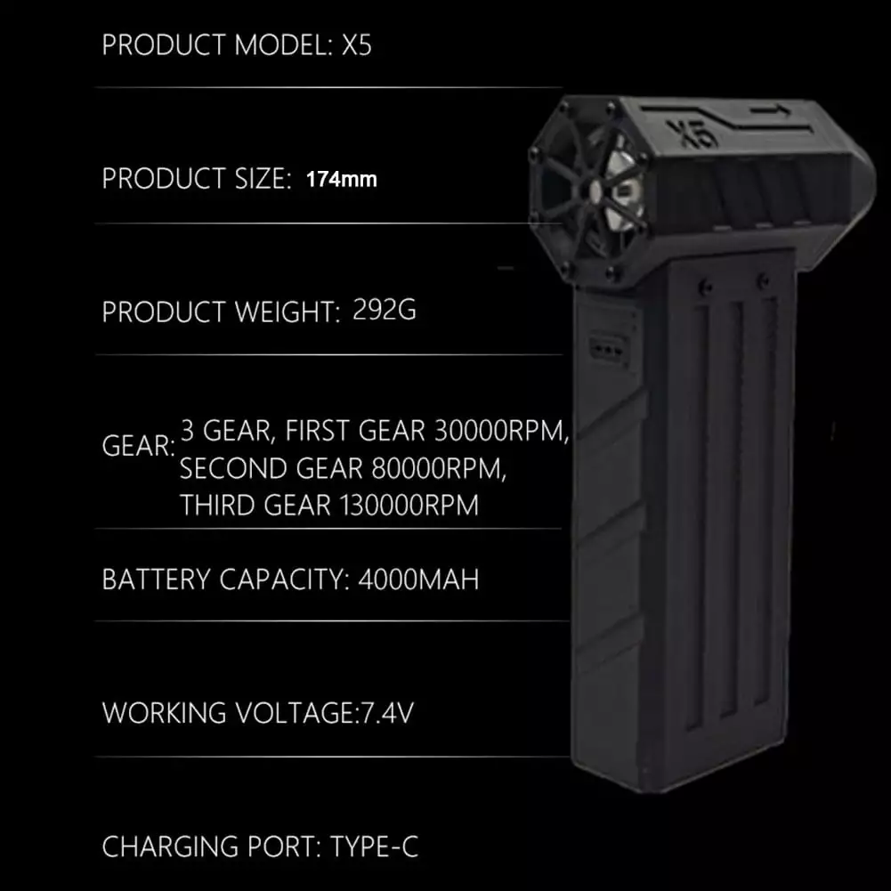 - The maximum speed can reach 130.000RPM. which can produce up to 52M/S wind speed.