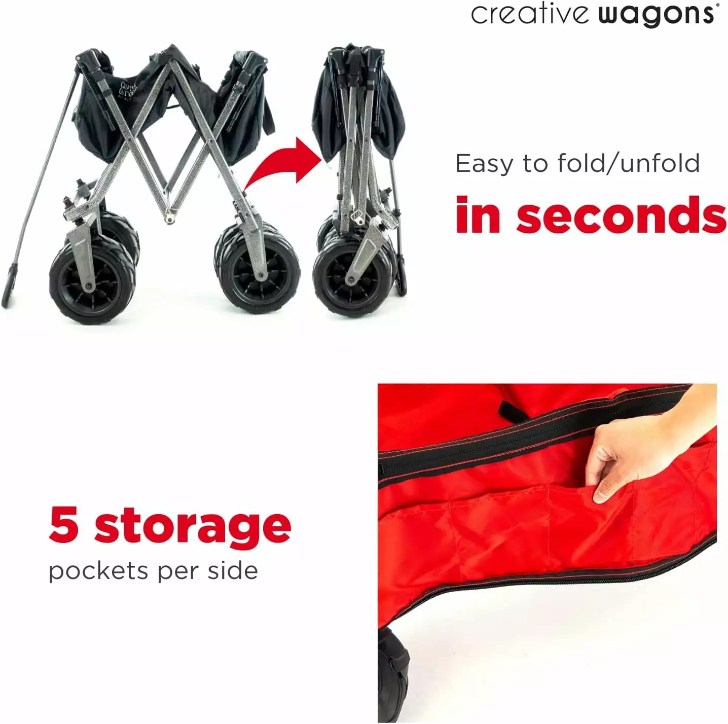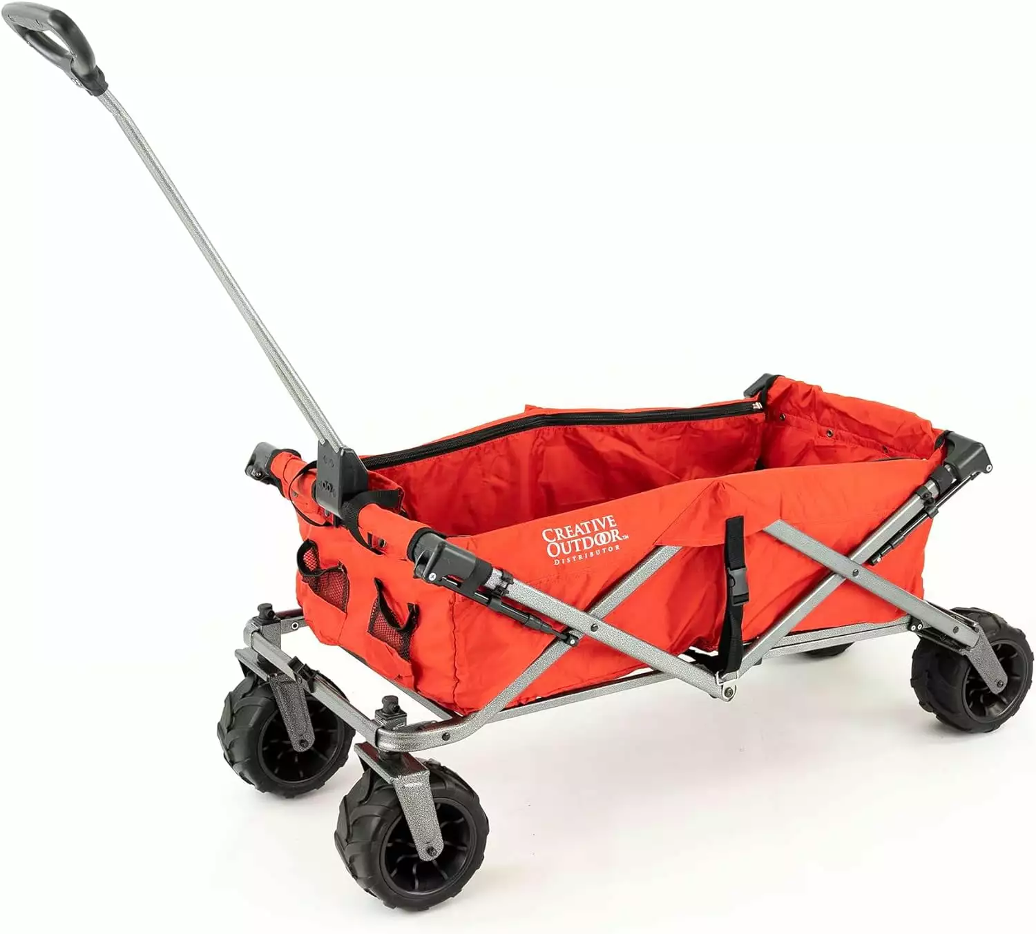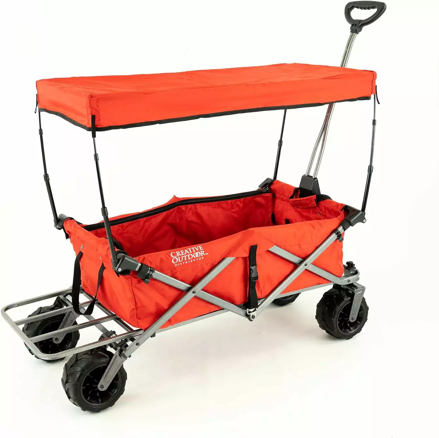 Creative Outdoor’s Deluxe All Terrain Wagon is an upgraded version of our best-selling All Terrain Wagon. All the maneuverability and hauling capacity. plus removable canopy. extending cargo rack. and zip-up table top. From sand to snow. all-terrain folding wagons are built to handle a wide range of terrain and haul your gear in comfort and style. Roll smoothly and quietly with the oversized. rubber tread wheels from the aisles of the hardware store to your perfect picnic spot in the rolling hills at the park. Pull the wagon with ease with the long handle reducing heel strike. The front swivel wheels make turning on a dime easy in tight spaces or crowded events. The sturdy frame and fabric provide the strength you need to haul your gear with confidence. When you’re all done fold the wagon up and put it in your trunk for your next destination or store it away until next time. Folds up compact in seconds flat with no tools required.