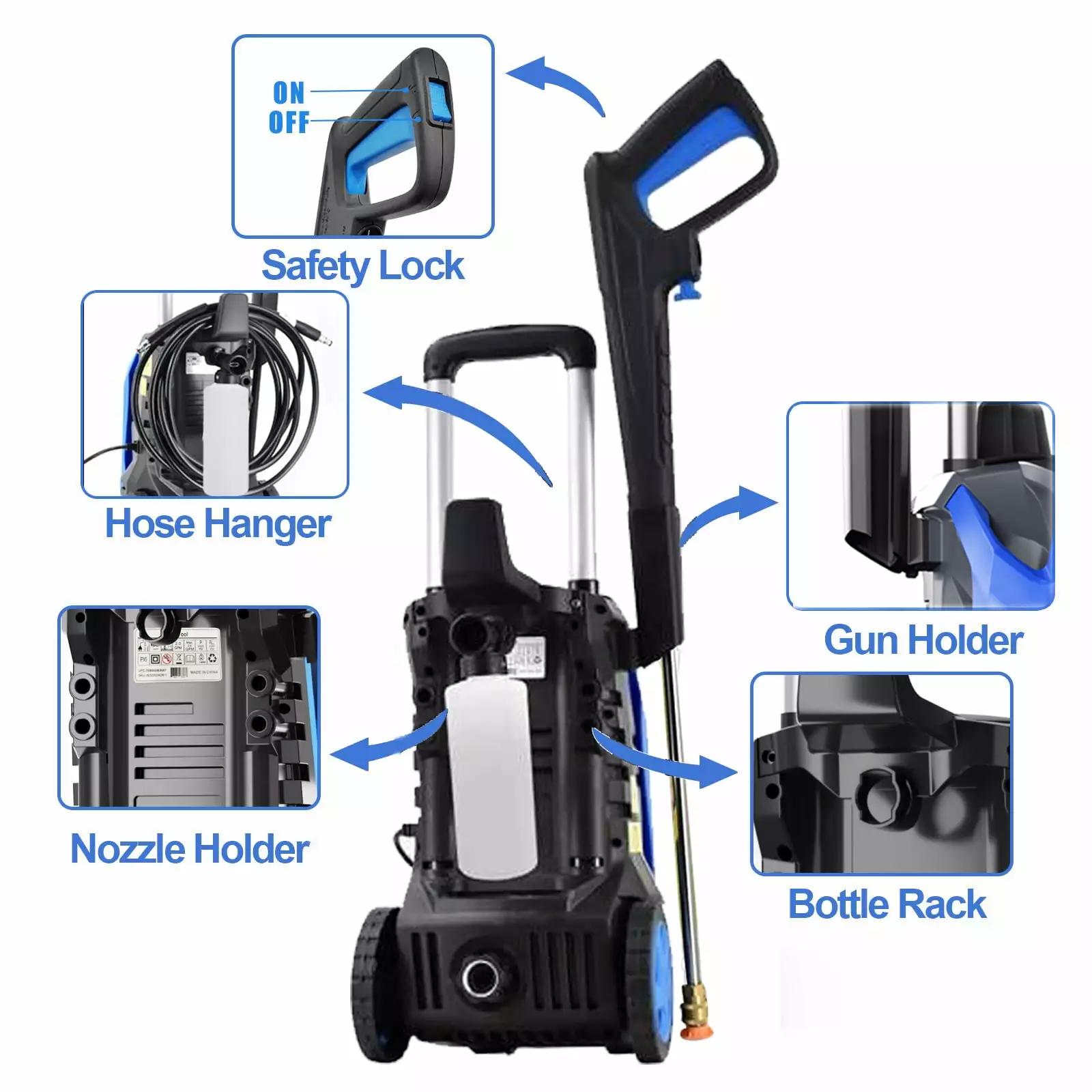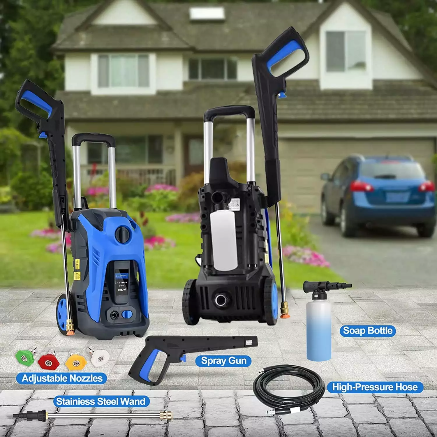 Equipped with a powerful 1800 Watt motor. this new 110v electric pressure washer cleaner will remove dirts easily. such as cleaning decks. terraces. driveways. siding. sheds. cars. outdoor power equipment . and other stubborn gunk and grime. With four quick-connect spray tips (0º. 15°. 25º. and 40°). you can easily adjust the pressure to tackle different cleaning tasks. Whether it’s low or high pressure. our pressure washer nozzles improve cleaning efficiency and allow for versatile cleaning of various stains.