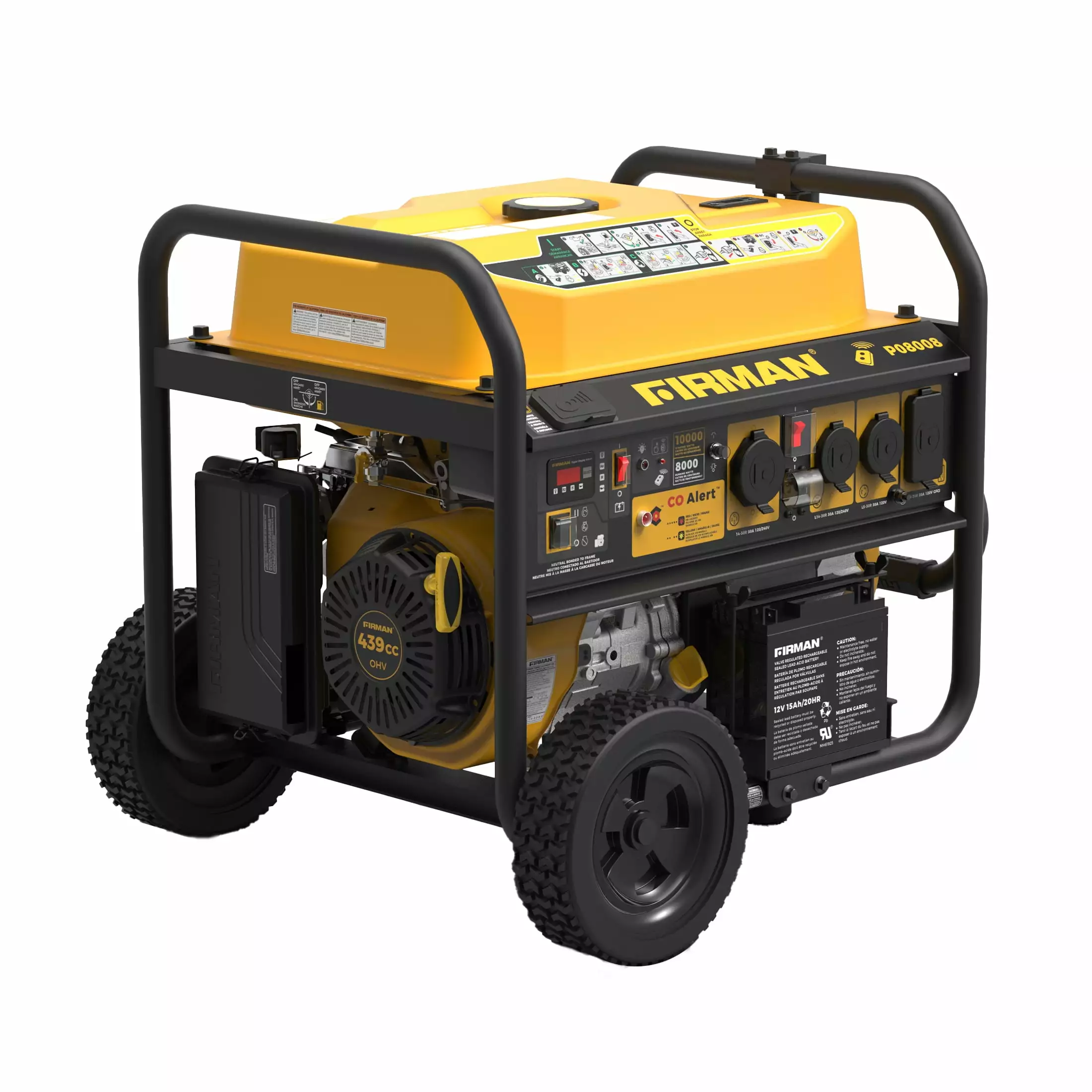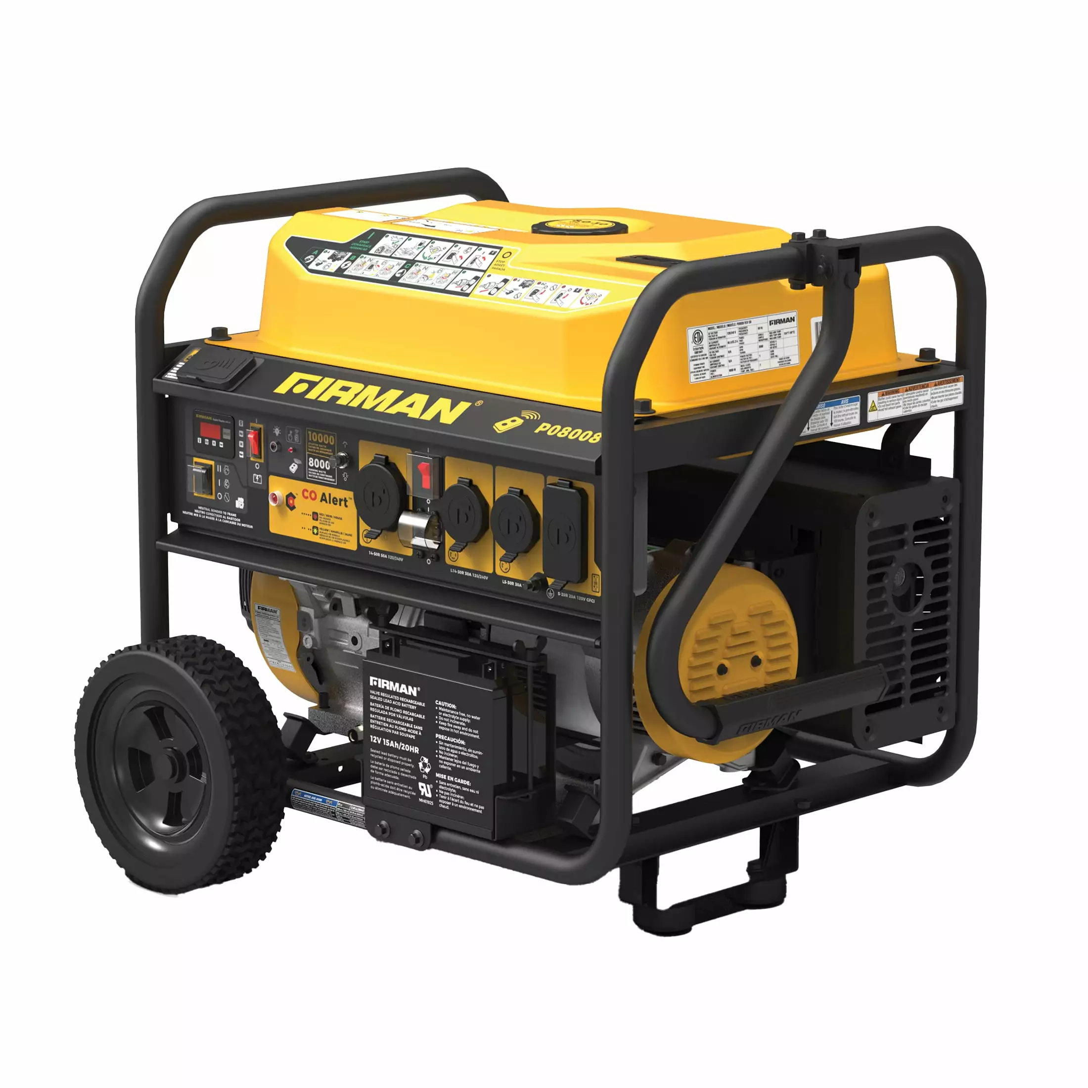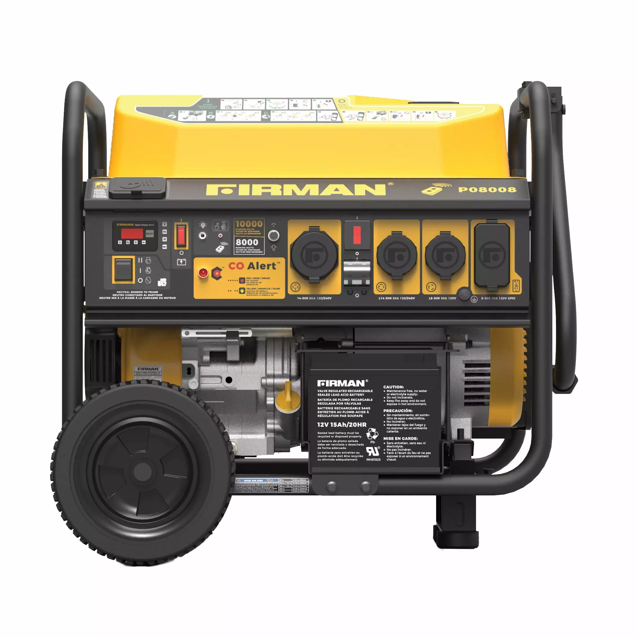 FIRMAN P08008 Gas Portable Generator 10000/8000W Remote Start. a powerhouse of a generator with an astounding 10000 watts. 50A. and 120/240V of raw. unyielding power. Safety is paramount with our latest CO Alert feature. while the Max Pro Series 439cc engine. thanks to its innovative Phoenix Fat Head Block. runs efficiently and cool. Emitting only 74dB. it offers both remote and electric start. and is certified for emissions in all 50 states and Canada. With an 8-gallon tank. it roars for an impressive 12 hours. and the remote start reaches an unmatched 168ft. This package includes an RV adapter. rugged 10 wheel kit. foldable handle. and a state-of-the-art 4-in-1 data minder. Everything you need. from oil to wrench. is in the box.