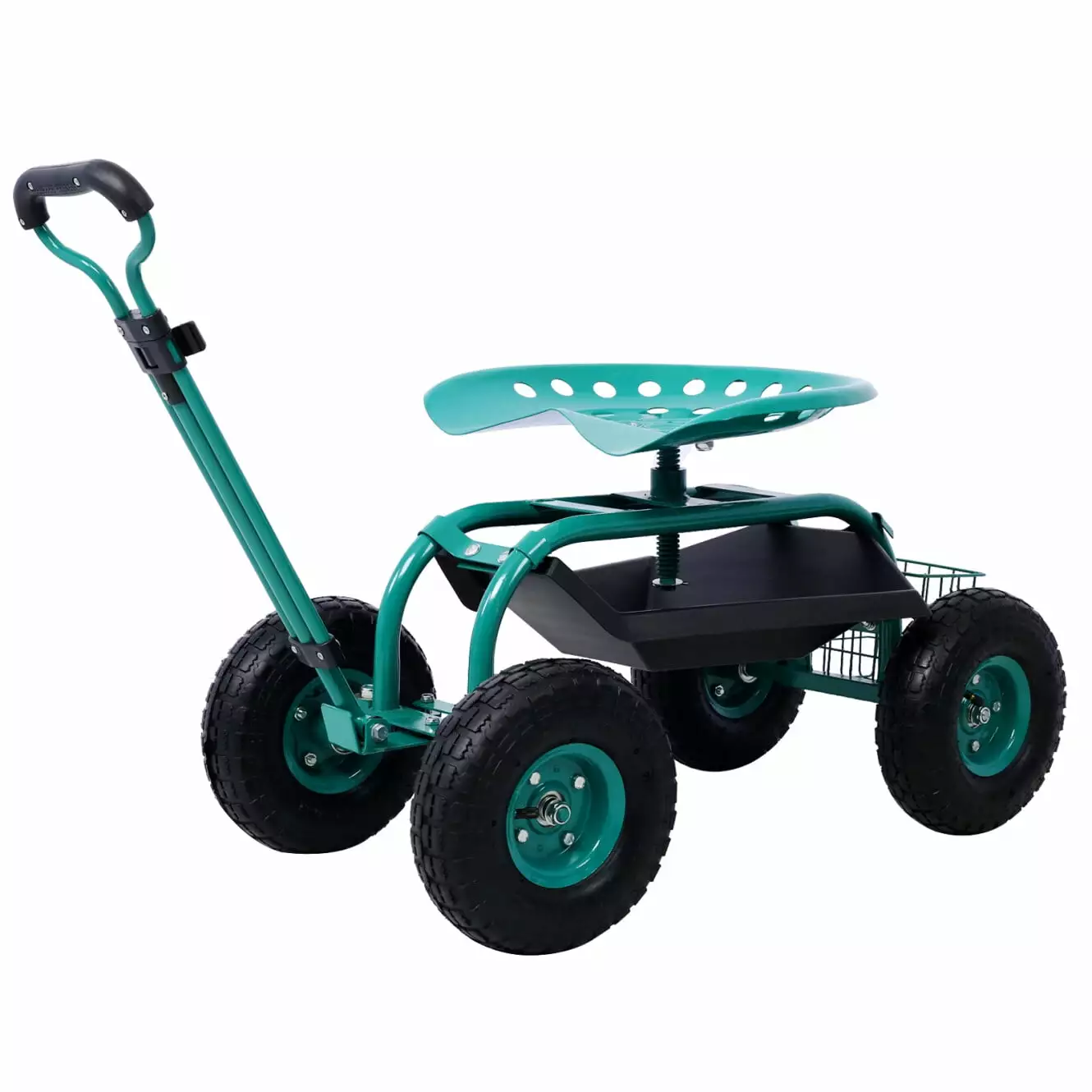 The heavy-duty steel frame of this garden car ensures a rugged and durable quality. No matter how many tools and equipment you need to carry. it can hold up to 300 pounds without bending or sagging. Secondly. it is equipped with four large wheels with a good grip mode. making this garden car easy to maneuver on all kinds of terrain. Whether navigating on muddy. gravel or uneven ground. it’s up to the task. In addition. this garden car also comes with convenient trays and baskets. providing plenty of storage space for all your gardening tools and accessories. Plus. it comes with a comfortable and ergonomic swivel seat that allows for height adjustment and a 360-degree rotating motion that allows you to easily get the job done in any direction.