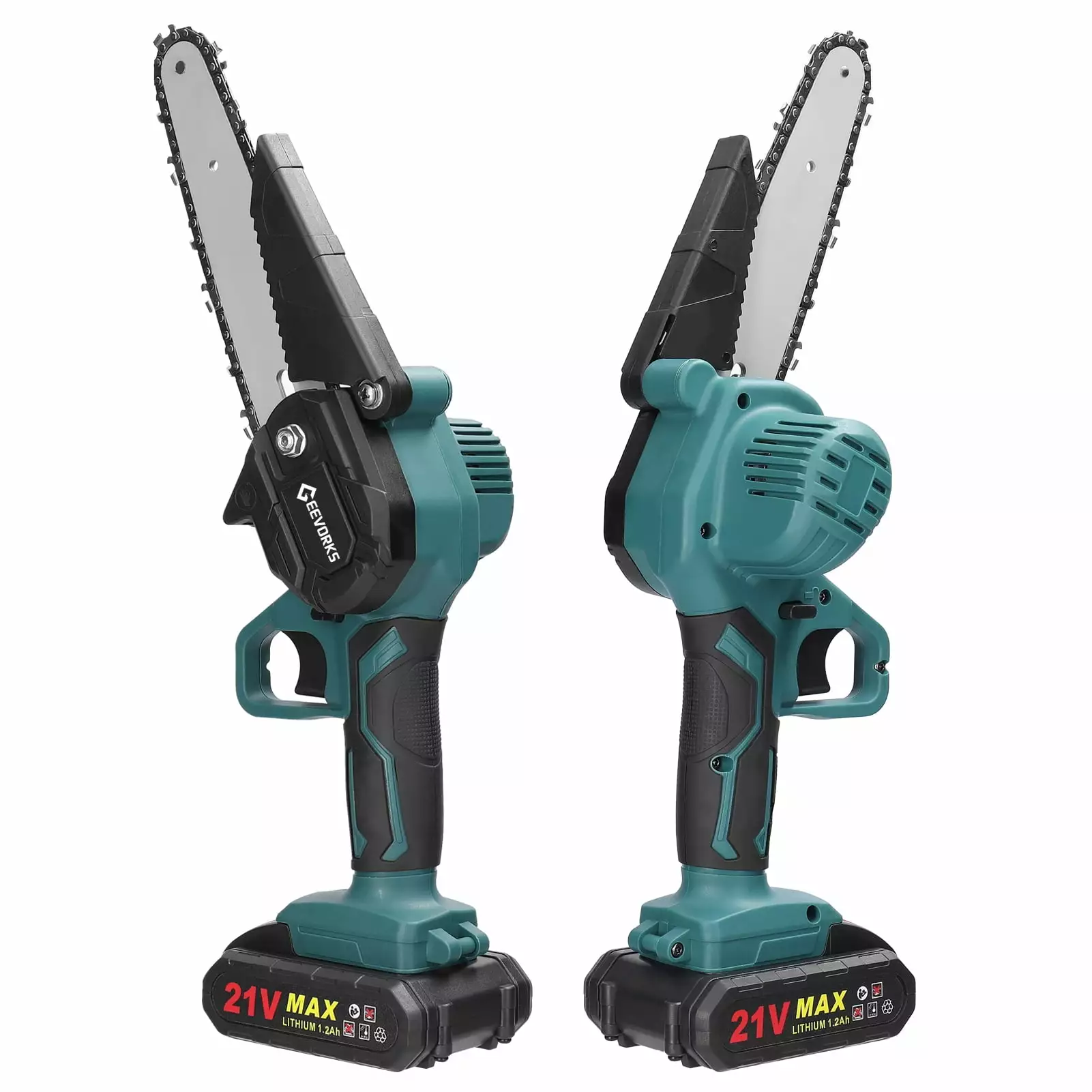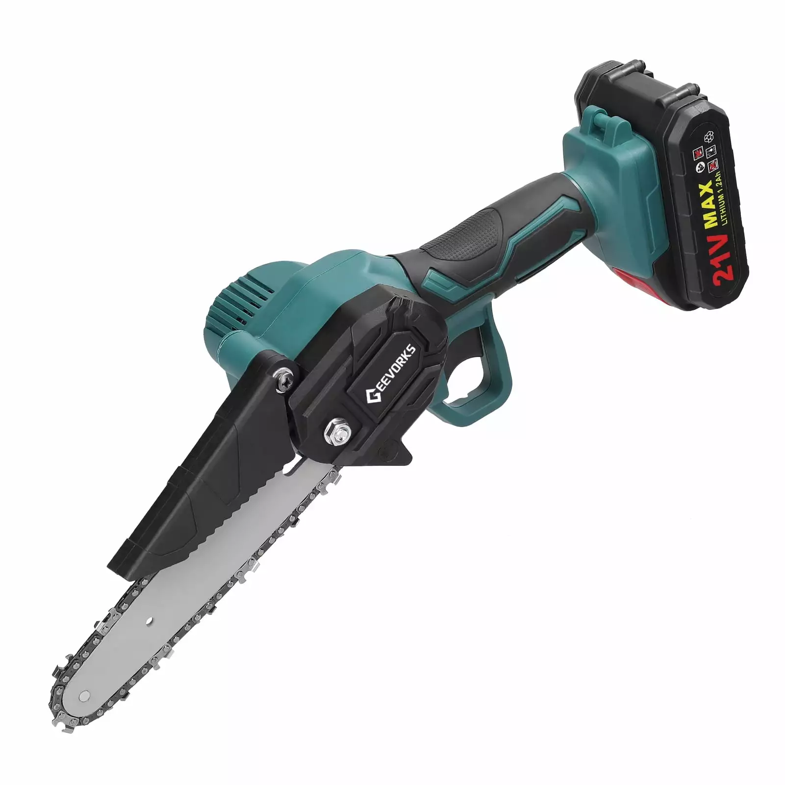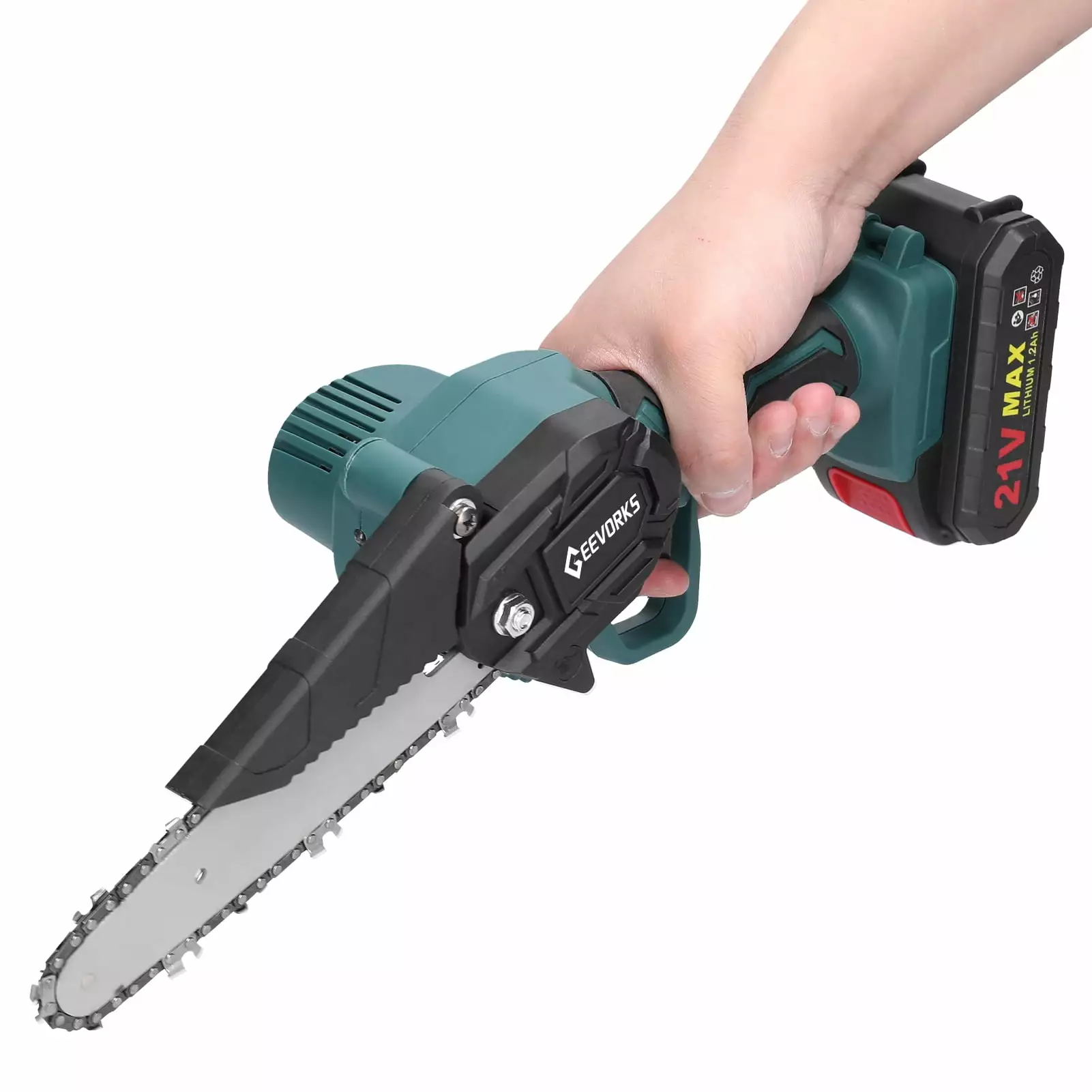 21V Portable Electric Pruning Saws Rechargeable Small Wood Spliting Chainsaw One-handed Woodworking Tool for Garden Orchard Branch Clip: Cordless design. lightweight and portable. easy to carry out and cutting the wood.Powered by 21V rechargeable lithium battery. which can provides quick charging and supports long continuous working time. with nice durability and long endurance.With high working efficiency. high positioning accuracy. low noise. which can give you a better using experience.Compare with other type of chainsaw. this chainsaw is proper size and also light. so you can hold and use it more easily. which can be used for more people.With quickly cutting speed. which is practical and low power consumption. high stability and high performance.The sawchain has been deep quenching by high temperature. with sharping sawteeth. more wear-resistant. smooth cutting.6inch long guide plate. with detachable baffle guard design. prevents flying sawdust and debris.Scope of applications. suitable for cutting trees in orchards. pruning branches in municipal gardens. splitting firewood and etc..Ergonomic handle design. one hand use. long time griping will not tired hands.