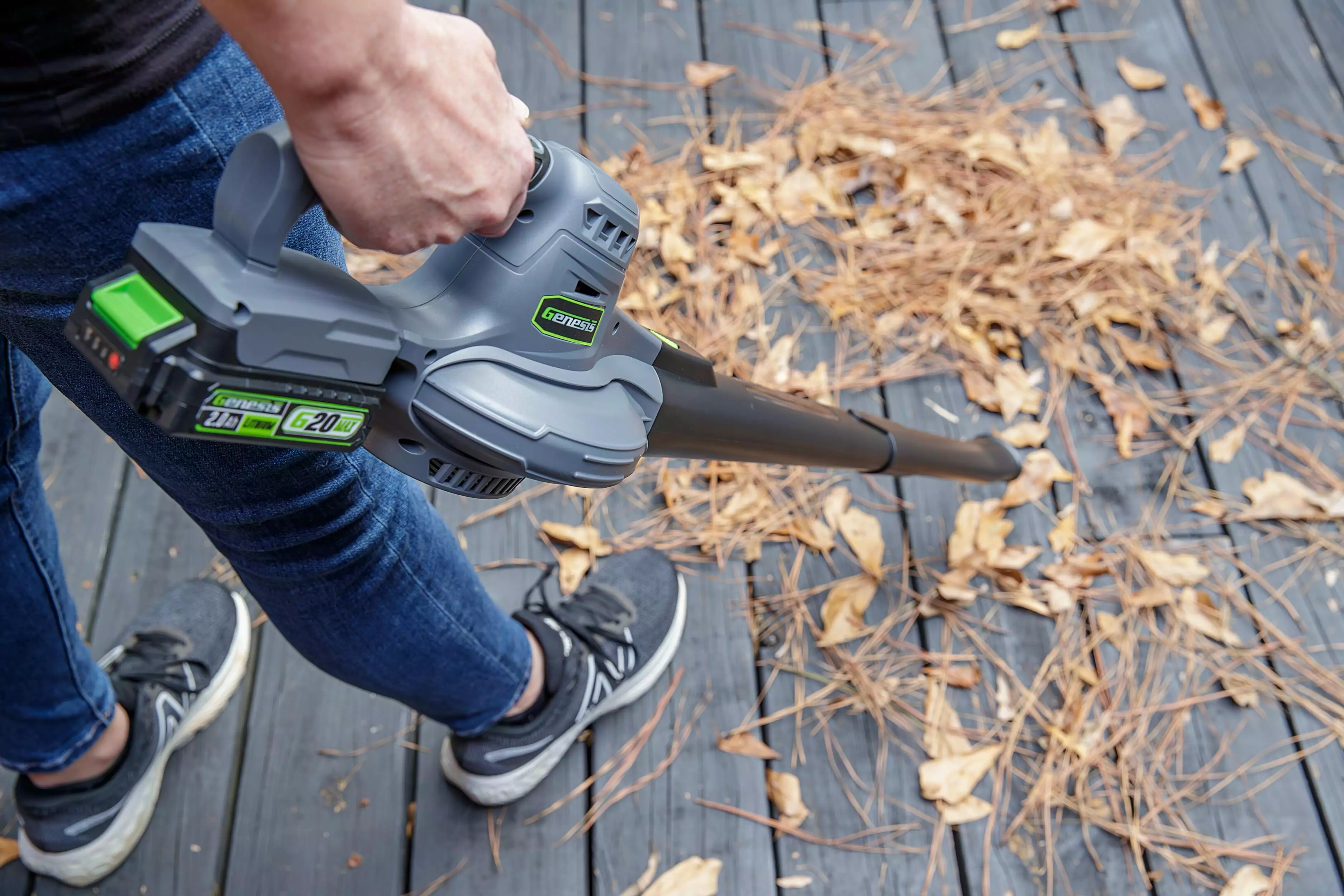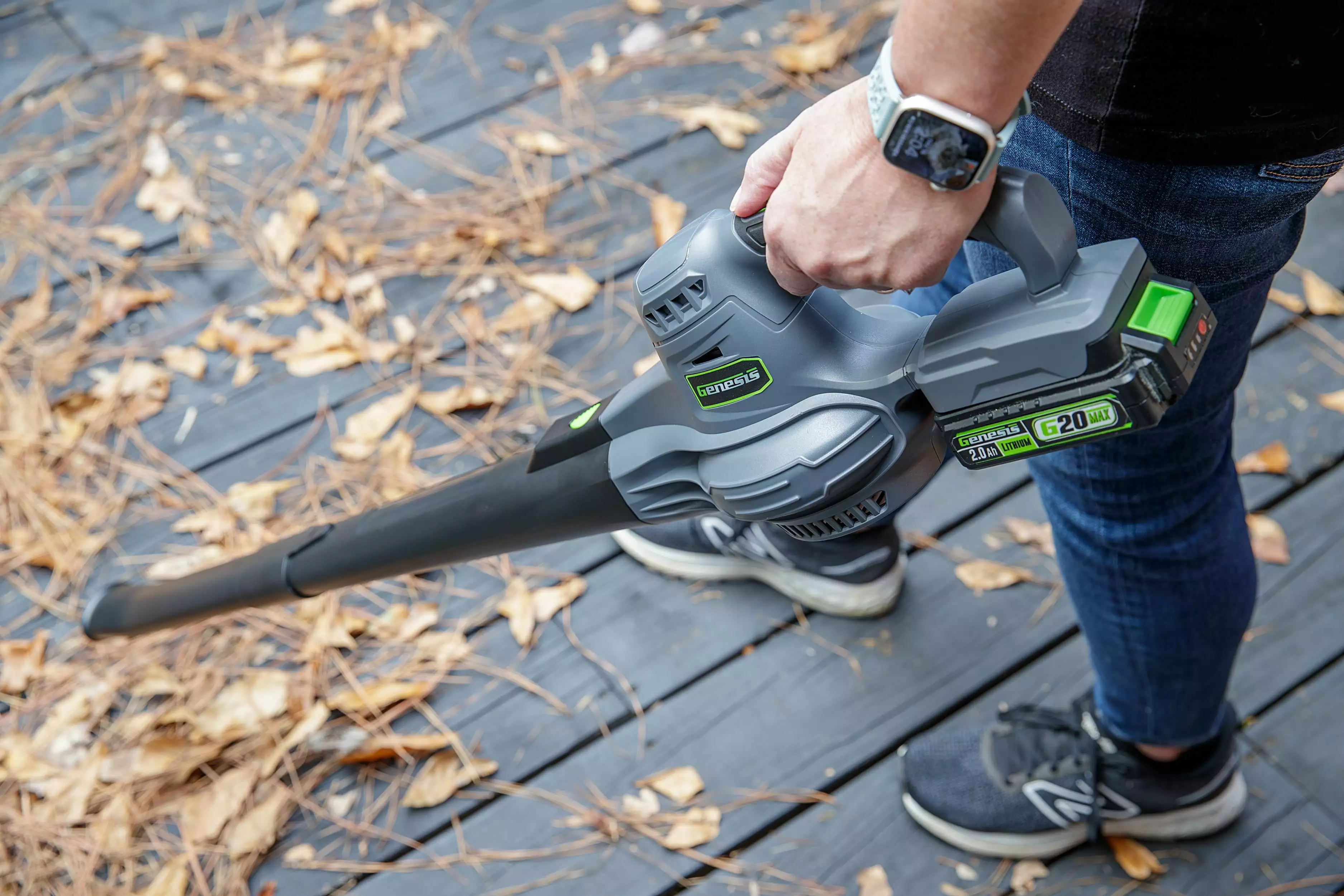 Clear your sidewalk. porch. and patio areas with the Genesis G20Max Cordless 2-Speed Blower. Leaves and debris are quickly removed with 130 MPH air from the 20V motor. Use the lower 70 MPH speed for light debris and to achieve even longer run time. A 2-piece nozzle extension directs air exactly where it’s needed for better control. Includes Genesis G20Max 2-Speed Blower/Sweeper. 2.0Ah Rechargeable Removable Battery. Quick Charger. Operator’s Manual. 2 Year Warranty. and US Based Customer Support. Compatible with the Genesis G20Max 20V Cordless Power Tools System.