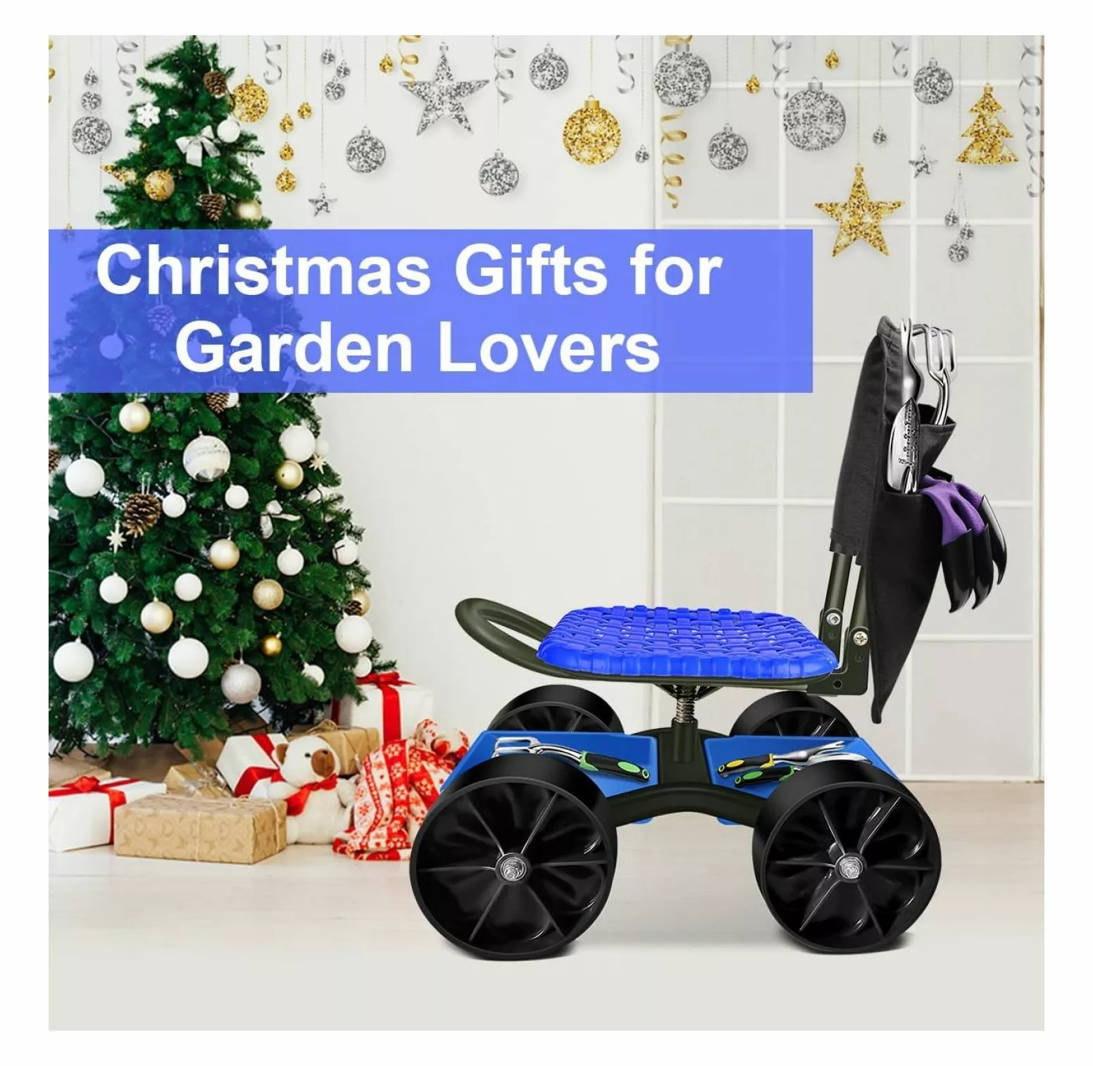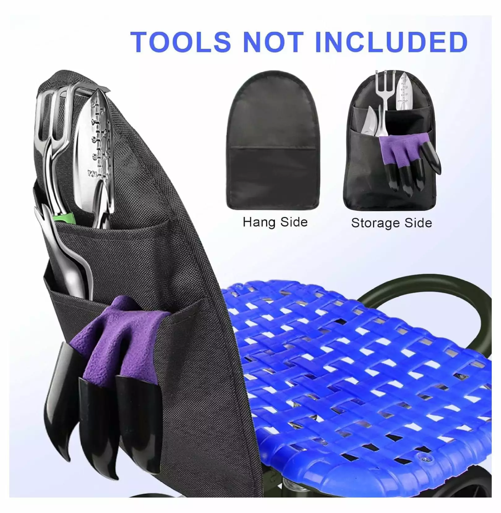 Upgraded Version!! Extra Coating Prevent Rust!! Gardening Stool with Rolling Wheels and Weeding Tool Bag ( Tools NOT Included 4 WHEELSUpgraded with AntiRust coating to the metal part from rusting.Garden cart with seat and 4 wheels bring more possibilities and stablility for gardening work.It can move over rough ground easily to take care of your plants.Comes with a tool bag hanging behind the back for keeping lawn care equipment.A great versatile gardener helper! Rolling Garden Seat with Wheels Size of garden cart with seat and wheels