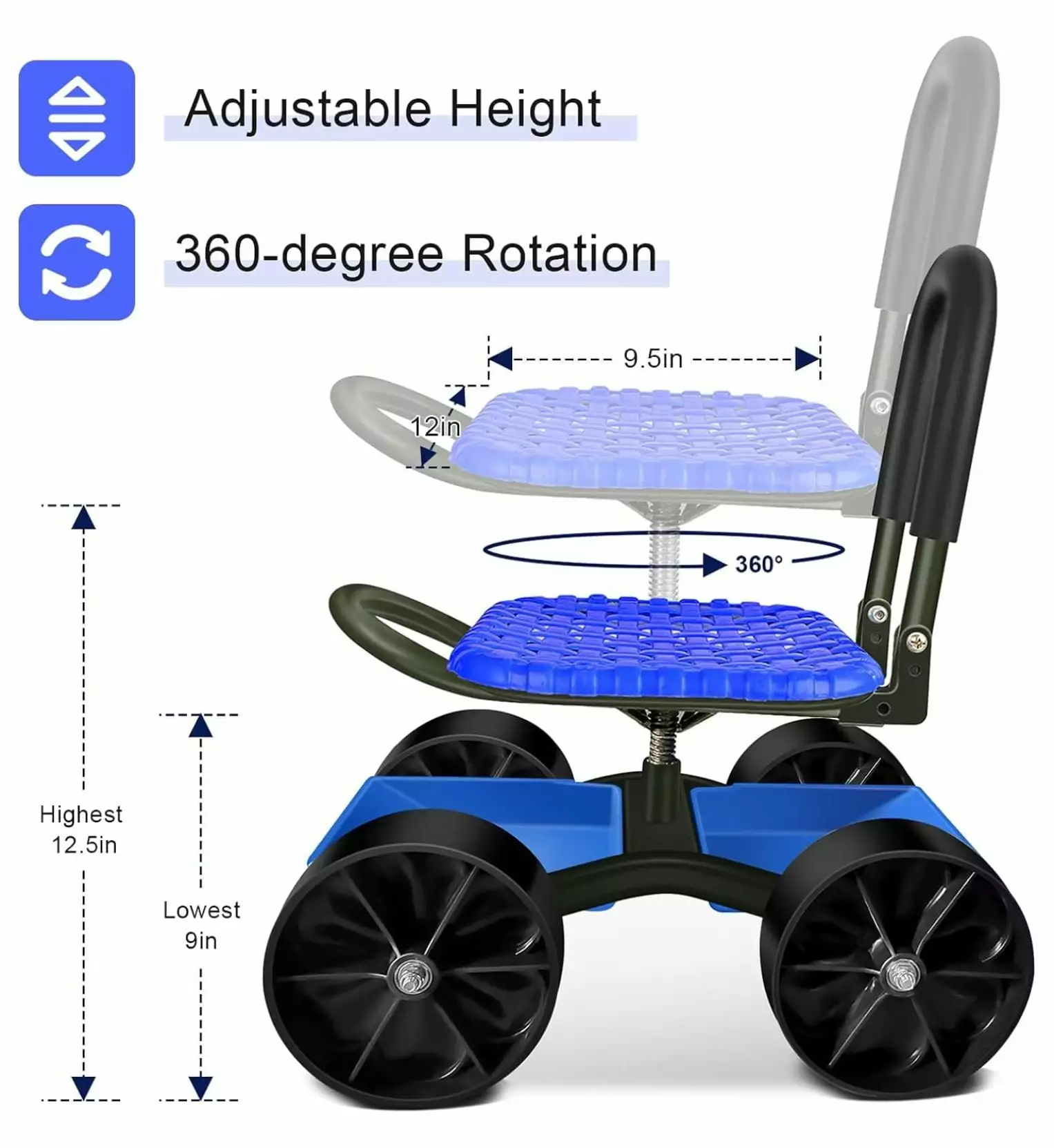 - Work as a garden cart with rotatable seat. it can save your knee and back. Seat height is adjustable from 9inch to 12.5inch.
