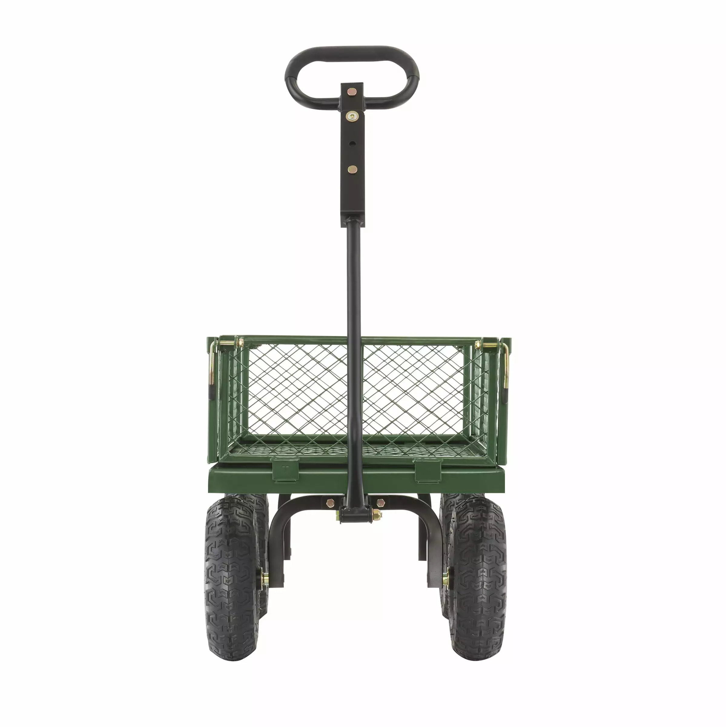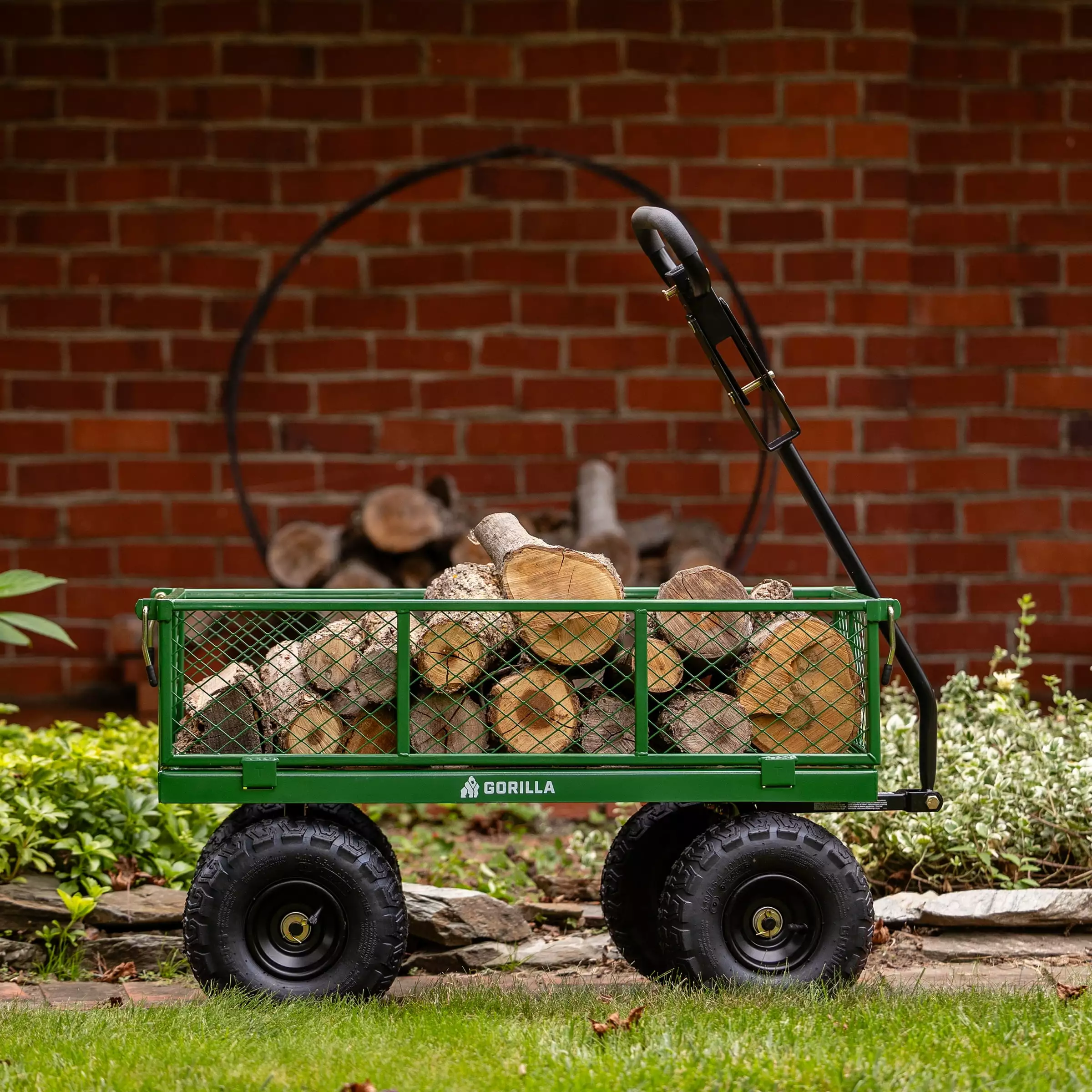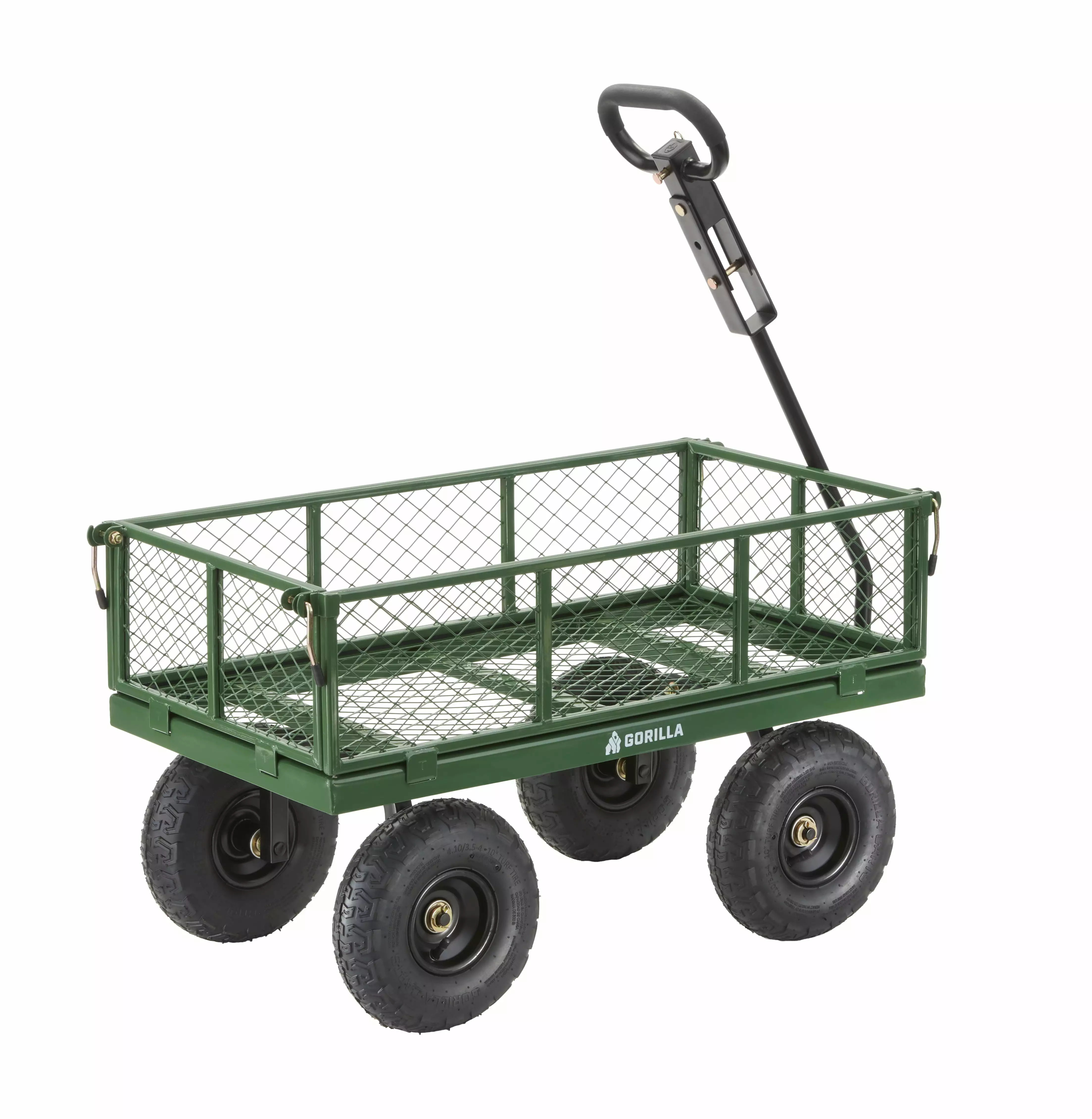 The new Gorilla Carts Steel Utility Cart with convertible 2-in-1 handle is built to haul all your project needs. This cart has been engineered to significantly increase maneuverability with a tighter turn radius. making it easy to move up to 400 lbs. for gardening. farming or any other outdoor jobs. The durable 32 in. by 18 in. steel bed features removable sides that allow the cart to convert into a flatbed for moving larger materials like 2x4s. tree branches or fence posts. A patented 2-in-1 convertible handle allows the cart to be pulled by hand or towed behind a tractor/ATV. The 10 in. pneumatic tires are designed to tackle any terrain and to make hauling heavy rocks. wood or plants easy for anyone.