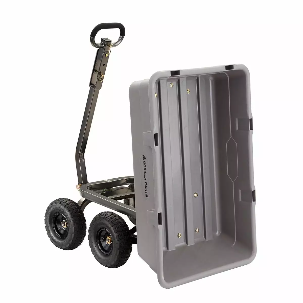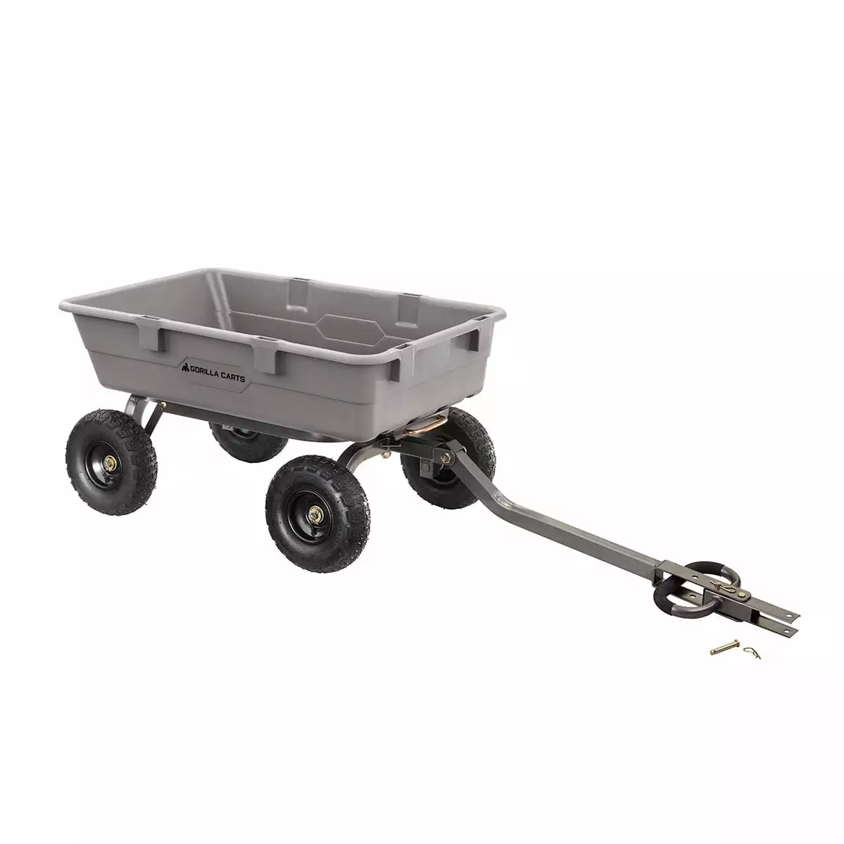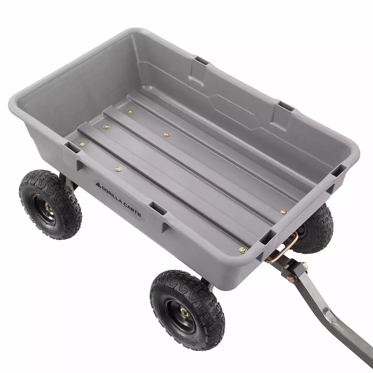 Haul heavy loads and get your items where they need to go with the Gorilla Carts Heavy-Duty Poly Yard Dump Utility Cart. With a carrying capacity of up to 800 pounds. this industrial wagon cart is great for transporting heavy objects through your yard. throughout the garden. or around the farm. The rolling utility wagon cart contains a durable bed measuring 36 inches long by 24 inches wide that provide durability when carrying heavier items. The garden cart’s 10-inch pneumatic tires ensure usability and smooth maneuvering on many different terrains. The patented quick-release dumping system allows you to unload whatever you’re hauling with ease. The steel garden cart’s padded 2-in-1 handle can be comfortably pulled by hand or conveniently hooked up to an ATV or lawn tractor hitch for hauling heavier loads. The simple steel frame design of this utility cart allows for quick and easy assembly. Make hauling heavy loads easy and convenient with the Gorilla Carts 800 Pound Capacity Poly Yard Utility Cart.