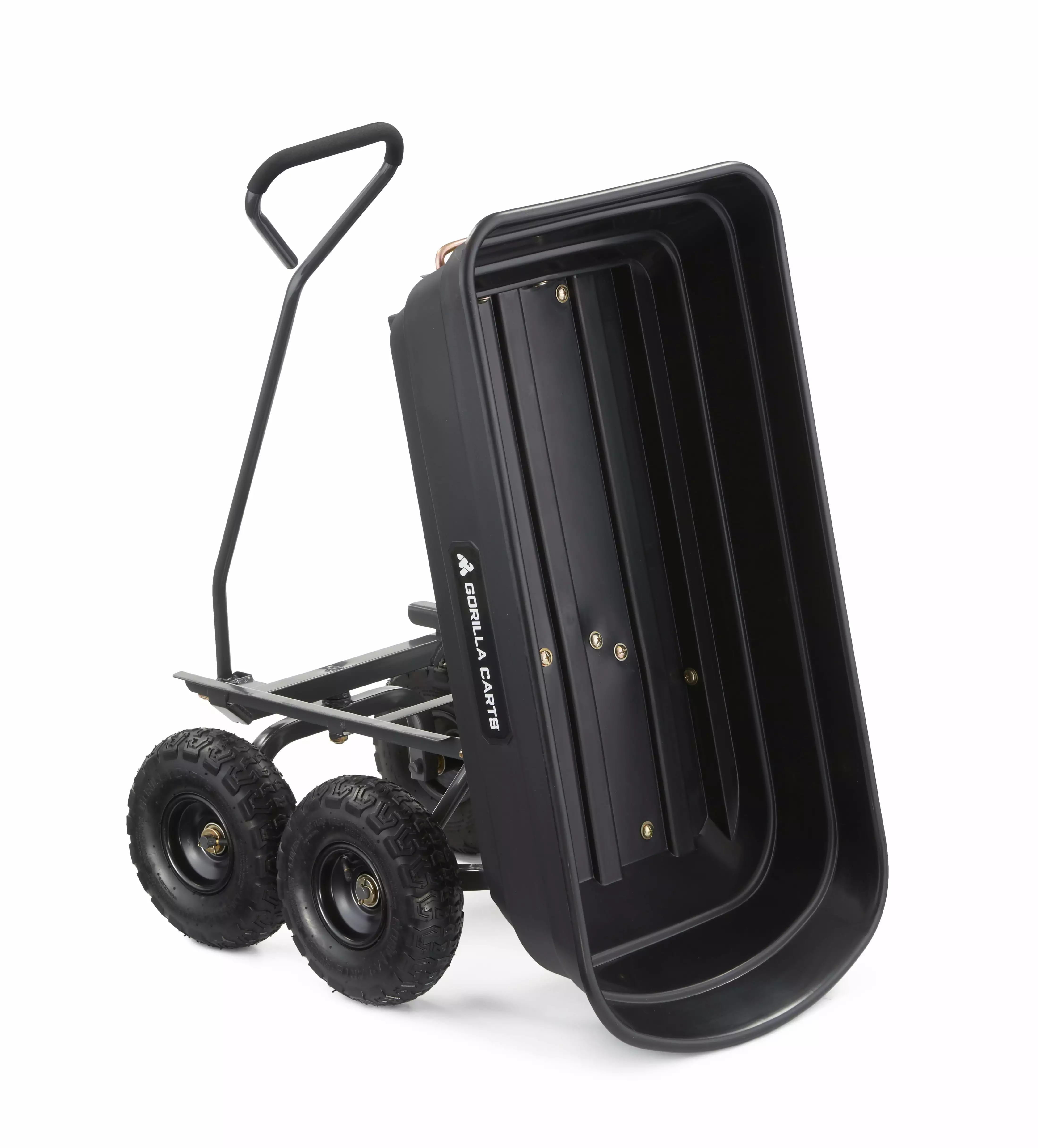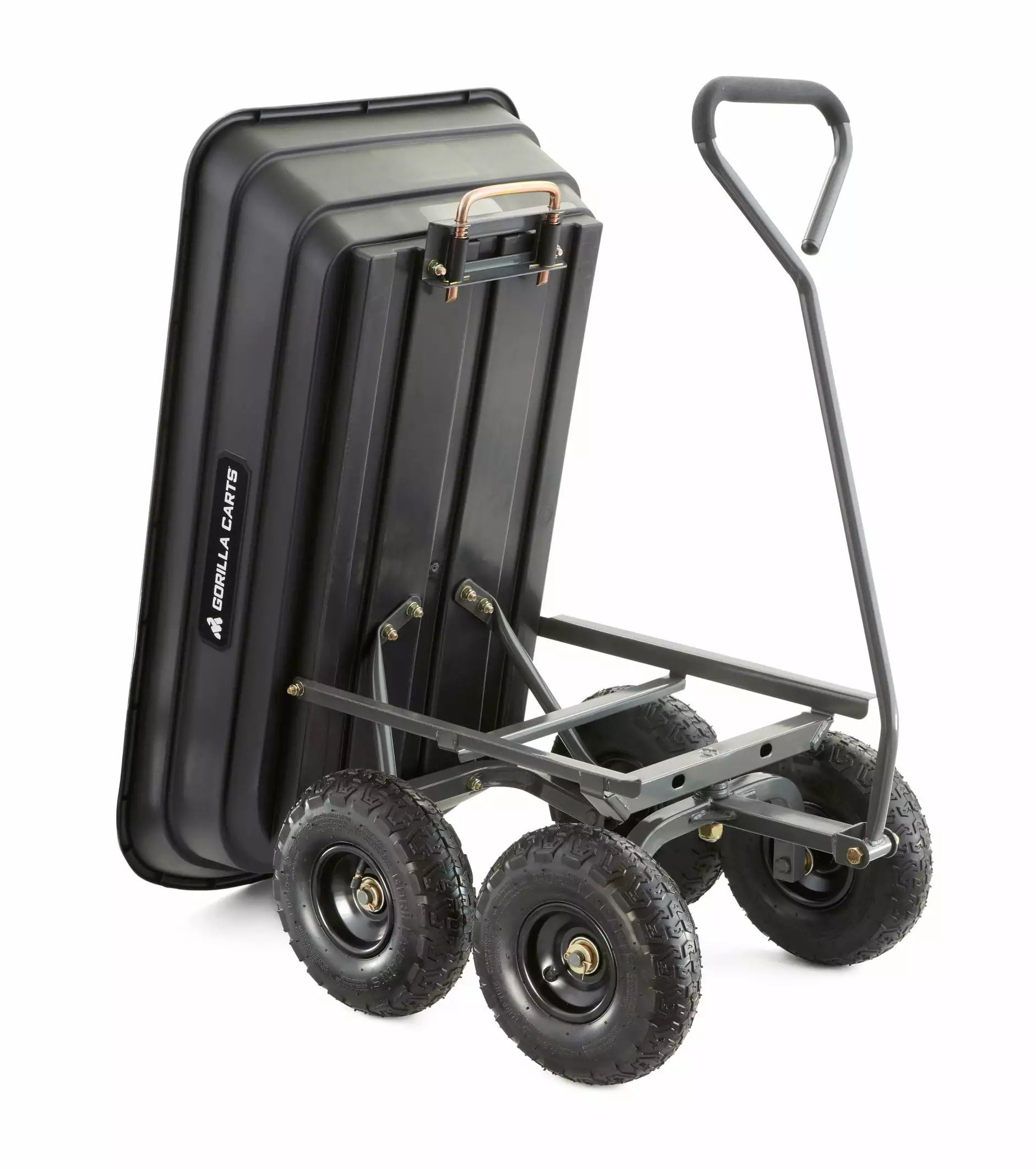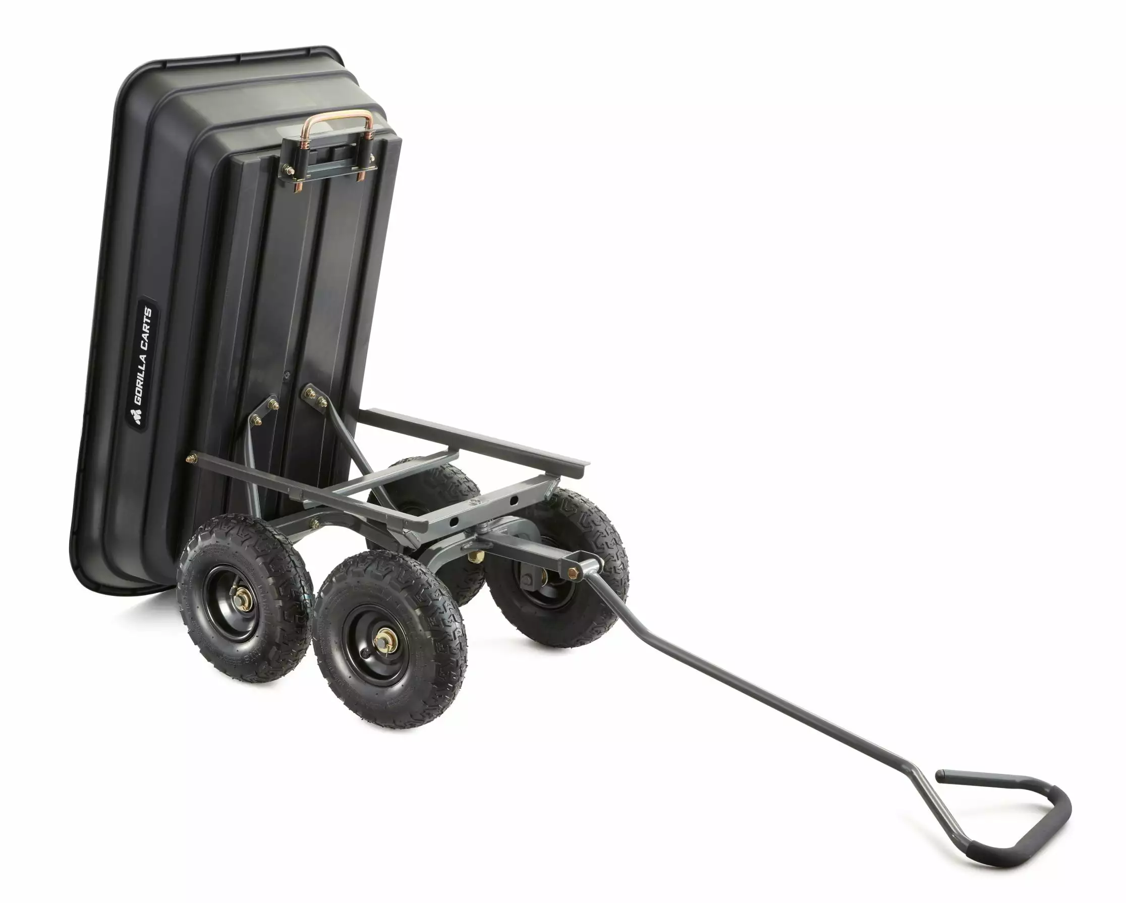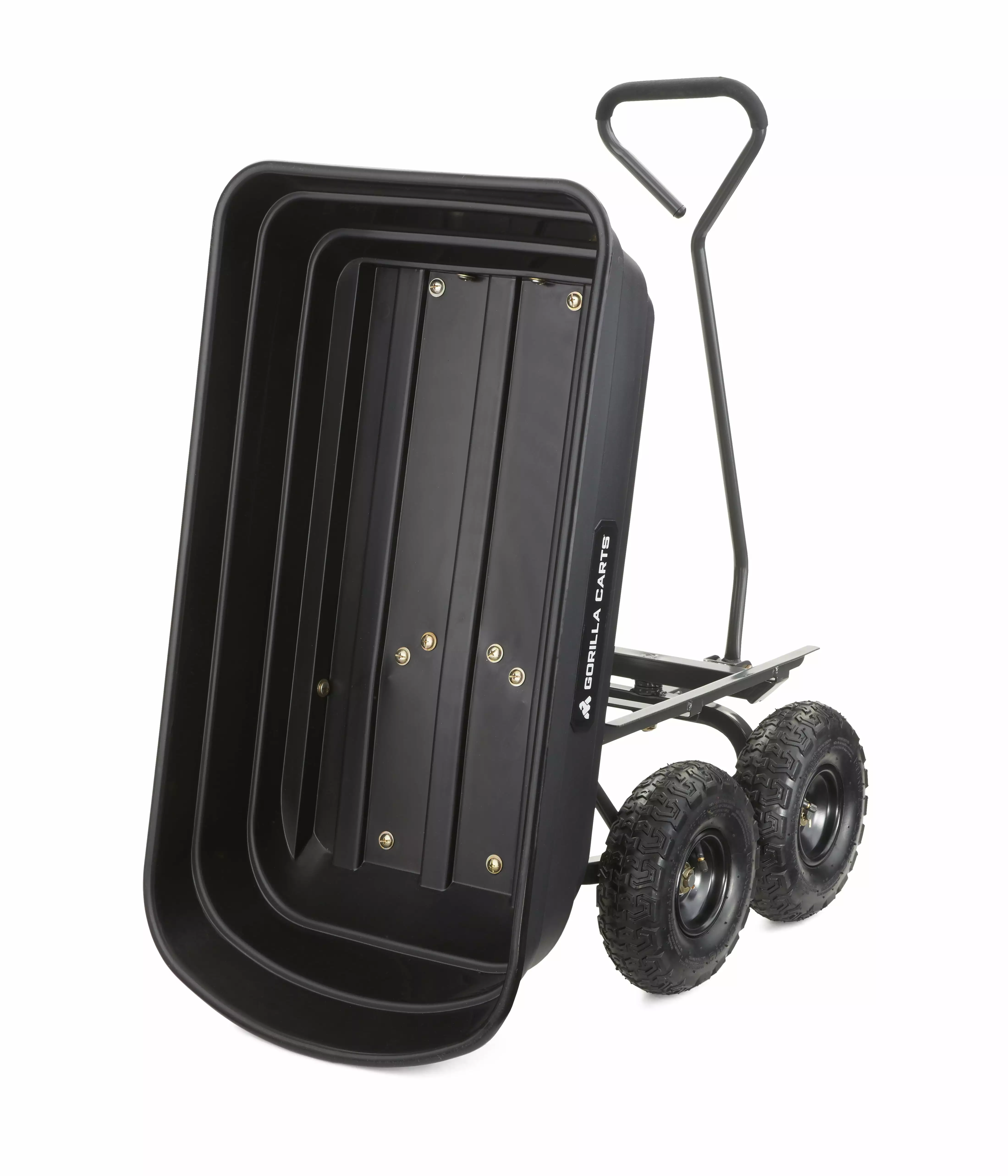 The newly-designed Gorilla Carts 600-lb. Capacity Poly Garden Dump Cart has an innovative. updated frame design that makes it quick and easy to assemble and put this cart to work. The cart features the patented quick-release dumping system. which allows the cart to be loaded and unloaded with ease. and the balanced 4-wheel design makes it a simple-to-use alternative to a wheelbarrow. The new frame design allows for easy assembly. while improving maneuverability and rigidity. increasing ground clearance. and giving the cart a tight turning radius. The durable poly bed is maintenance-free and easy to clean. and the 10 in. pneumatic tires are designed to handle any terrain whether you’re hauling heavy dirt. mulch. gravel. or plants. With a 600 lb. hauling capacity and padded dipped-grip handle. this cart is perfect for the casual gardener or the lawn professional. The bed dimensions measure 36-inches by 20-inches. and the cart has an overall height of 19.5-inches and weighs 32-pounds. Gorilla Carts full line of products meets the needs of the light-duty homeowner as well as the commercial-duty professional user by offering a wide variety of carts in different sizes and weight capacities. The Gorilla Carts GOR4PS Poly Garden Dump Cart comes with a 1-year limited warranty.