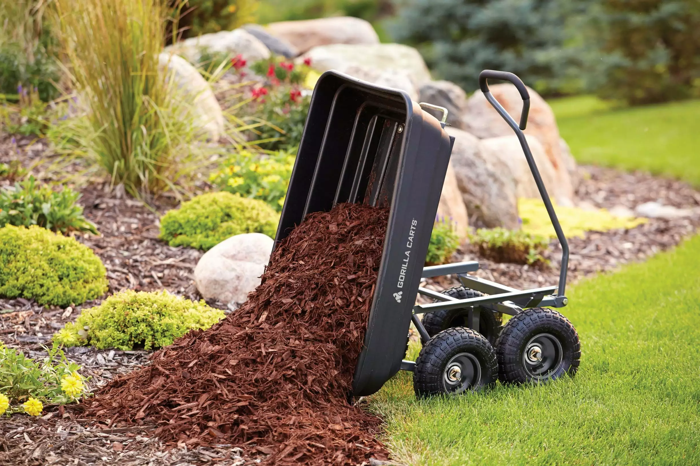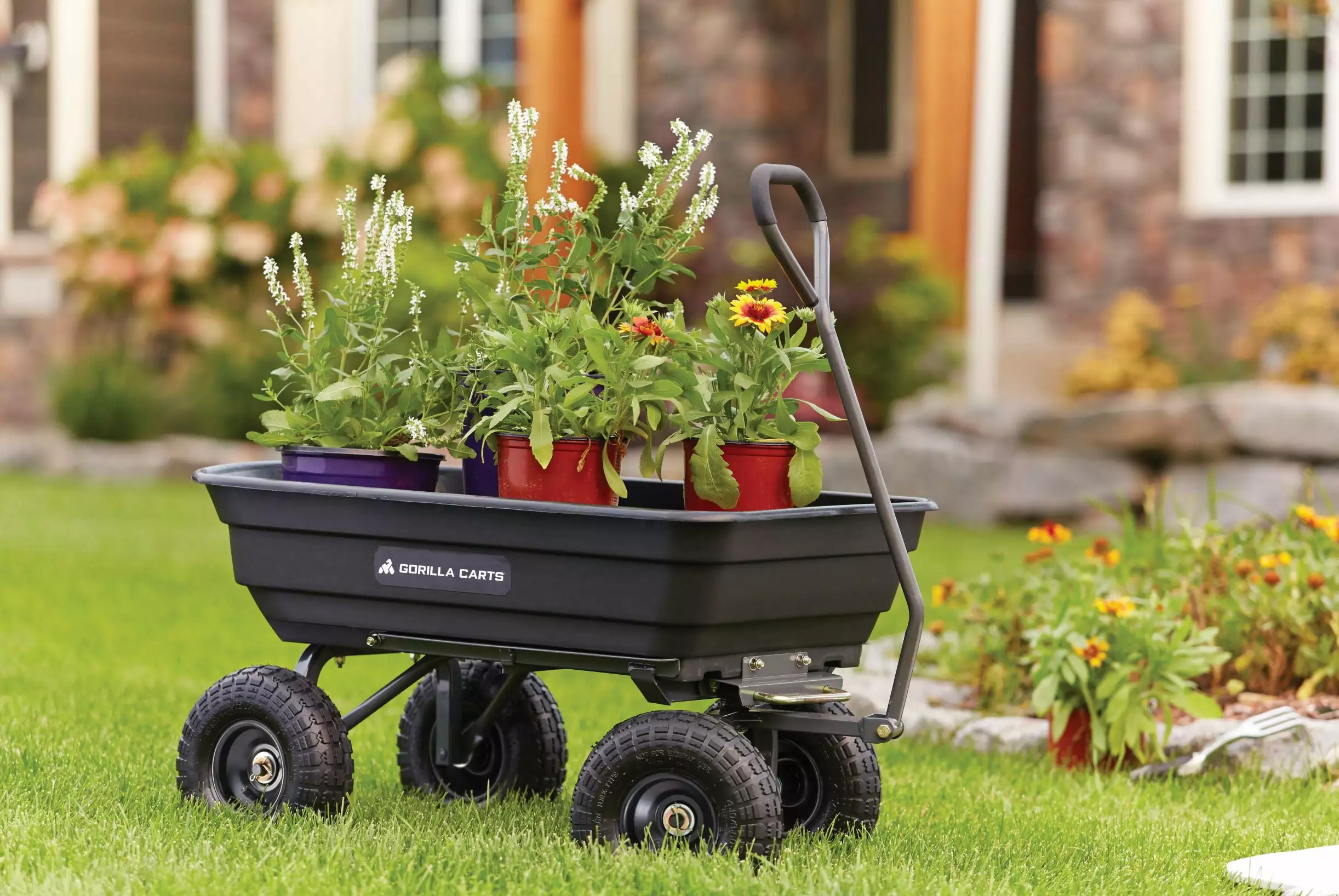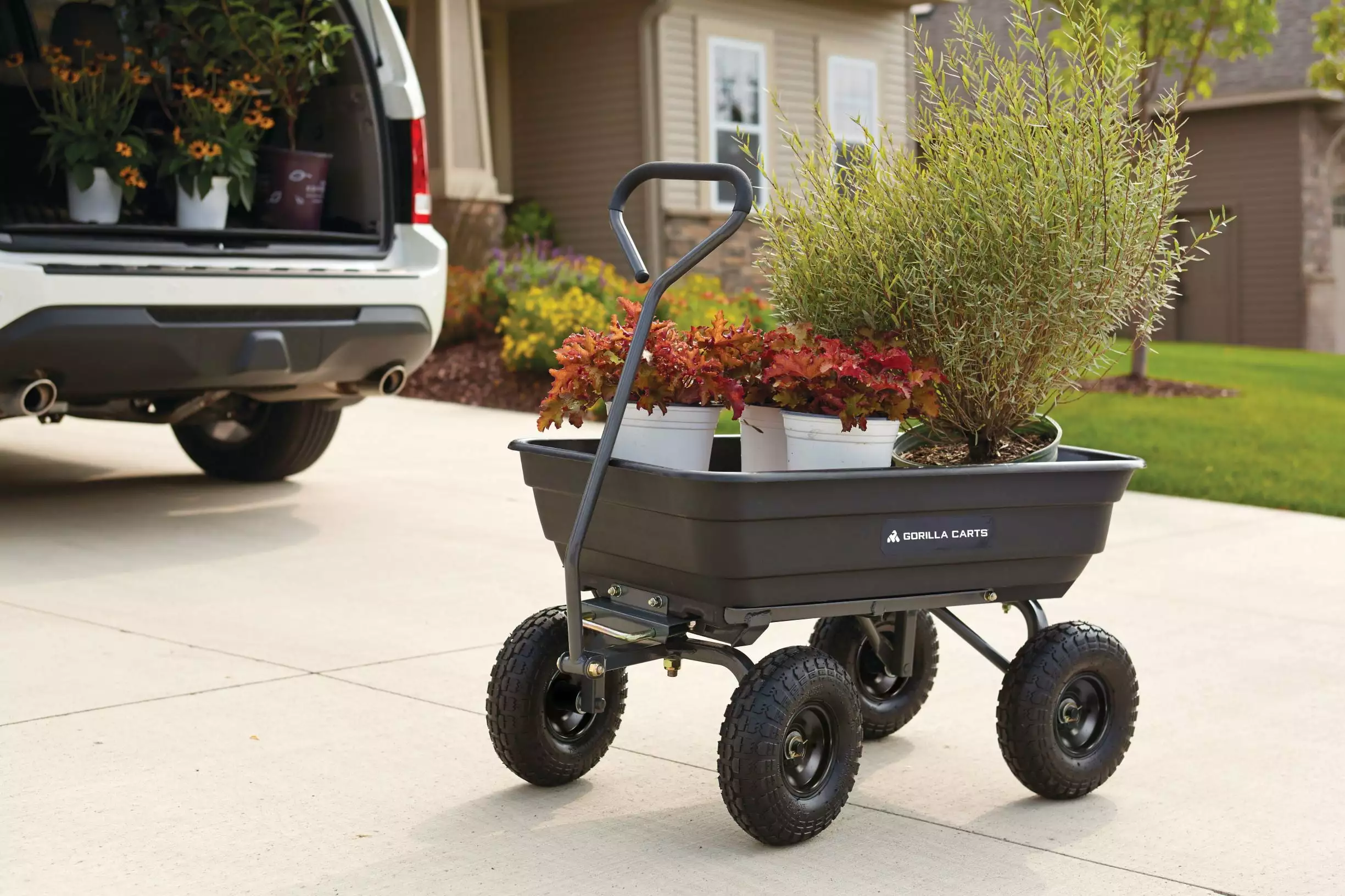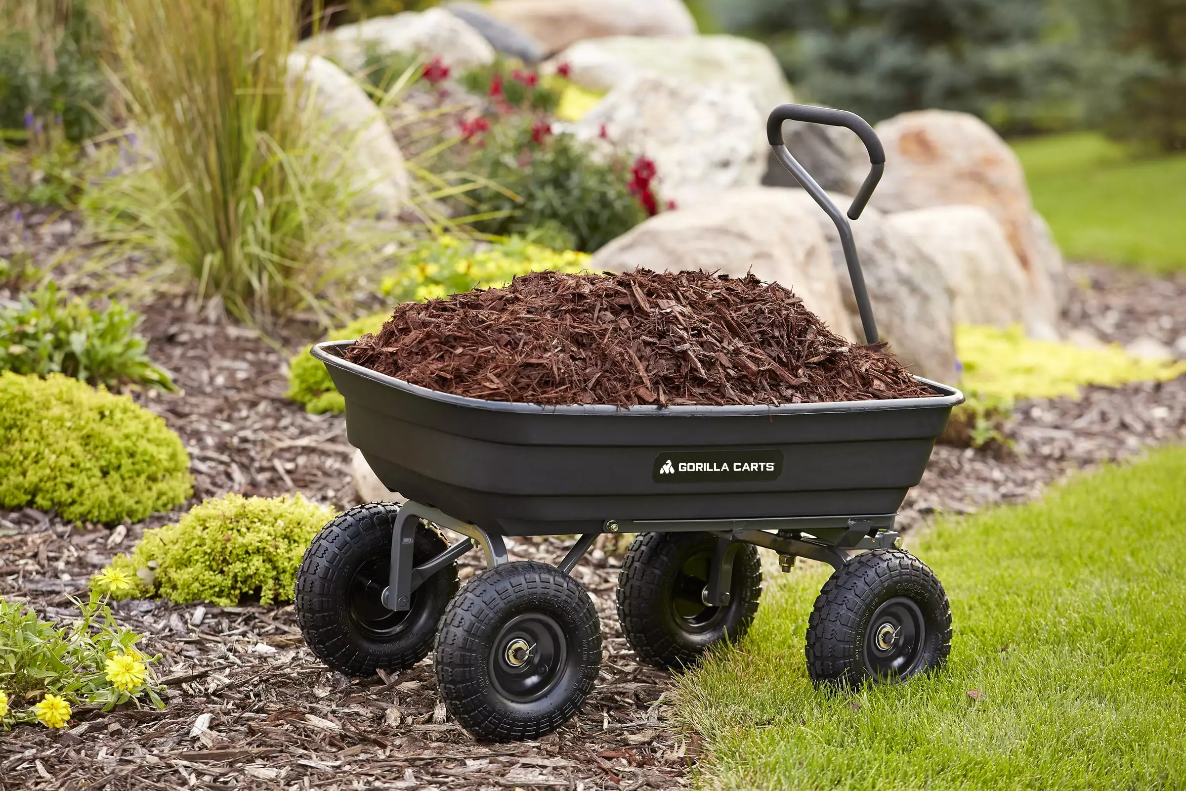The newly-designed Gorilla Carts 600-lb. Capacity Poly Garden Dump Cart has an innovative. updated frame design that makes it quick and easy to assemble and put this cart to work. The cart features the patented quick-release dumping system. which allows the cart to be loaded and unloaded with ease. and the balanced 4-wheel design makes it a simple-to-use alternative to a wheelbarrow. The new frame design allows for easy assembly. while improving maneuverability and rigidity. increasing ground clearance. and giving the cart a tight turning radius. The durable poly bed is maintenance-free and easy to clean. and the 10 in. pneumatic tires are designed to handle any terrain whether you’re hauling heavy dirt. mulch. gravel. or plants. With a 600 lb. hauling capacity and padded dipped-grip handle. this cart is perfect for the casual gardener or the lawn professional. The bed dimensions measure 36-inches by 20-inches. and the cart has an overall height of 19.5-inches and weighs 32-pounds. Gorilla Carts full line of products meets the needs of the light-duty homeowner as well as the commercial-duty professional user by offering a wide variety of carts in different sizes and weight capacities. The Gorilla Carts GOR4PS Poly Garden Dump Cart comes with a 1-year limited warranty.