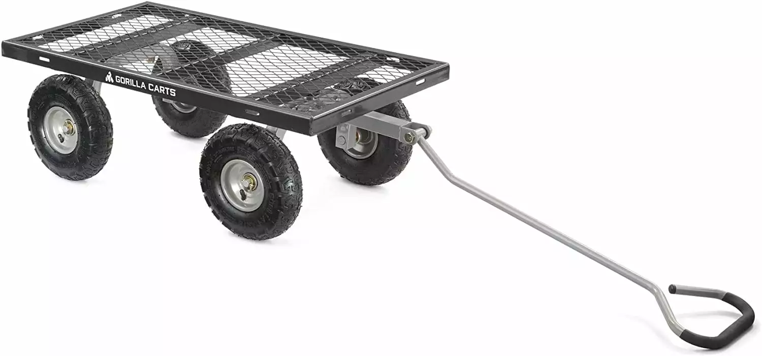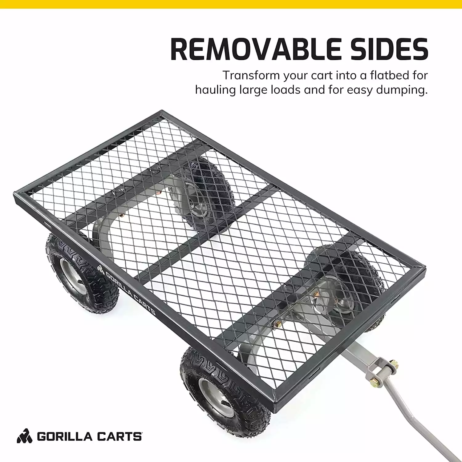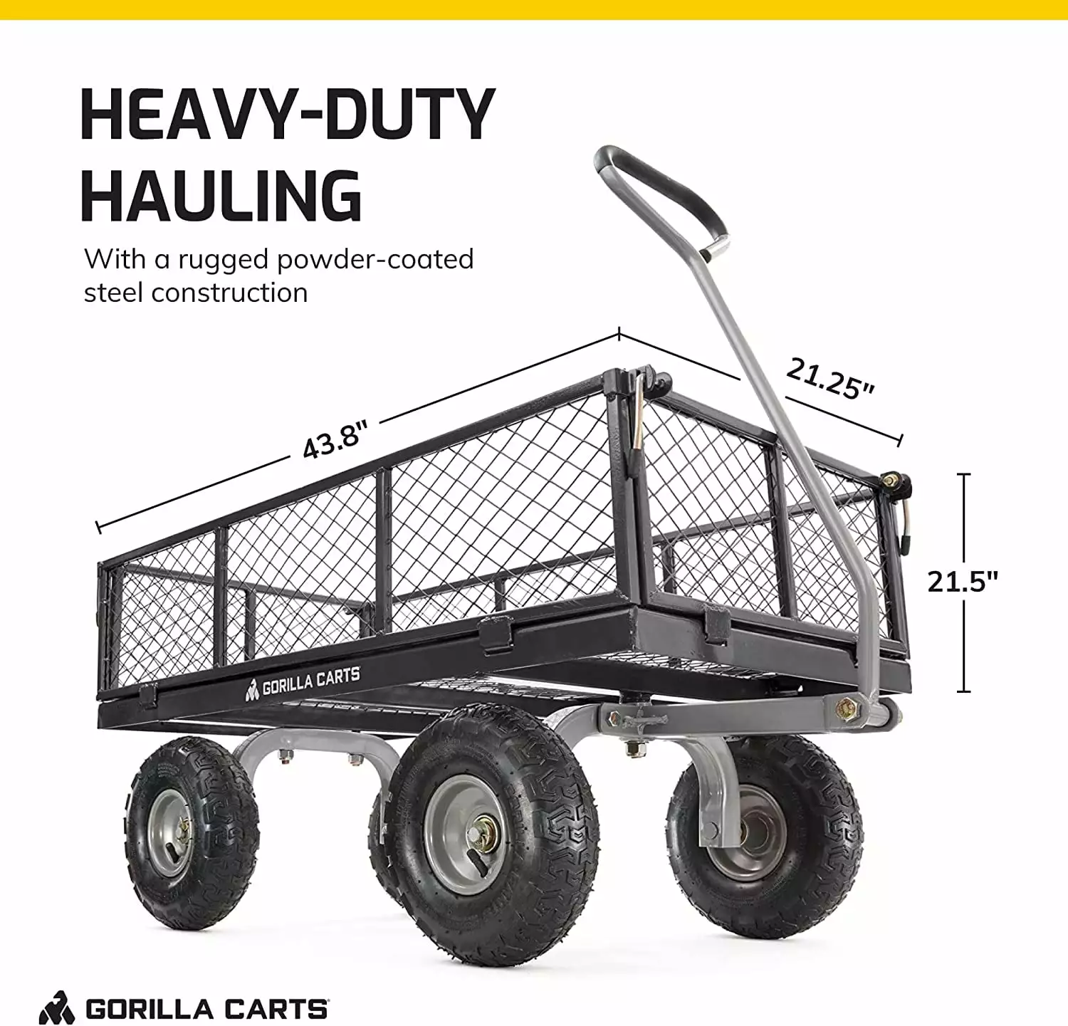 Whether it’s hauling chopped wood or fertilizer. carry them all in the Gorilla Carts 4-Cubic Feet Steel Utility Wagon. This strong cart with wheels can carry up to 800 pounds worth of items for the maximum hauling experience. This versatile. heavy duty wagon features a long handle that provides comfort and convenience when going from place to place so you can say goodbye to stressful hauling. With removable sides. you can enjoy customizing the gorilla cart wagon to your needs and have even more room for bigger loads. With a weight capacity of 800 pounds. this wagon cart is suitable for rugged use around the lawn. garden. and more. The rolling cart wagon includes durable. 10-inch pneumatic wheels that make it easy to maneuver across any terrain. great for doing work around the farm or as a camping wagon to haul all your gear across the camping grounds. You can also use this as a camping cart. beach wagon. all-terrain wagon. garden cart on wheels. or even a cart for groceries. Constructed from heavy-duty powder-coated steel. the pull cart features the utmost durability for long-lasting use. Measuring 43.8 inches long. 21.25 inches wide. and 21.5 inches tall. you can haul all kinds of yard essentials. tools. firewood. and more in this metal wagon. Easily store the heavy duty cart in your garage or another storage area when you are done with a hard day’s work. All you need to do is a little pulling and the Gorilla Carts Steel Utility Cart will do the rest.