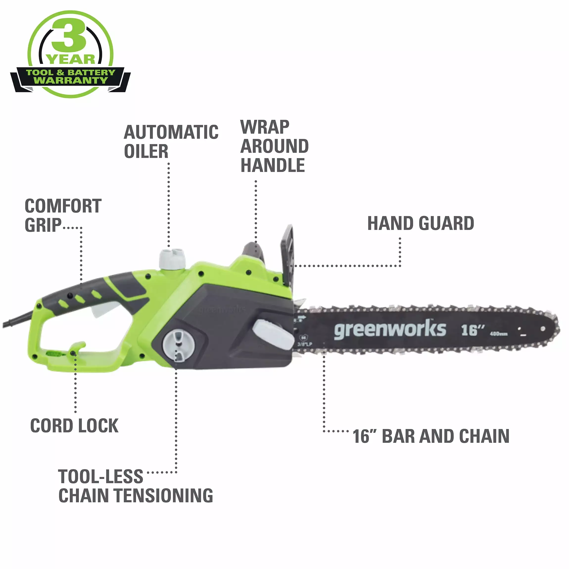 Features of Greenworks 12 Amp 16 in. Corded Electric Chainsaw: