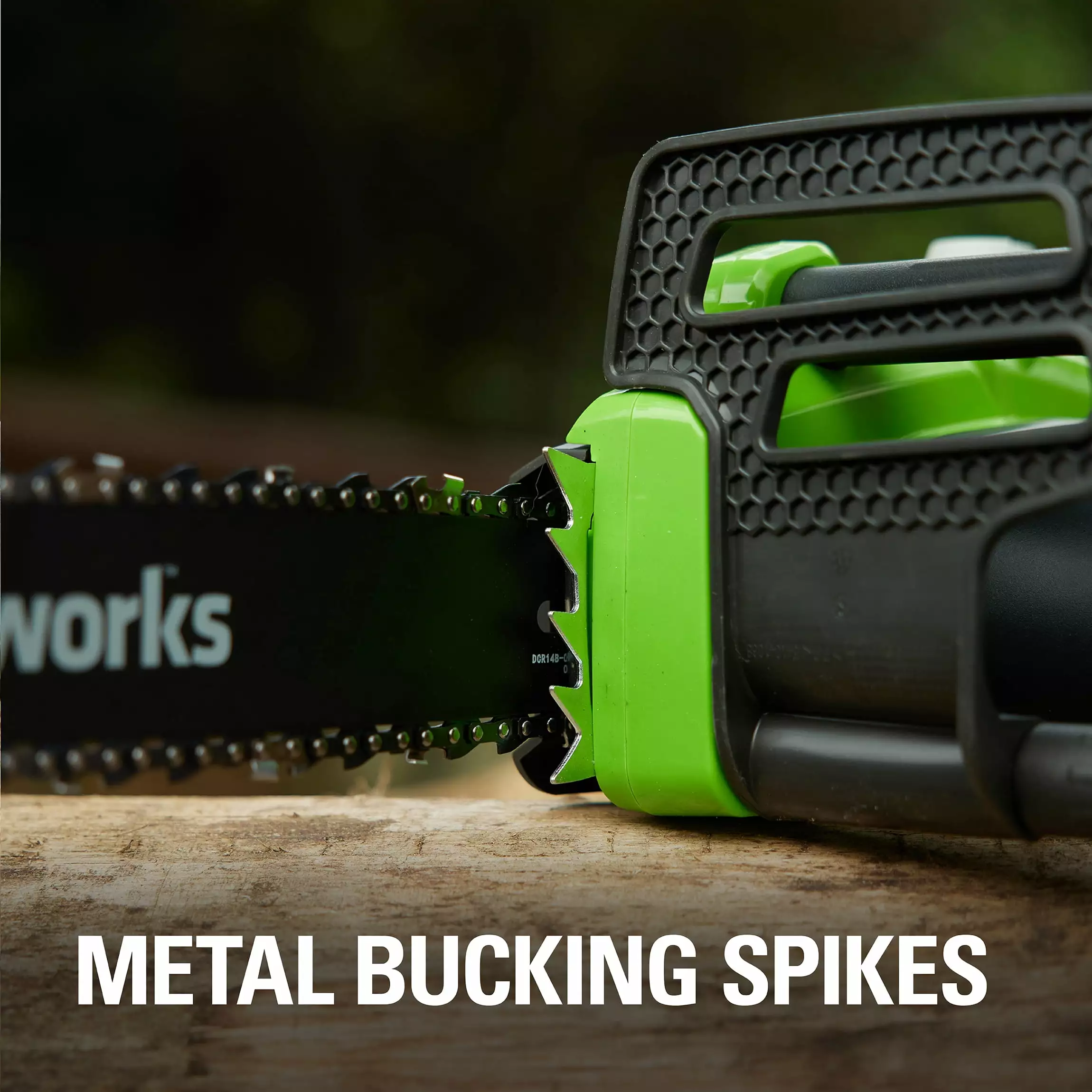 - Metal bucking spikes provides added grip while felling a tree