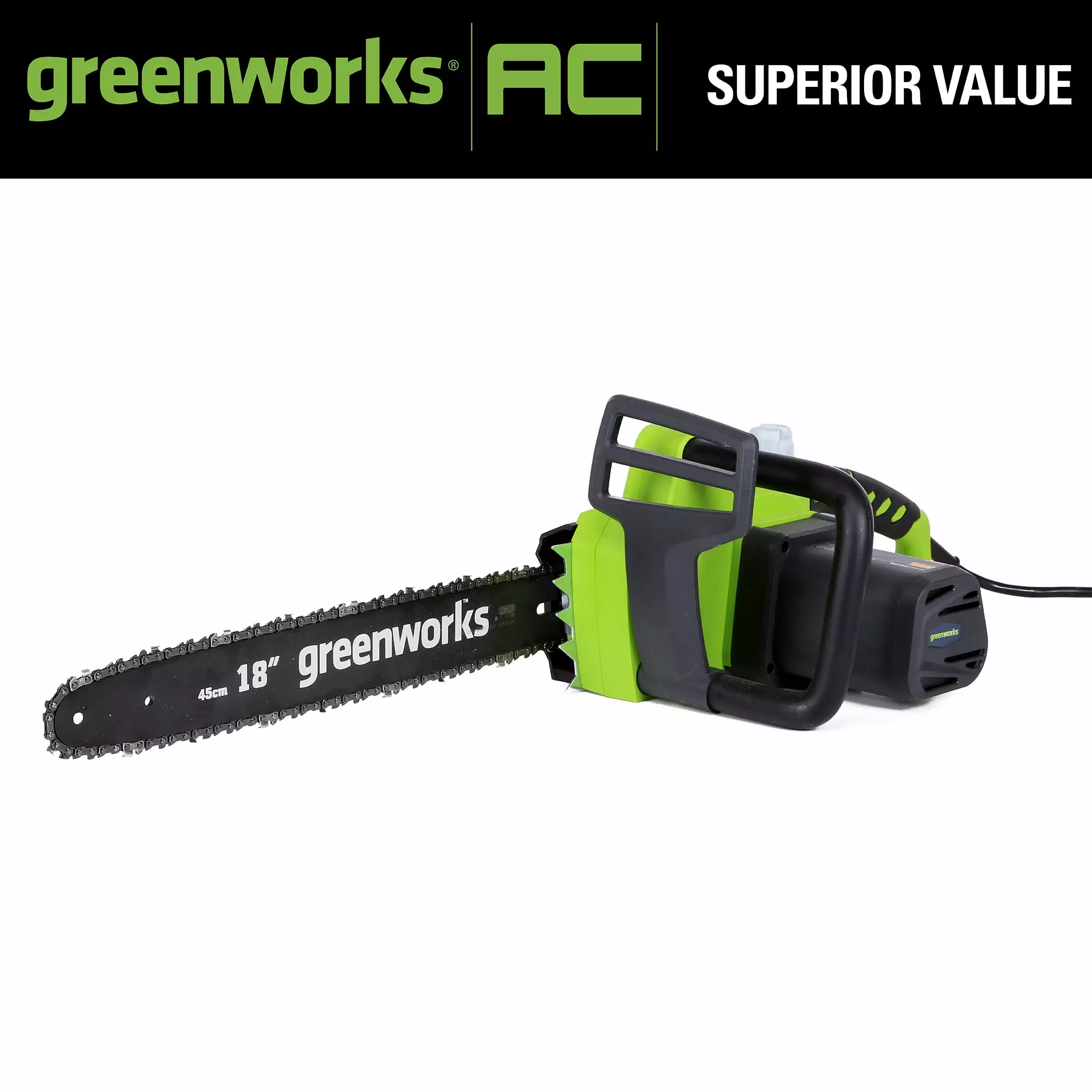 Greenworks 145 Amp 18" Corded Electric Chainsaw. 20332. The Greenworks 24V POWERALL? lithium-ion platform powers 125+ indoor & outdoor products. including lawn mowers. blowers. string trimmers. chainsaws. power tools and more! Our 24V lithium-ion battery provides 20% more power and 35% more run-time. and delivers fade-free power with no memory loss after charging. The outdoor power equipment is ideal for tackling yards up to 1/3 acre. The Greenworks 24V POWERALL platform comes with a 3 Year Limited Tool & Battery Warranty to protect your investment. 10" bar and chain. perfect for cutting branches and limbs with ease. Tool-less chain tensioning for quick adjustments so you can get back to the task at hand.Automatic oiler applies oil to the bar and chain to ensure durability and extend the life of the chain.Hassle free push button start.Translucent oil tank for clear view of oil level.