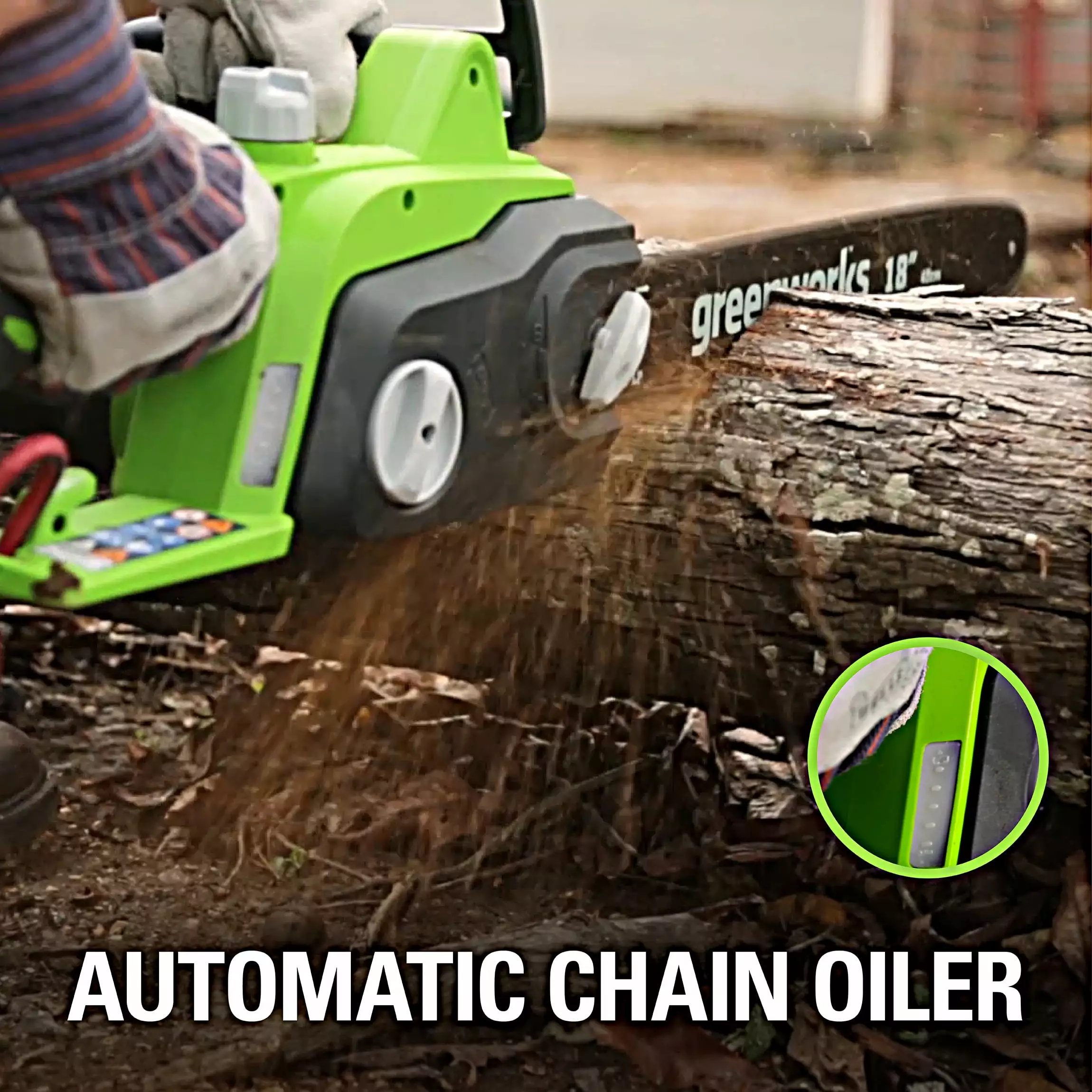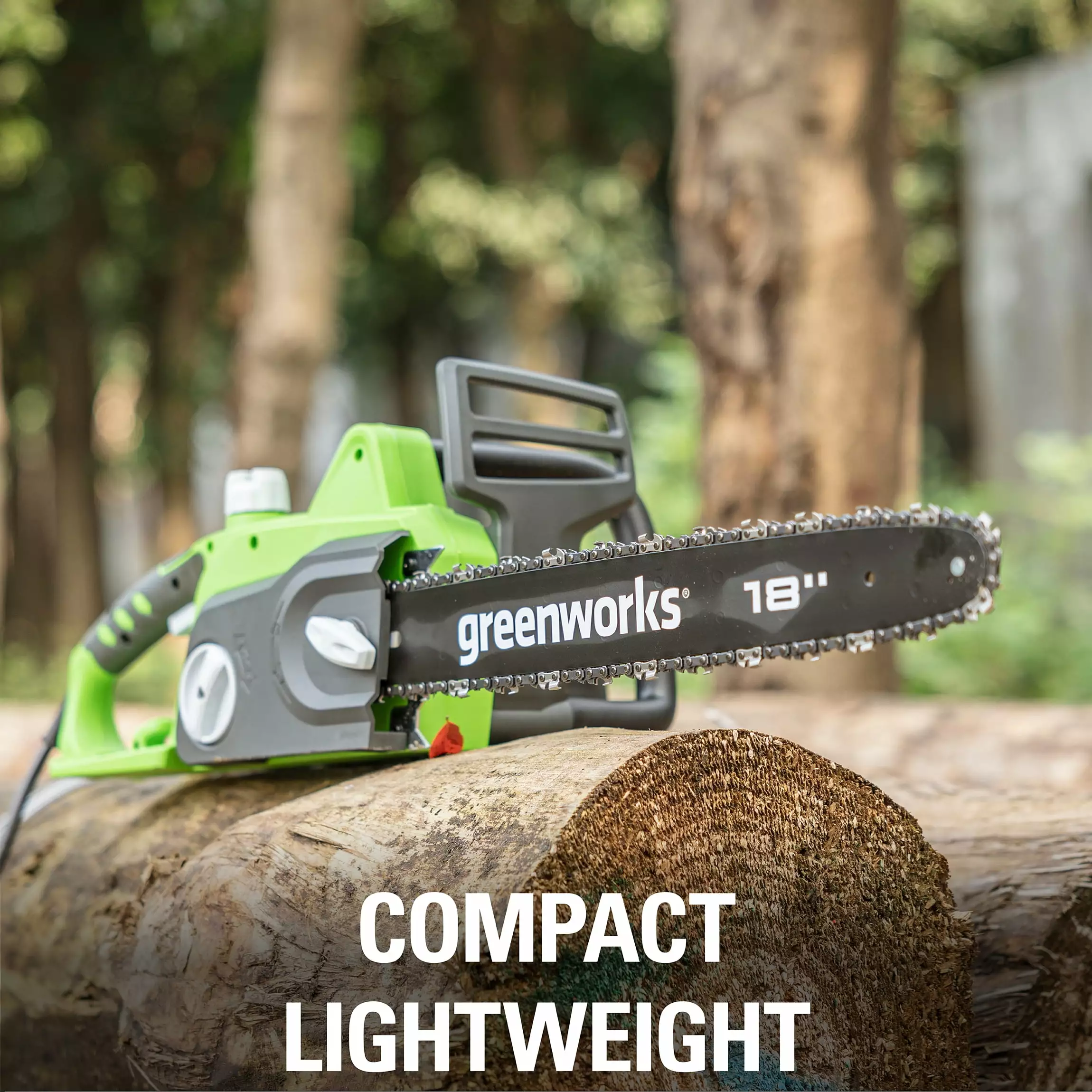- Greenworks Chain Saw. 18 Oregon bar and chain. ideal for cutting branches and logs