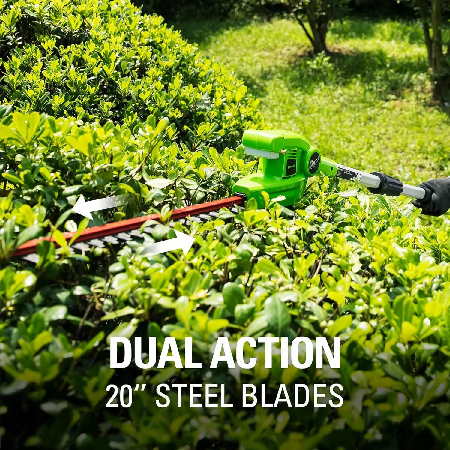 Achieve precise and effortless hedge trimming with the Greenworks 40V 20 Battery Powered Hedge Trimmer. Its 20 steel dual action blade ensures optimal performance and long-lasting durability. Tackle bushes and hedges with ease. thanks to the trimmer’s 5/8 cutting capacity. eliminating the need for multiple tools. The package includes a 20 Pole Hedge Trimmer. a 2.0 Ah Battery. and a Battery Charger. providing everything you need to maintain well-groomed landscapes and achieve controlled. smooth trimming effortlessly.
