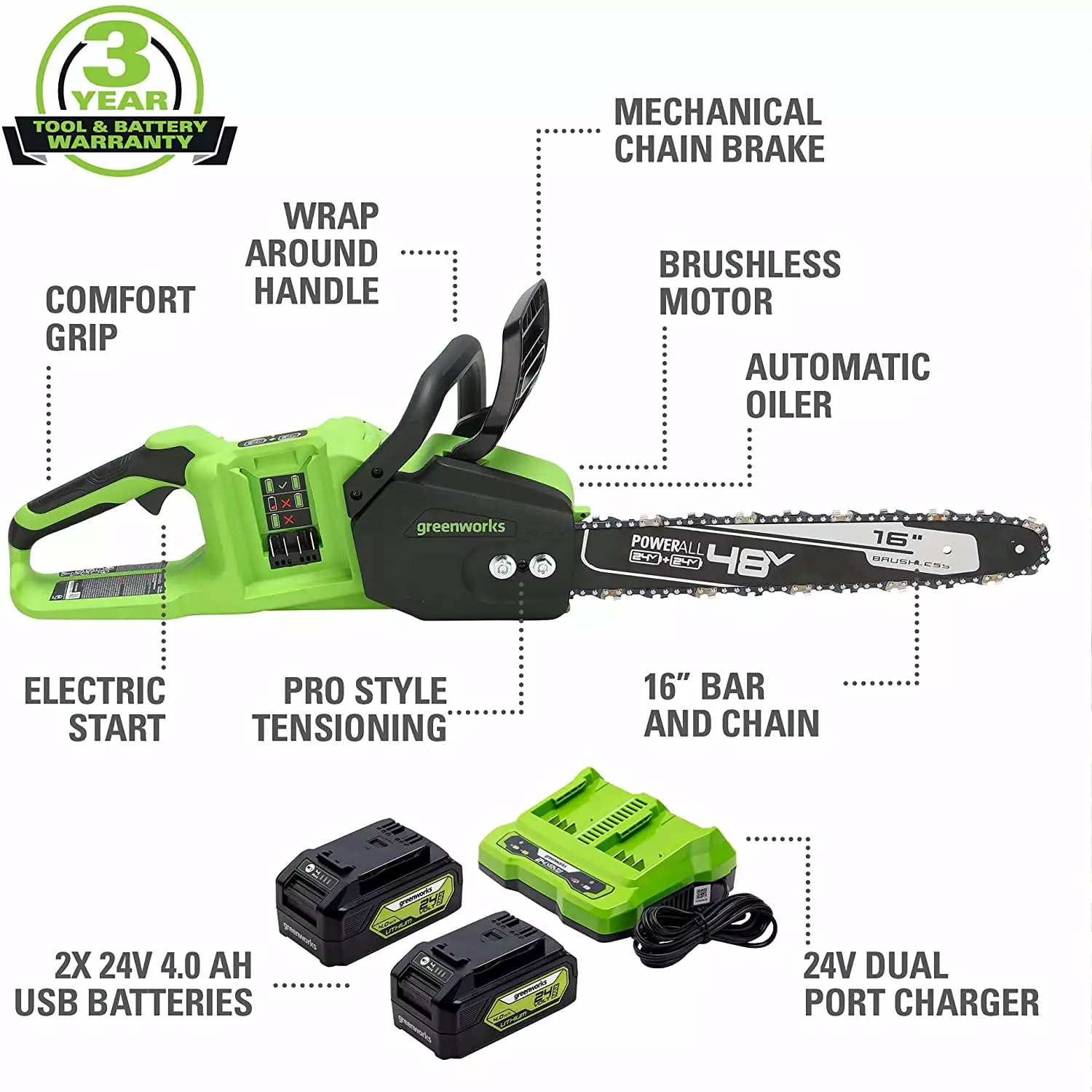 Greenworks 48V (2x24V) 16-inch Brushless Chainsaw with (2) 4Ah USB Batteries and Dual Port Charger. 2018002