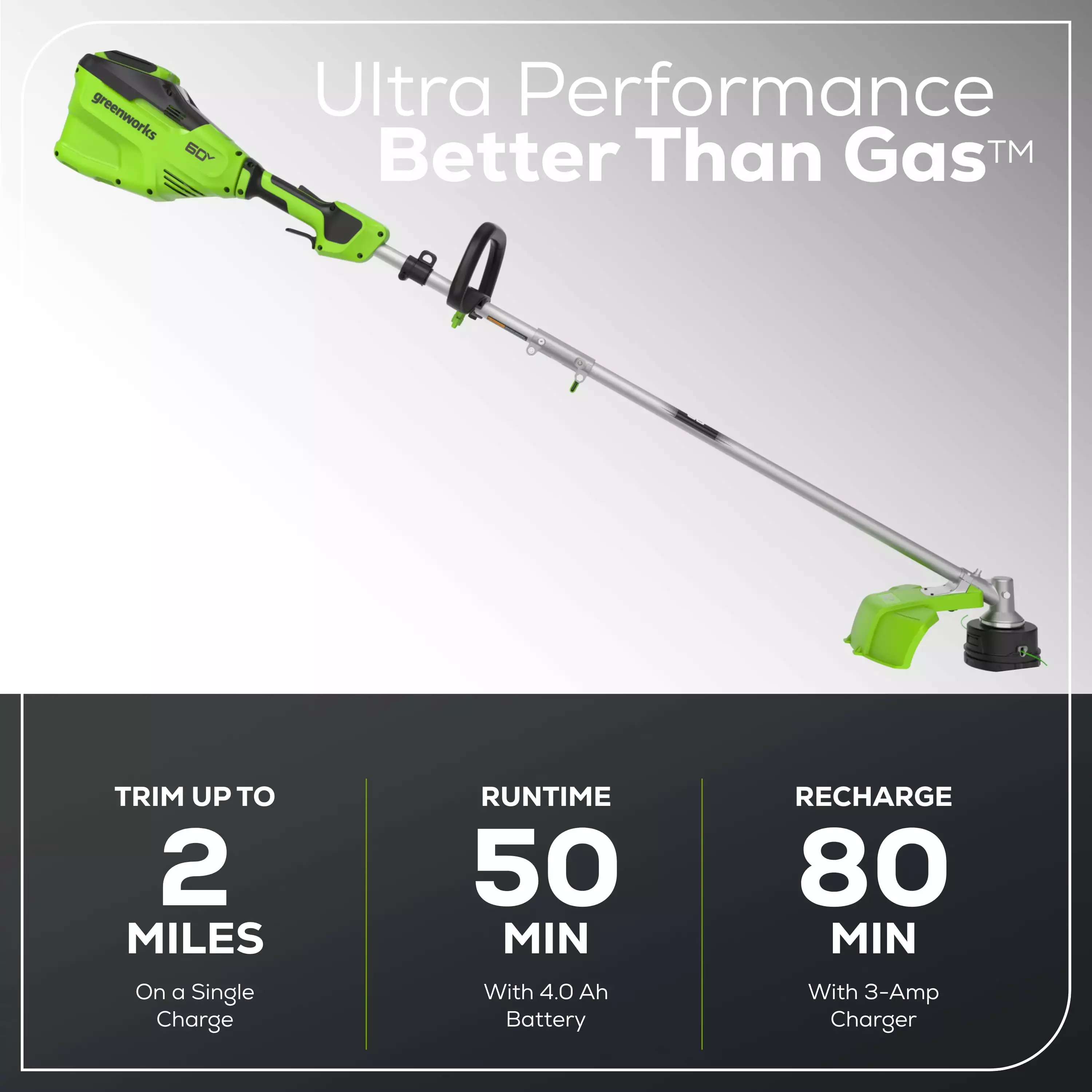 - Battery Platform: Battery powers 75+ 60V Greenworks products