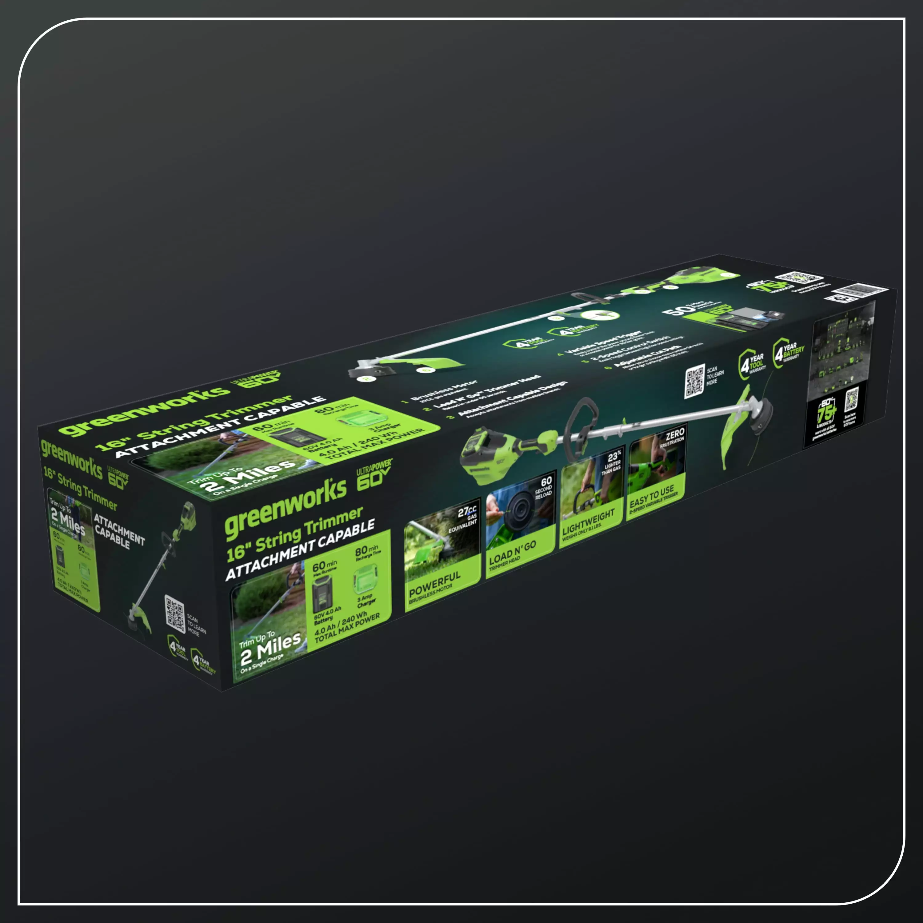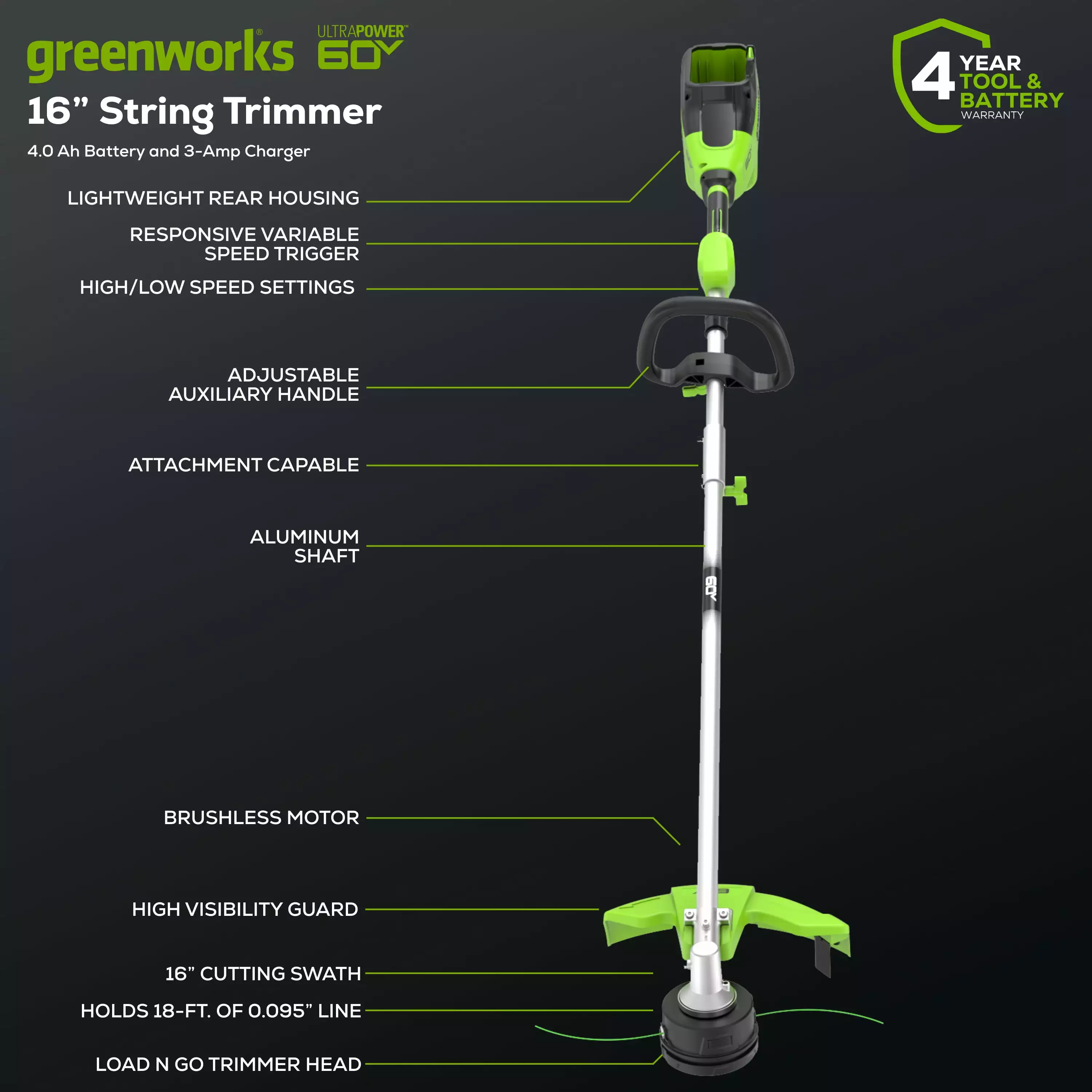 The Greenworks 60V 16 Top Mount String Trimmer with 4.0 Ah Battery & 3 Amp Charger is a powerful and intelligent trimmer that offers exceptional performance. It is part of a comprehensive range of residential outdoor power equipment. With a top speed of 6.000 RPM. it delivers more power than other gas trimmers. The advanced load sense technology ensures that the trimmer never bogs down and senses when more power is required for a perfect cut every time. It features a compact top mount brushless motor. allowing for the use of different universal attachments for various lawn applications. The trimmer can run for up to 50 minutes on a single 4.0 Ah battery and offers continuous runtime with interchangeable batteries. The included 3 Amp charger can recharge the 4.0 Ah battery in 80 minutes or less. The Greenworks brushless motor makes the trimmer quieter than gas trimmers. reducing noise pollution. It is also lightweight. weighing only 9.15 lbs.. and has low vibration. reducing fatigue during prolonged trimming sessions. With a Load-N-Go trimmer head that holds up to 18′ of 0.095 spool. loading line becomes quick and easy. By choosing the Greenworks 60V trimmer over gas trimmers. you can save over $400 in a five-year span. There is no need to buy gasoline. oil. filters. spark plugs. or fuel lines. eliminating the need for engine maintenance and downtime. Additionally. it is environmentally friendly. with no fumes or emissions. Overall. the Greenworks 60V 16 String Trimmer offers outstanding performance and efficiency. allowing you to work smarter and save time. money. and energy. Includes 4.0 Ah lithium-ion battery. 3 Amp charger. Battery is compatible with 75+ Greenworks Pro 60V products.