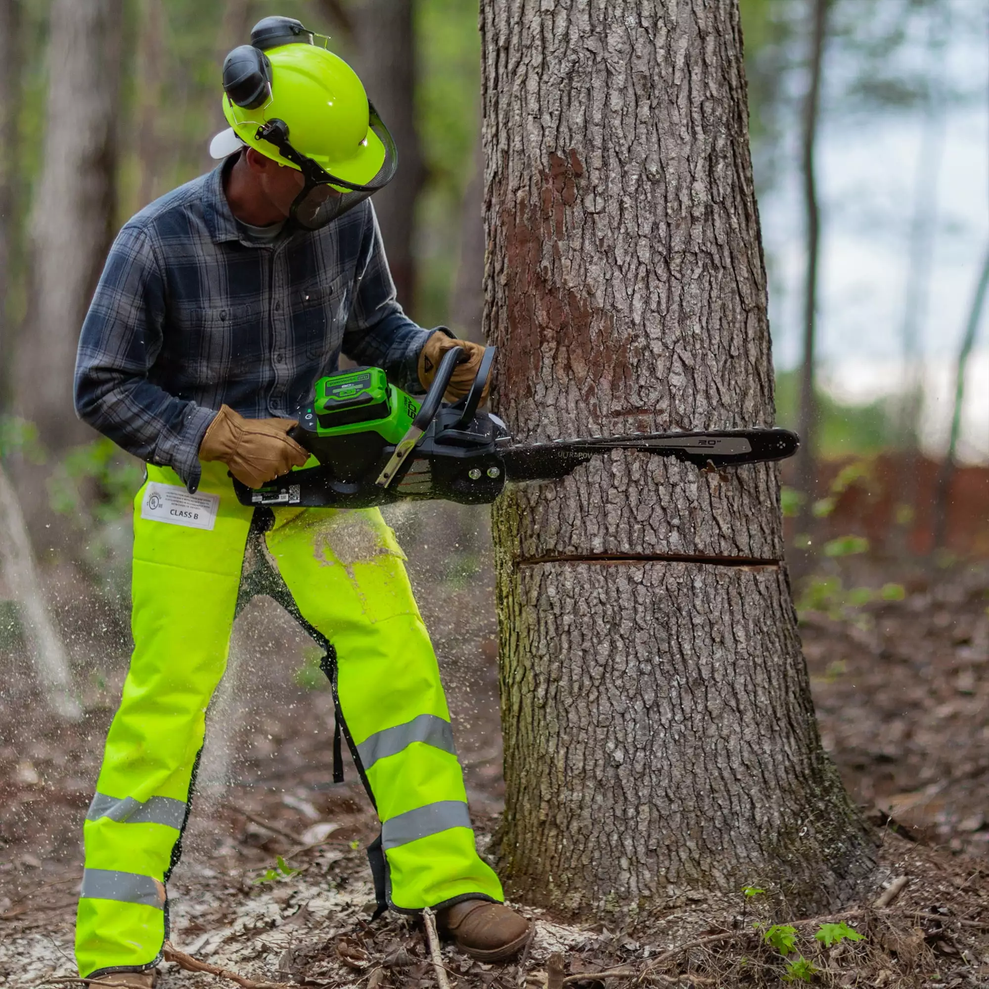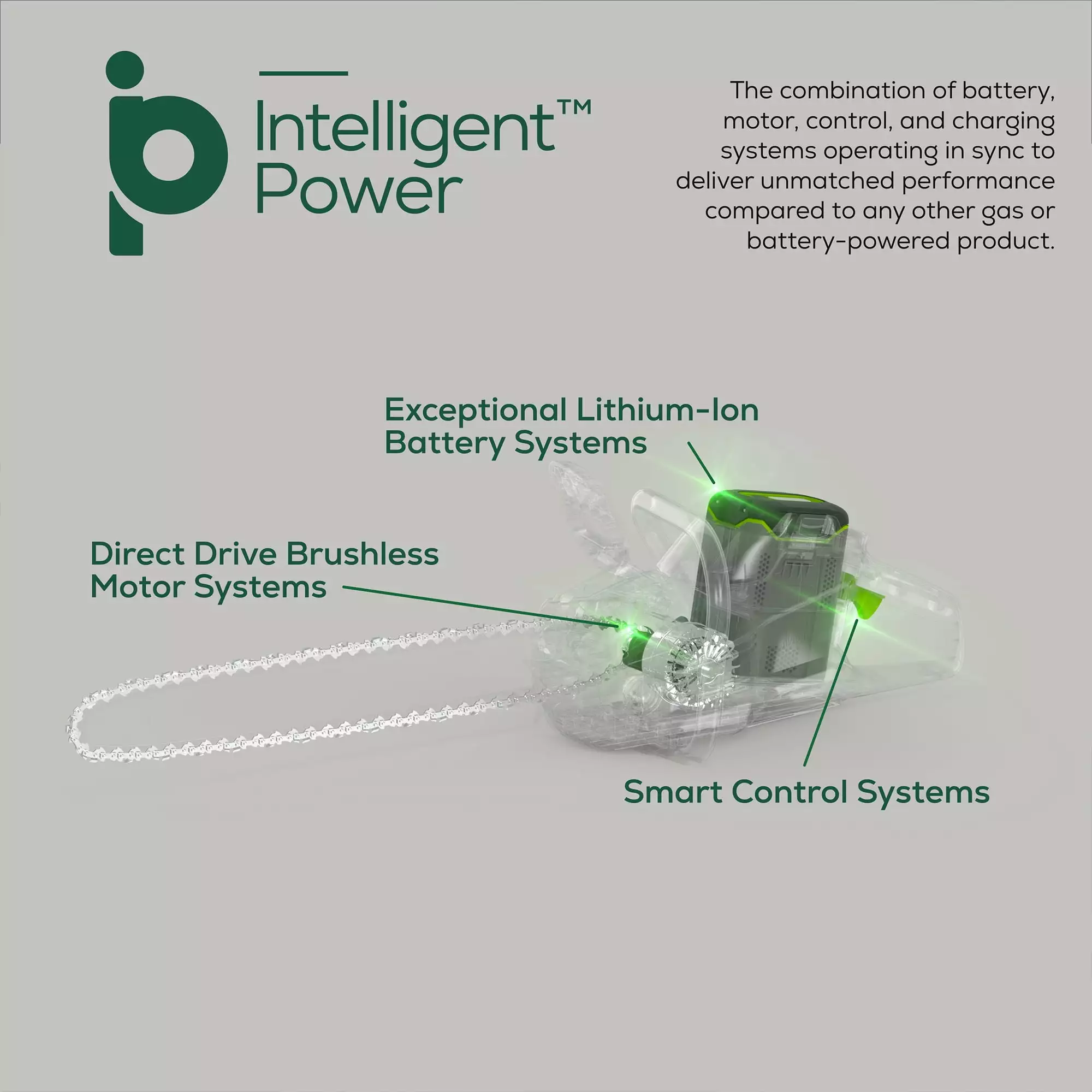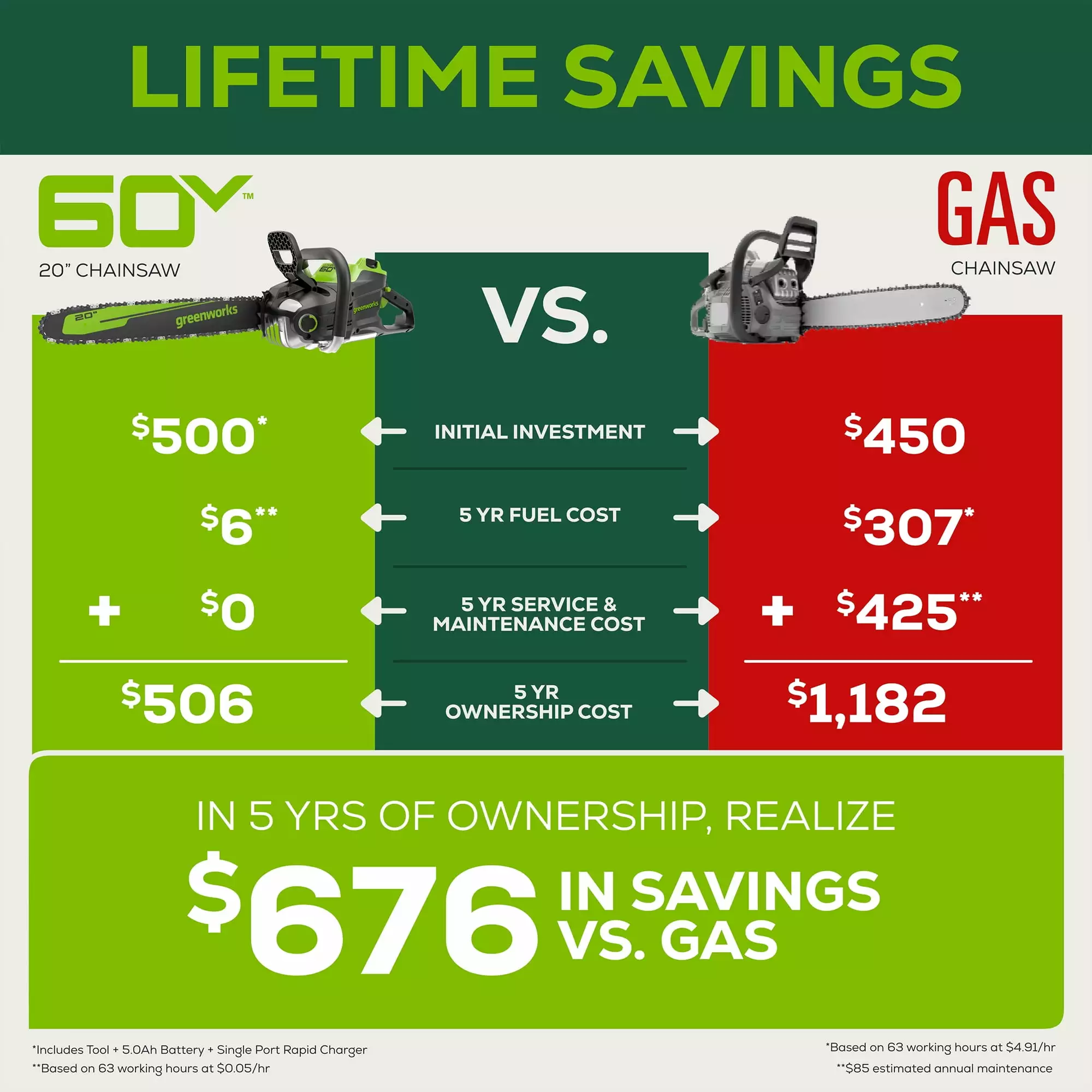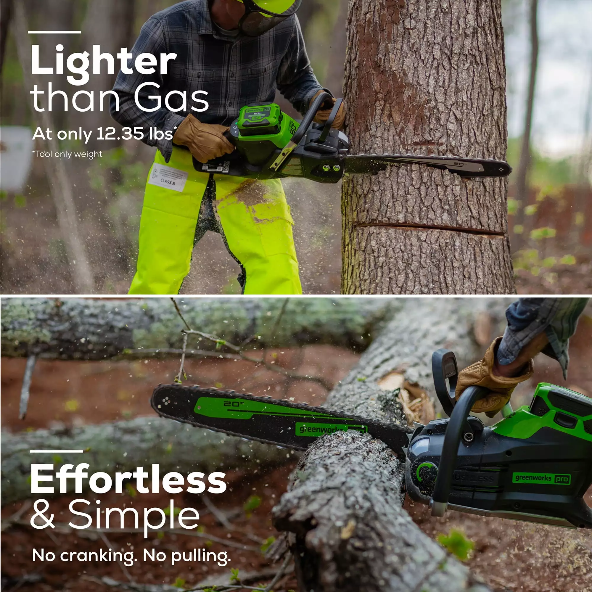 Powered by a Greenworks Pro 60V UltraPower? lithium-ion battery. this Greenworks Pro cordless chainsaw delivers the power and performance of typical gas-powered saws. without the noise. fumes. or harmful emissions. The battery-powered brushless motor delivers 20% more torque and faster cutting than a 60cc gas-powered chainsaw. and it features our No Prime. No Choke. No Pull- easy-starting system for fast starts every time. with no aggravating pull cord. This lightweight cordless chainsaw is equipped with an 20" bar and chain. pro-style side-mounted chain tensioning for easy bar and chain maintenance. automatic chain oiler. transparent oil fill window. and inertia-activated chain brake. The powerful Greenworks Pro 60V UltraPower? cordless battery platform gives you all the power you need to tackle all your lawn care projects. Kick gas to the curb this spring and go green with no fumes. no mixing. no maintenance and no pull cords. Let Greenworks help you take the work out of yard work.