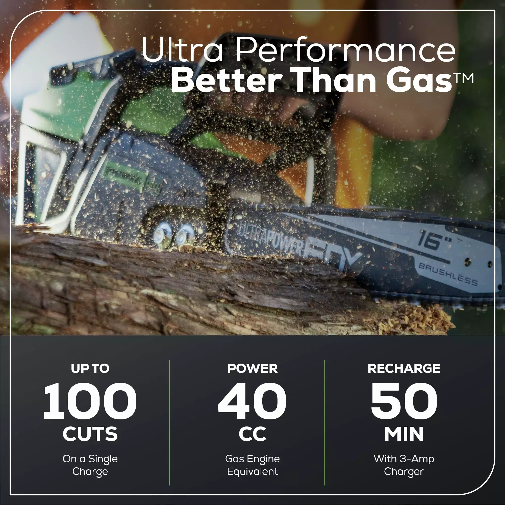 Powered by a Greenworks Pro 60V UltraPower? lithium-ion battery. this Greenworks Pro cordless chainsaw delivers the power and performance of typical gas-powered saws. without the noise. fumes. or harmful emissions. The battery-powered brushless motor delivers 20% more torque and faster cutting than a 42cc gas-powered chainsaw. and it features our No Prime. No Choke. No Pull. easy-starting system for fast starts every time. with no aggravating pull cord. This lightweight cordless chainsaw is equipped with a 16-inch bar and chain. pro-style side-mounted chain tensioning for easy bar and chain maintenance. automatic chain oiler. transparent oil fill window. and inertia-activated chain brake. The powerful Greenworks Pro 60V UltraPower? cordless battery platform gives you all the power you need to tackle all your lawn care projects. Kick gas to the curb this spring and go green with no fumes. no mixing. no maintenance. and no pull cords. Let Greenworks help you take the work out of yard work.
