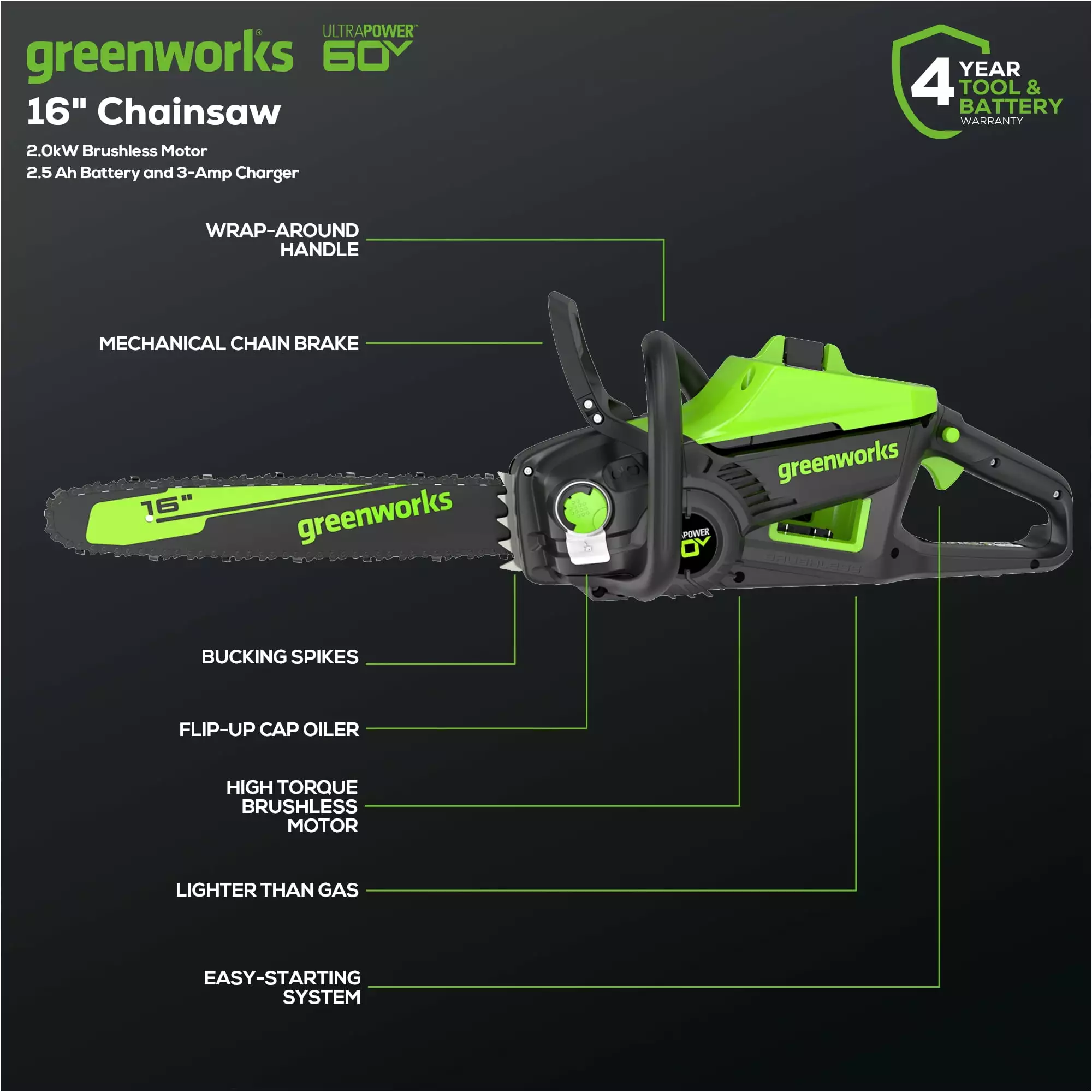 Greenworks Pro 60V 16 in. Brushless Cordless 2kW Chainsaw with 2.5 Ah Battery and Charger
