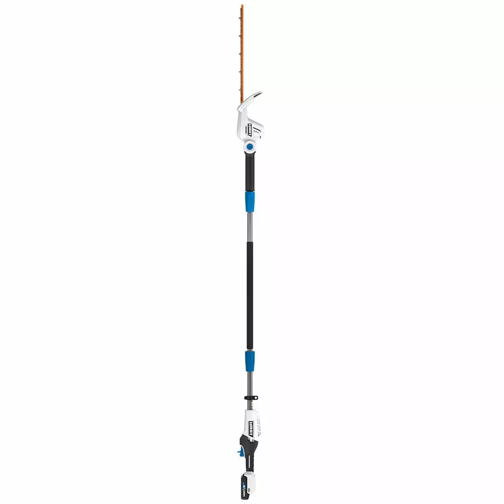 Have you ever tried trimming a tall hedge with a hedge trimmer while balancing on a ladder? Not fun at all. That’s why you’ll love our 20V Pole Hedge Trimmer??it makes the process much easier and safer. The 5′-8′ pole extension helps to trim those hard-to-reach hedges with minimal strain on your back. It also features 18" dual-action blades for reduced vibration and a 5/8 cut capacity for seamless trimming. And because tall hedges can have a mixture of odd angles. heights and different hedge shapes. this trimmer provides the solution with its pivoting head a. which allows for easier cuts at multiple angles. If you also factor in the rear comfort grip handle that helps minimize user fatigue and the instant starting motor. you’ve got yourself the best tool for trimming tall hedges. Includes: Pole Hedge Trimmer Attachment. intermediate shaft. power head. blade cover. shoulder strap. 2.0Ah Lithium-ion battery. fast charger and operator’s manuals.