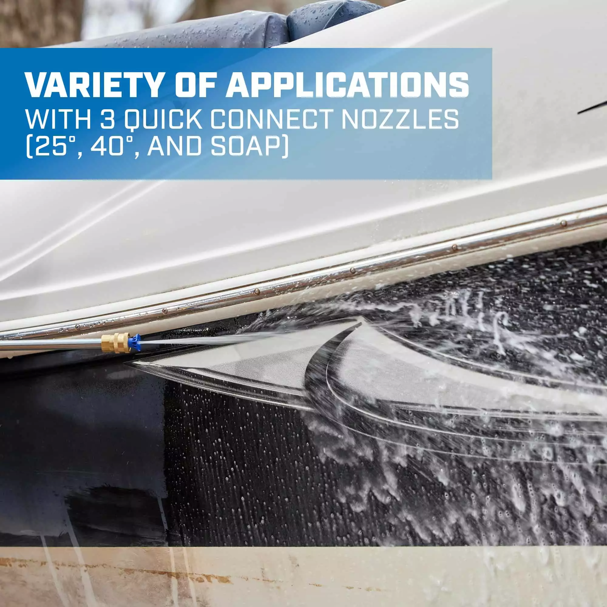 HART 2500 PSI Gas Pressure Washer is designed for heavy-duty cleaning. it features a powerful 212CC engine and 2.5 GPM water flow for maximum performance. With its 25′ high pressure hose you can reach tight spots. and with three quick connect nozzles (25°. 40°. soap) you have everything you need to get any hard-to-reach dirt easily removed. Not to mention on-board accessory storage and 10" flat free wheels that make it easy to move anywhere you need it around your home. It’s the perfect combination of strength and convenience in one product; plus covered by our limited 3 year warranty so you know you’re getting reliable quality.
