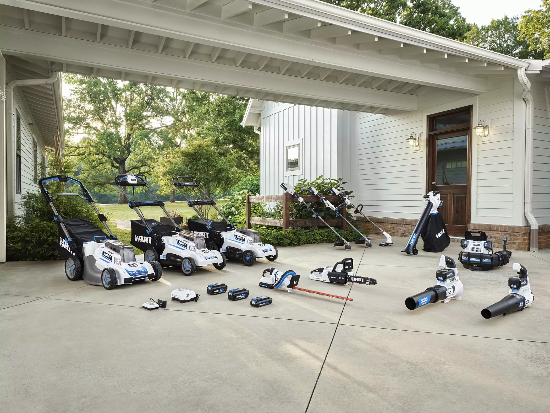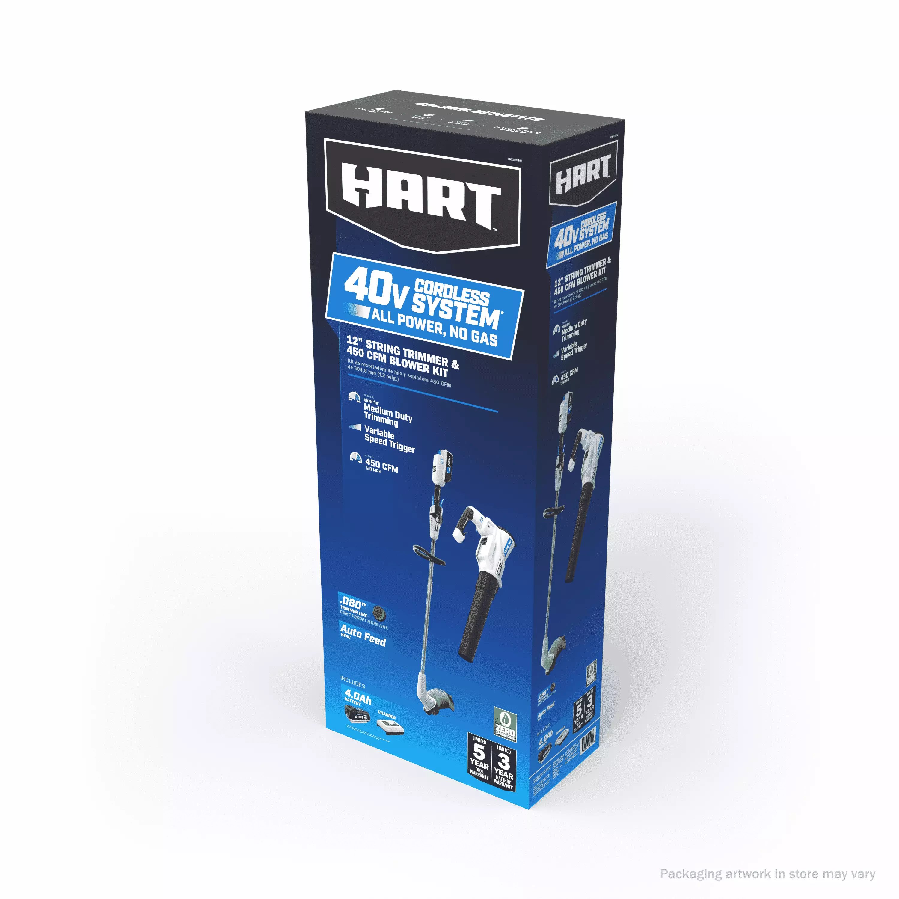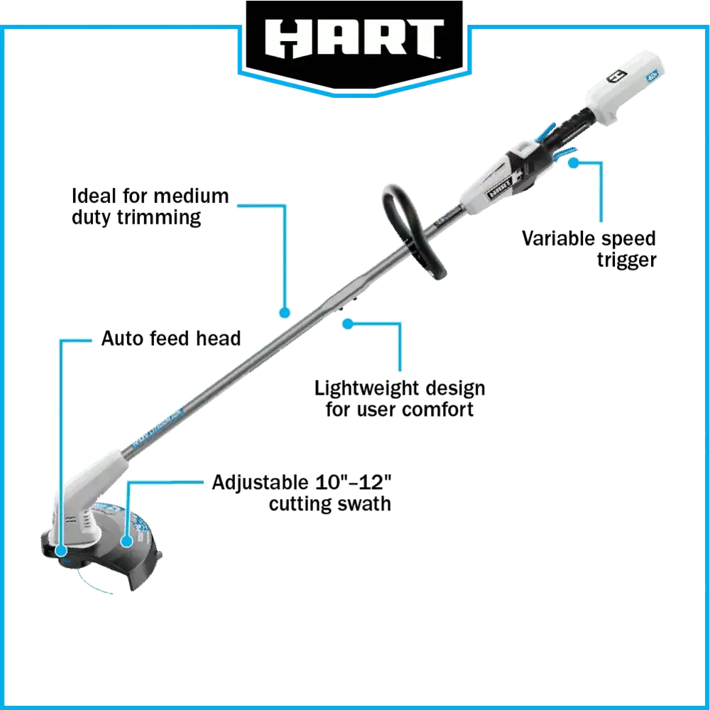 The HART 40-Volt String Trimmer/ Blower Combo Kit is a great pair to keep your yard looking its best. The battery-powered string trimmer features an auto-feed head that releases a 1/2-inch of line every time you press and release the trigger. So no bumping required! It also has a 10-inch to 12-inch cutting swath. The cordless blower delivers up to 120 MPH of wind force blowing at 450 CFM. making it ideal for hard surfaces and general yard cleanup. Both tools are designed to be lightweight for user comfort and have a variable speed trigger for ultimate control. Includes a 40-Volt lithium-ion battery. which provides more than enough runtime for all your yard work needs. All part of the HART 40-Volt System where you get ALL POWER. NO GAS?.