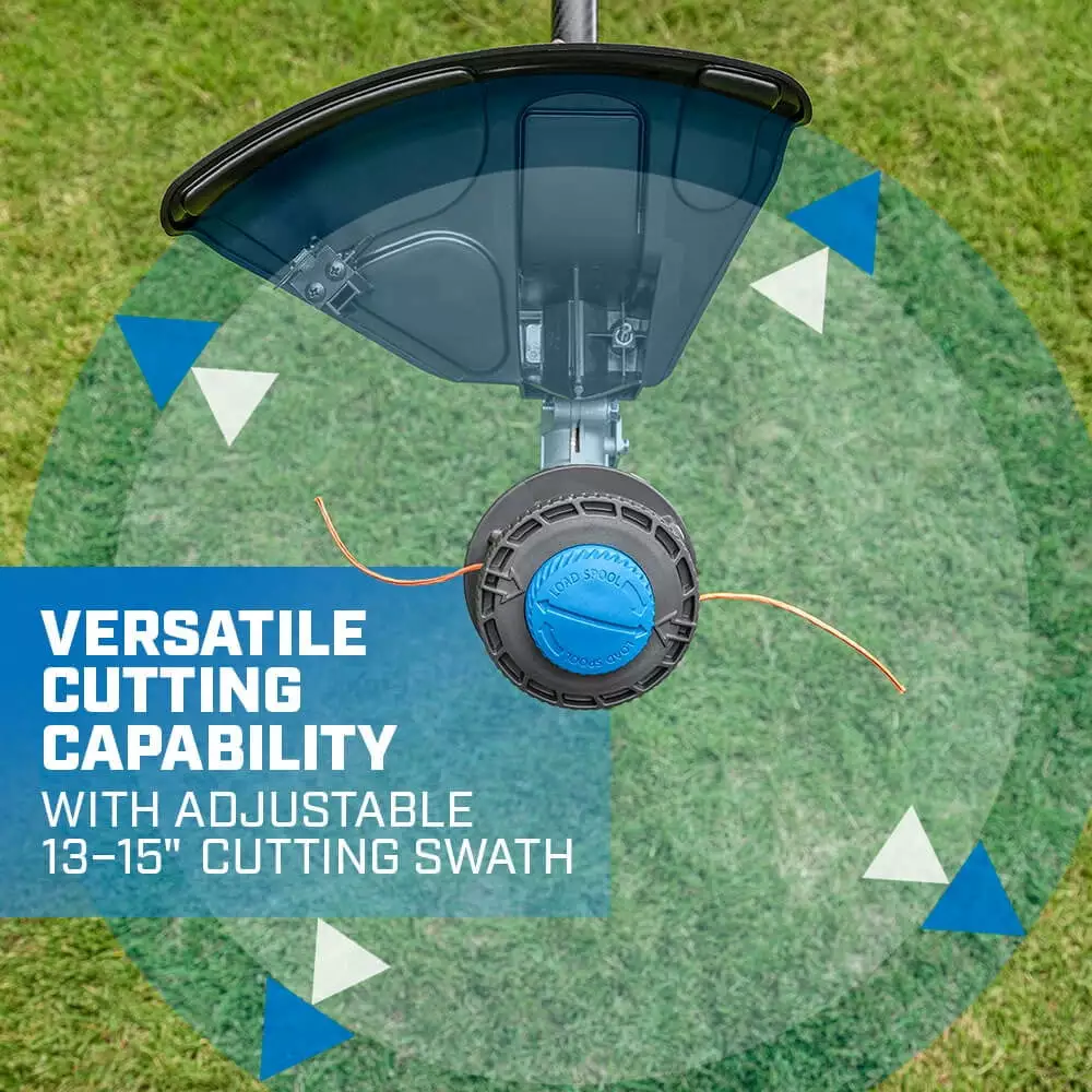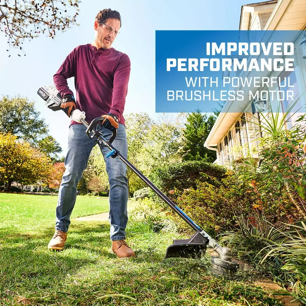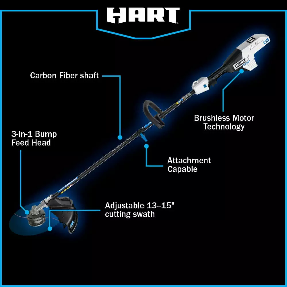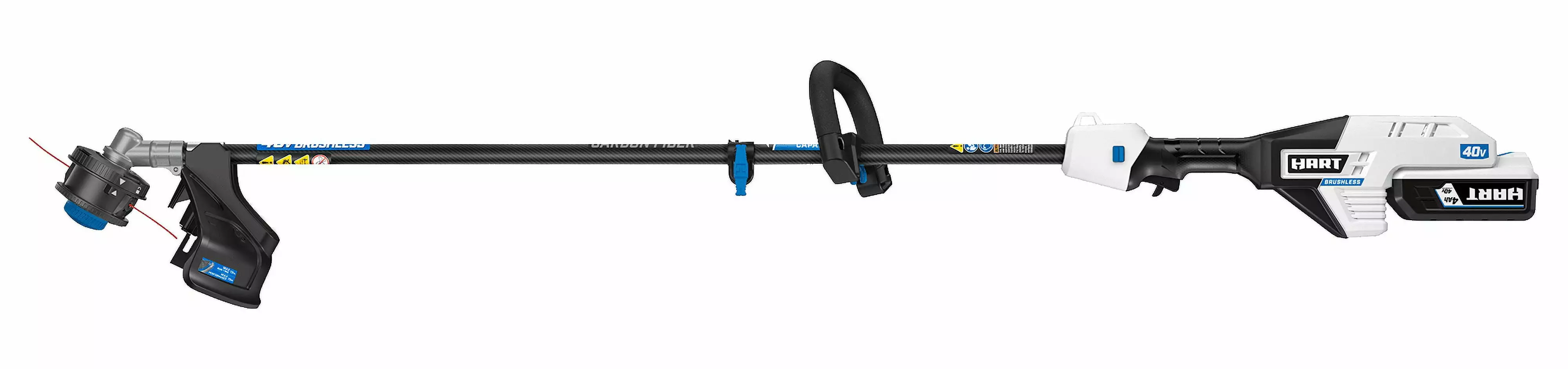 Great for heavy-duty trimmings. this electric 40V Brushless 15" SUPERCHARGE Carbon Fiber Shaft Attachment Capable String Trimmer delivers the power and runtime you need to take down thick weeds and heavy vegetation effortlessly. The carbon fiber shaft allows for lighter weight and increased durability. It features a 3-IN-1 Bump Feed with .095 line with an easy loading bump feed head along with an adjustable 13”-15” cutting swath. The included 40V Fast Charger charges the battery at 3x the speed of a standard 1.5Ah charger. When compared to a traditional gas string trimmer. this battery-powered unit is quieter and produces little vibration with zero emissions. (All important factors with regards to safety and fatigue.) Plus. it works with All HART 40V Batteries. In addition to the tool. battery. and charger. the kit also comes with a carbon fiber shaft and operator’s manuals. With HART. you get the cordless convenience you want with the gas performance you need. With powerful brushless motors. premium features. and fast charging. HART 40V SUPERCHARGE is the perfect choice for yards without compromise.
