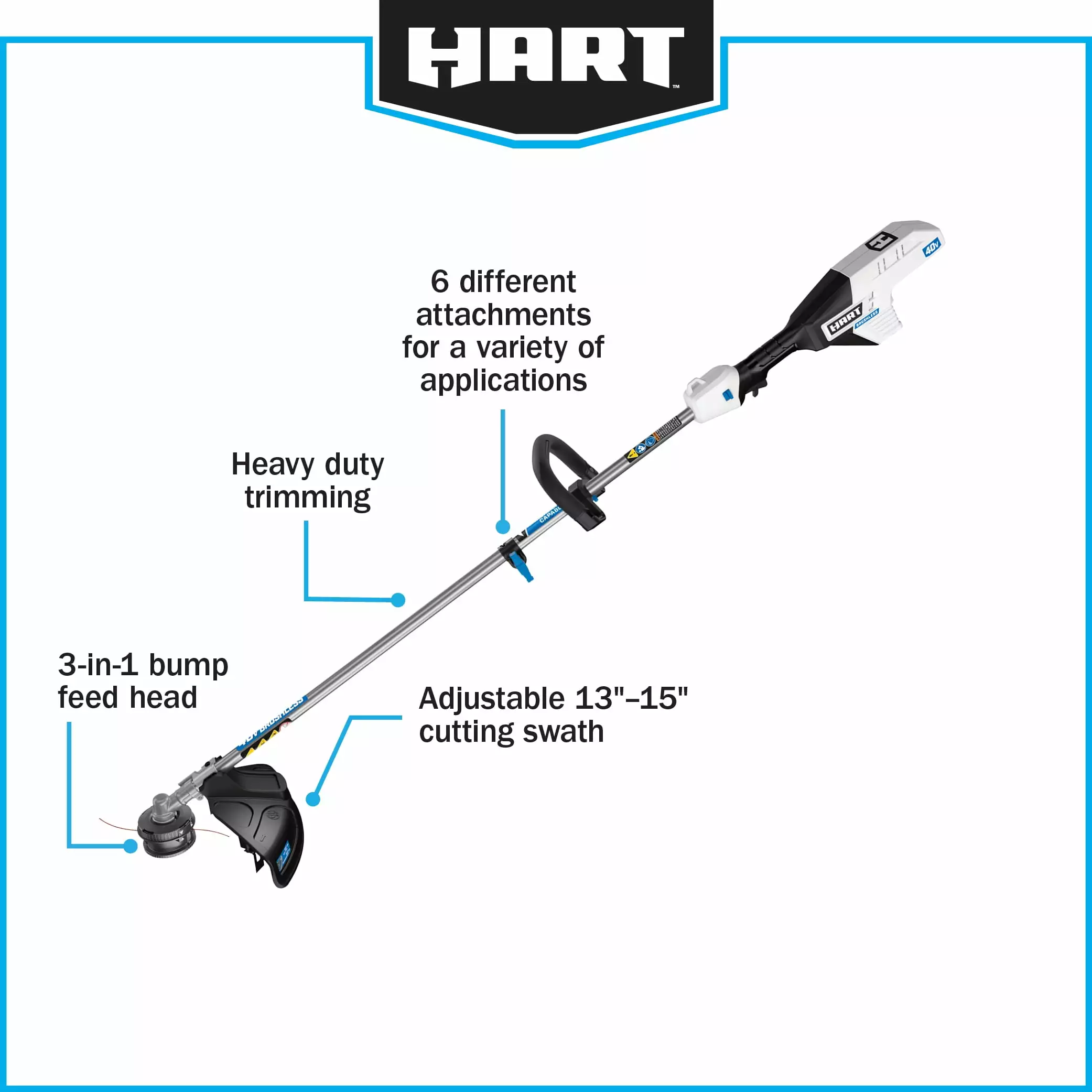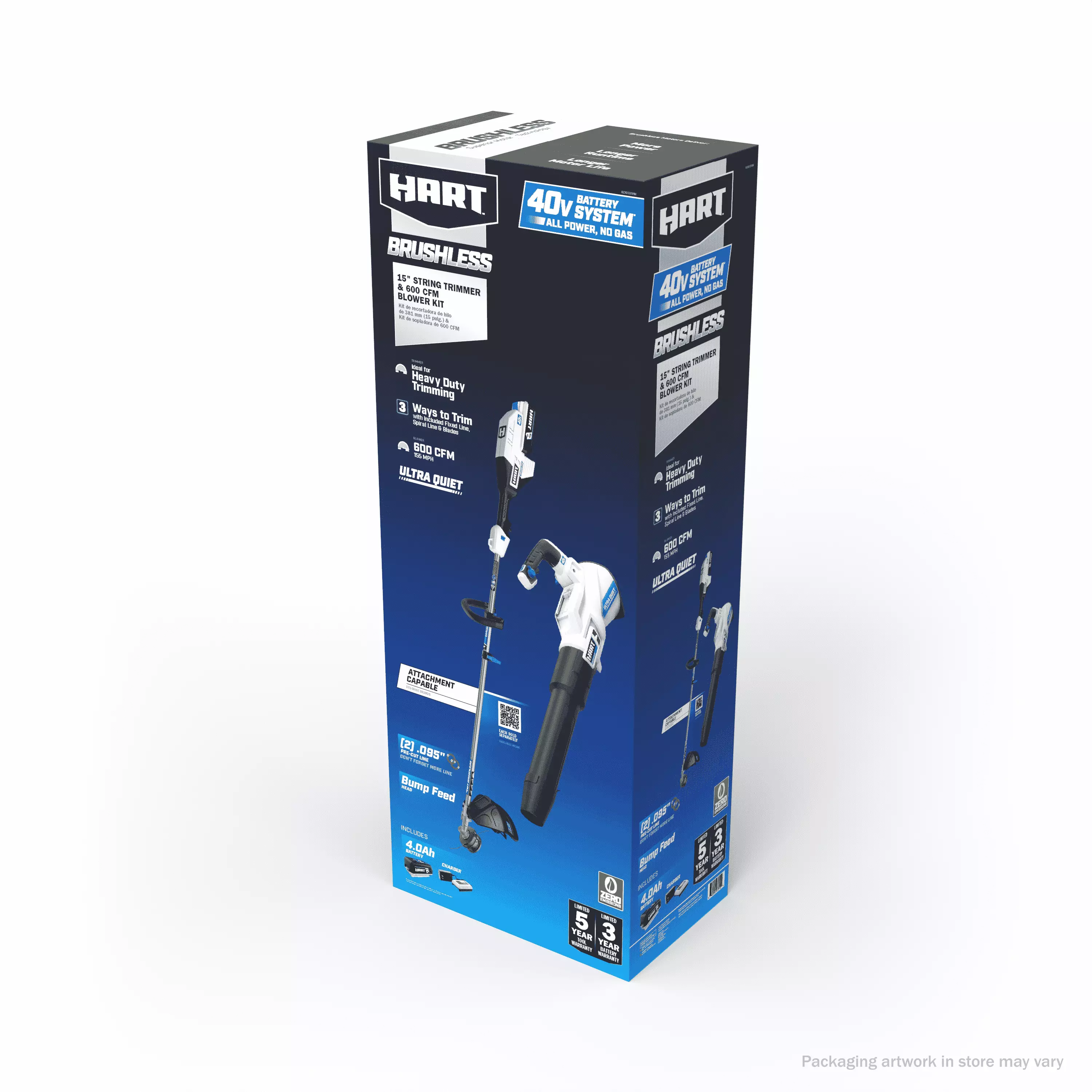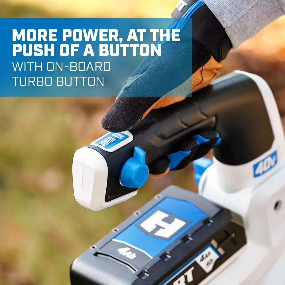 The 40V Brushless 15” String Trimmer & 600 CFM Blower Kit is the perfect combo for the most demanding yard work. The 40V Brushless 600 CFM Blower will make fall cleanup easy. This tool not only clears stubborn materials such as wet leaves. but also lifts and moves twigs. grass clippings. and more. And it does so quickly and efficiently. The turbo fan design provides 600 CFM and 155 MPH of maximum clearing power. while the variable speed trigger gives you total control. Lightweight. compact design provides the ultimate user comfort during extended periods of use. And the *Ultra-Quiet Technology* makes it our quietest blower to date. The 40V Brushless 15 String Trimmer gets the job done with plenty of power and runtime and offers a wide variety of compatible attachments. including a cultivator. blower. and edger (all sold separately). Just remove the trimmer head and hook up the attachment. it’s that easy! Ideal for heavy-duty trimming. this tool uses a 3-IN-1 Bump Feed for quick and easy reloads. and a .095 line to cut a 13-15 cutting swath for a variety of cuts. The included 40V 4.0Ah battery is compatible with all HART 40V tools.