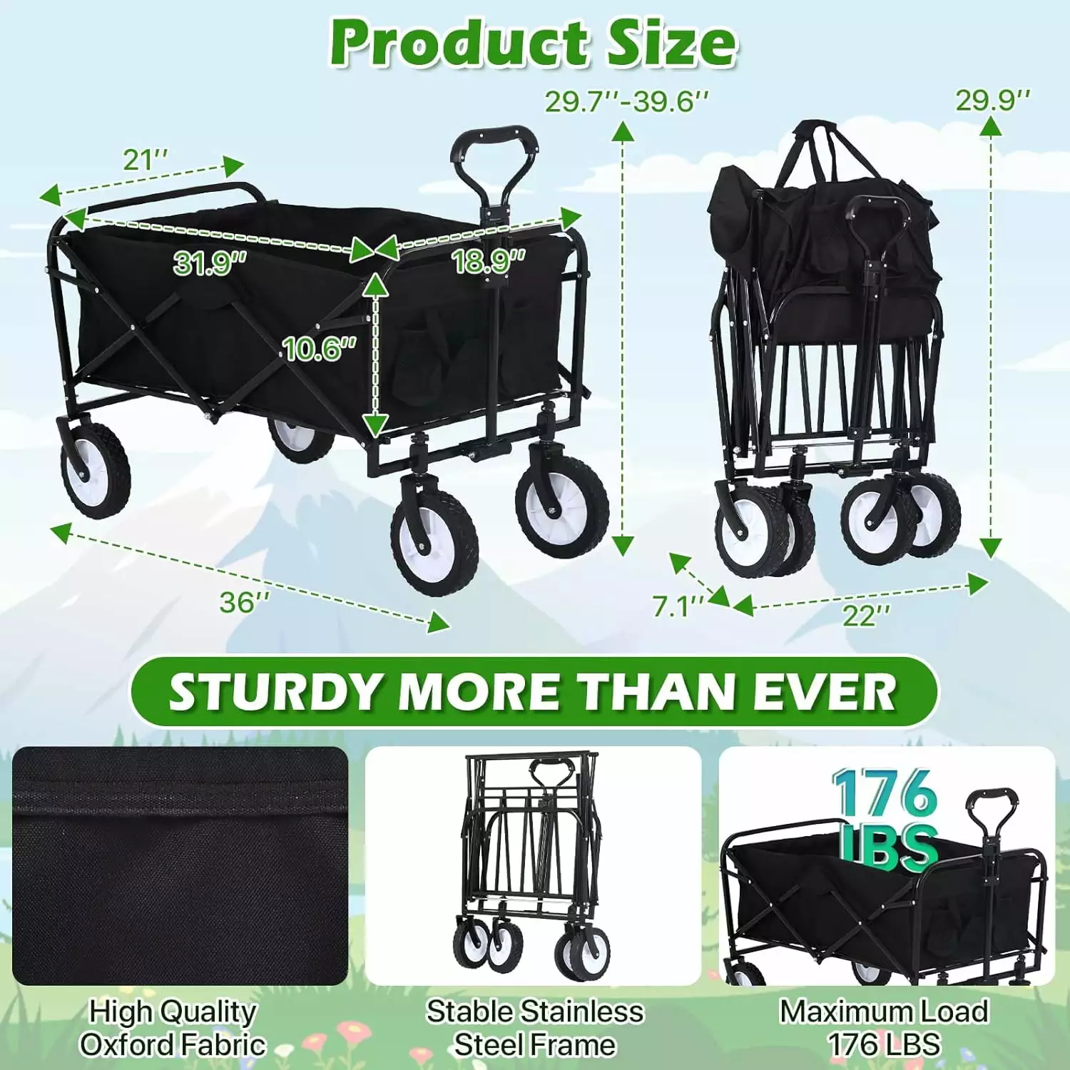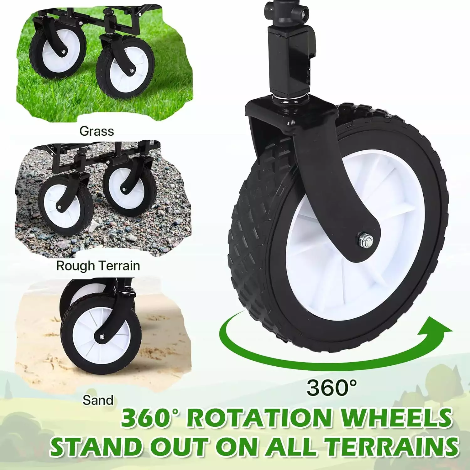 - ??Adjustable Handle & 360??Wheels??Built-in adjustable handle. can be smoothly rotated. you can adjust the height you want; handle with a joint lock. will not fall off. This garden wagon cart is equipped with large all-terrain wheels to ensure smooth pulling and easy transport over a variety of surfaces. Included are 360-degree front wheels allowing you to control the folding utility wagon cart and navigate the terrain with ease