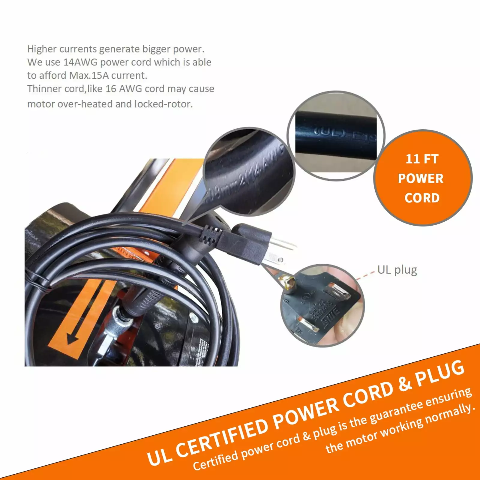 - {Safe & Reliability}: The motor is UL listed and produced in full copper wire. 14AWG power supplying cord (smaller number representing bigger cross-section cord) and Max.15Amps current. ETL certified power cord and plug is equipped. GarLUGH splitter was designed in double-handed operation as UL/ETL safety regulation required.