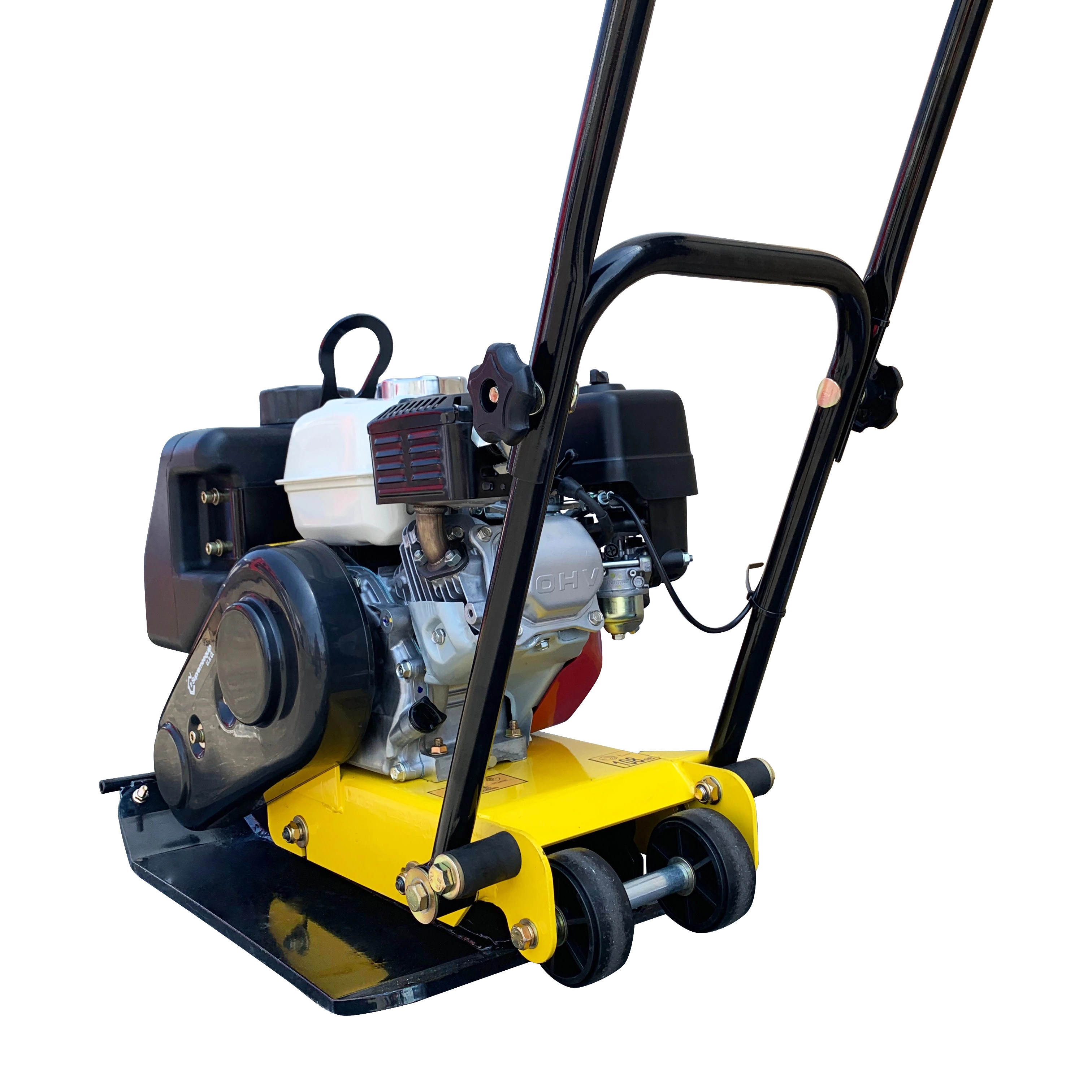 - The compactor features an adjustable control throttle. cushioned handlebars. engine-oil drain tube. and heavy-duty frame for lifting compactor for easy transportation