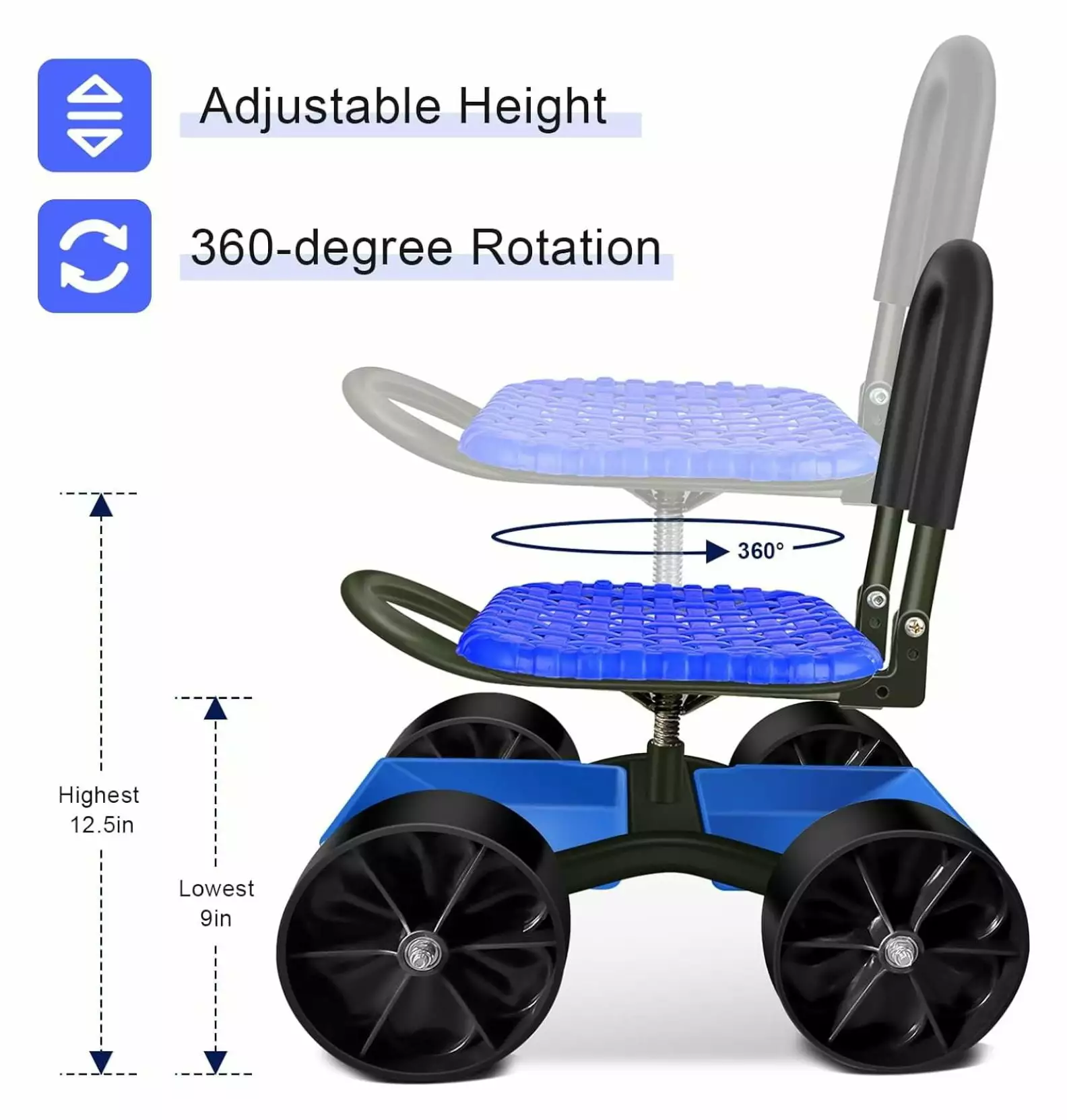 - Work as a garden cart with rotatable seat. it can save your knee and back. Seat height is adjustable from 9inch to 12.5inch.