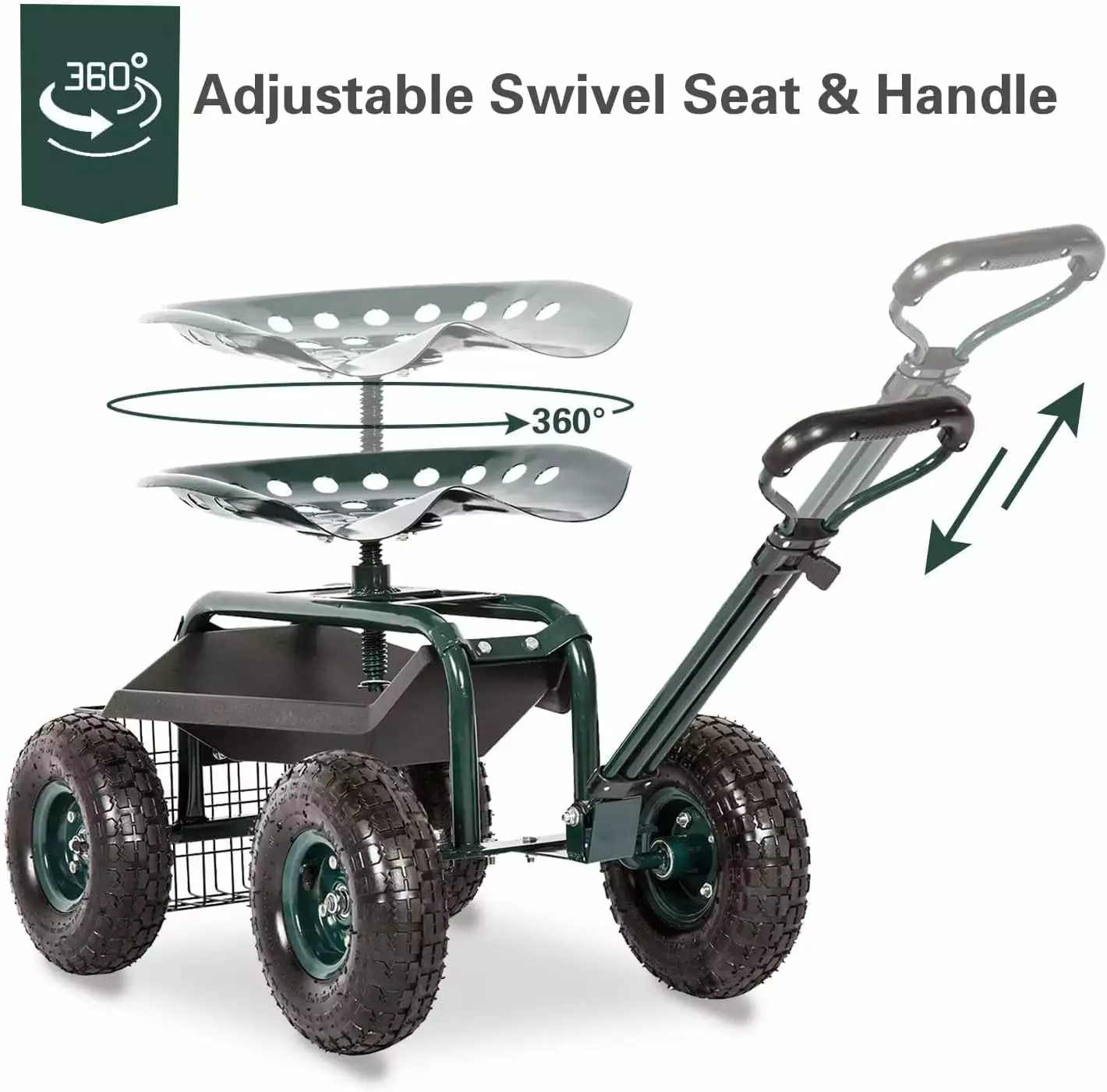 - Adjustable Cart: Kinbor garden cart seat is height adjustable to help you with different garden projects with the extendable steer handle moving your cart from one place to another easily.