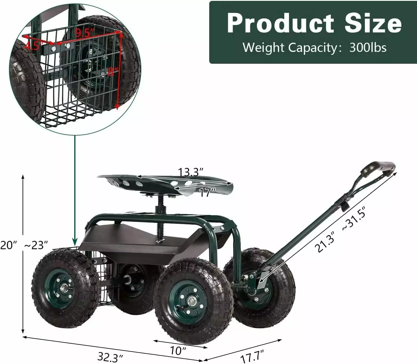 - Utility & Functional: Maximum tire pressure: 30 PSI. Versatile as it is. the rolling scooter equipped with tool tray and basket can be served as a stool seat when having a barbeque. a storage cart for garden supplies. a movable chair to help with car washing.