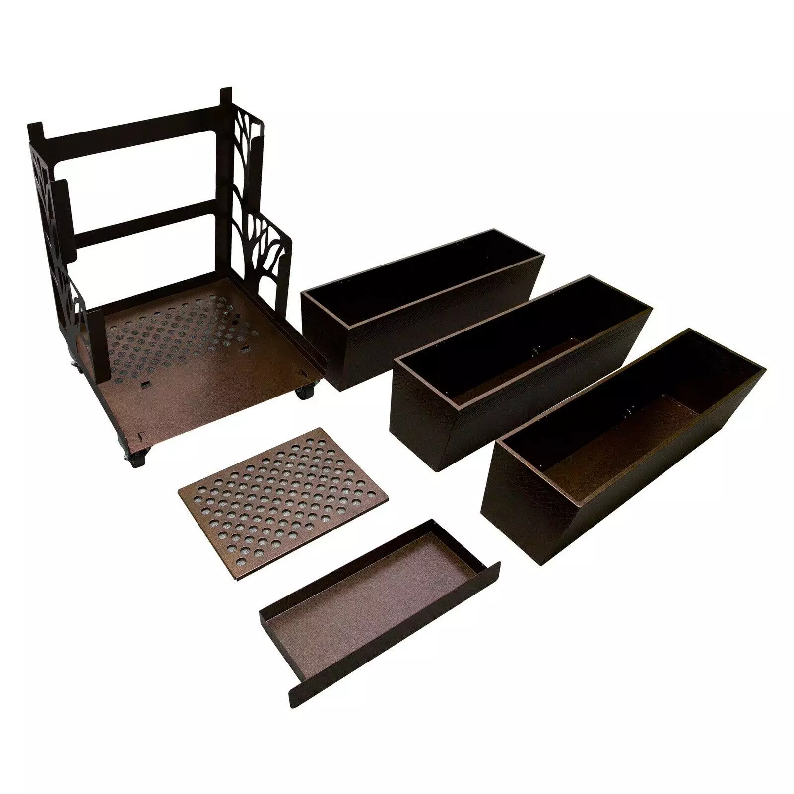 – SKU: MBGR002MBLG1001: Features: -Modern style. -3 Tiered design. -Mobile heavy duty locking casters. -Mobile for sun and shade. -Cascade watering. -Rear shelf storage. Material: -Metal. Distressed: -Yes. Color: -Copper. Shape: -Rectangular. Drainage Holes: -Yes. Water Resistant: -Yes. Warp Resistant: -Yes. Rot Resistant: -Yes. Number of Tiers: -3. Number of Feet: -4. Product Care: -Wipe clean with dry cloth. do not use strong liquid cleaners.. Material Details: -Powder-coated Steel. Dimensions: Overall Height – Top to Bottom: -39". Overall Width – Side to Side: -36". Overall Depth – Front to Back: -25". Overall Product Weight: -80 lbs.
